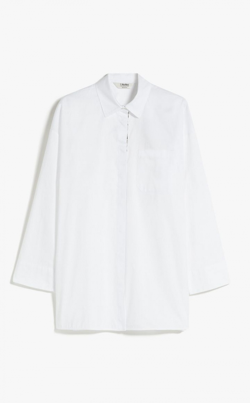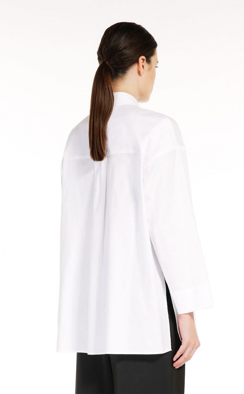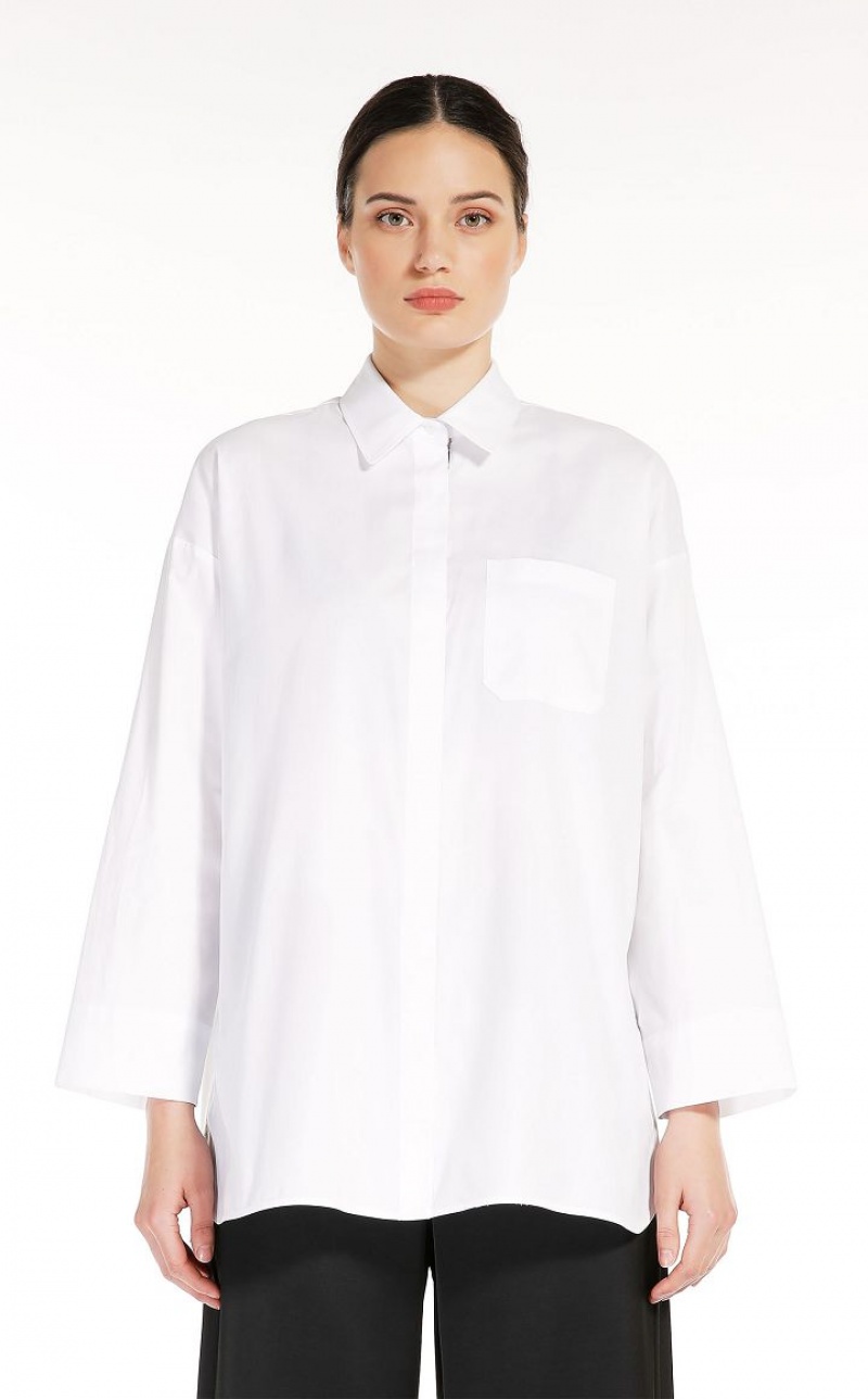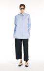 Shirt in fine pure cotton Oxford cloth featuring a small patch breast pocket and golden jacquard lamé detail, concealed beneath the front fastening. The comfort-fit model boasts side slits and a slightly high-low hem design. Length: 74 cm.
