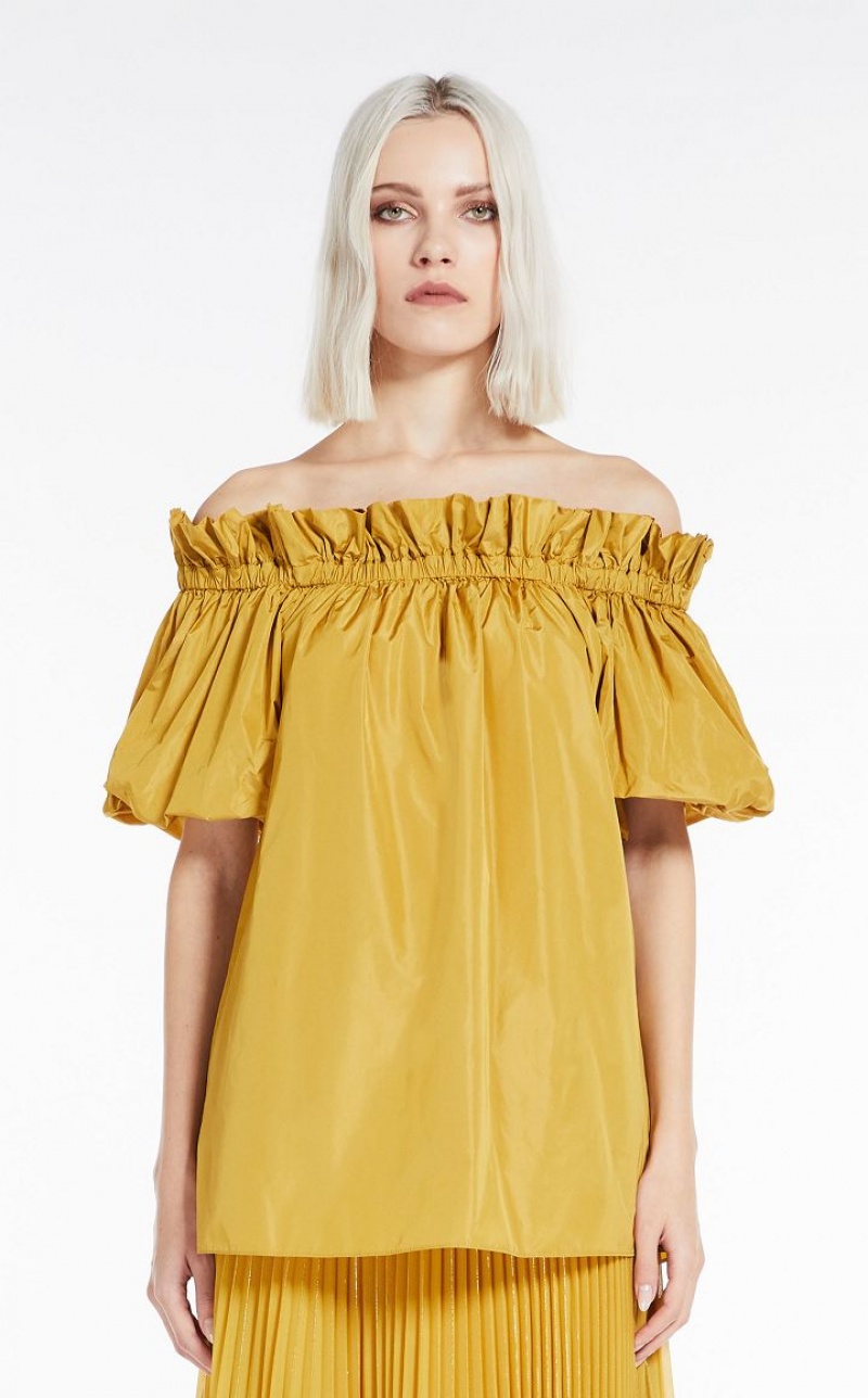 Cold-shoulder taffeta shirt featuring a distinctive balloon fit, in addition to elasticated cuff-embellished short balloon sleeves. Lined model. Length: 68 cm.