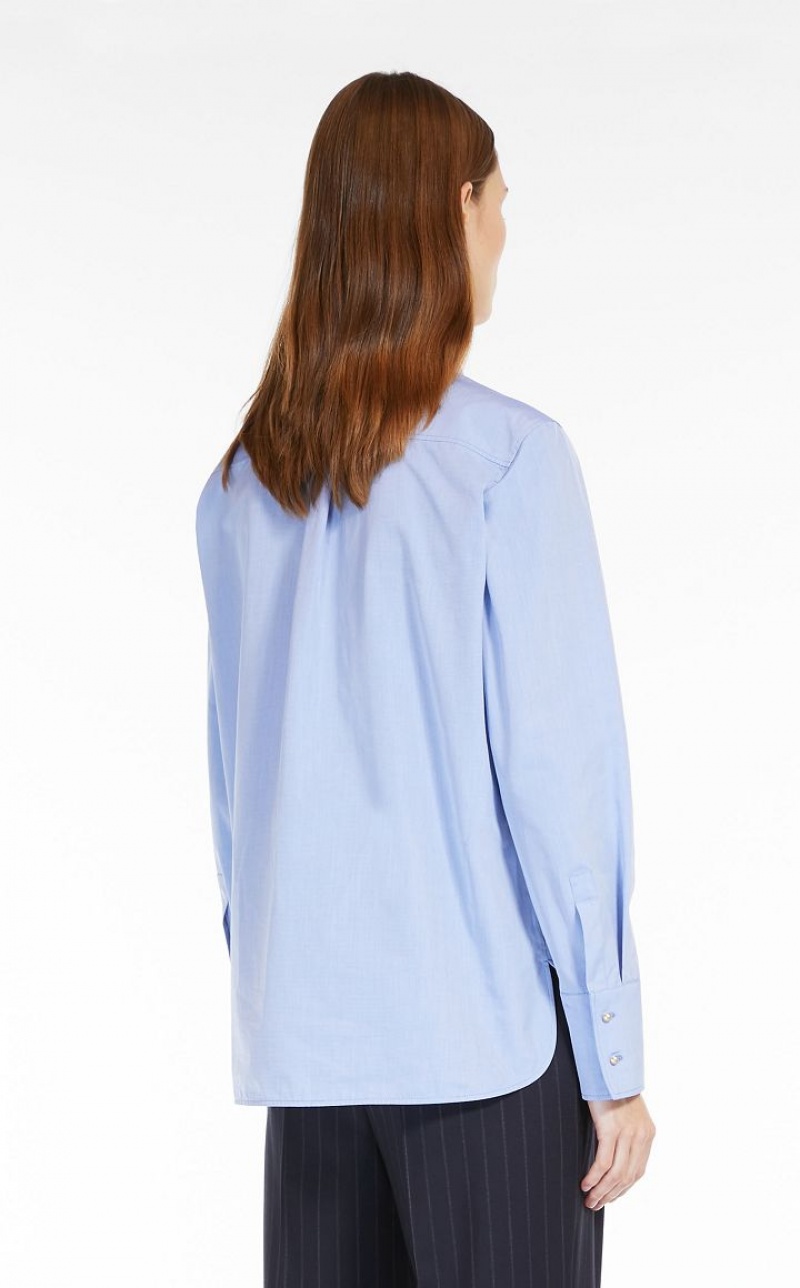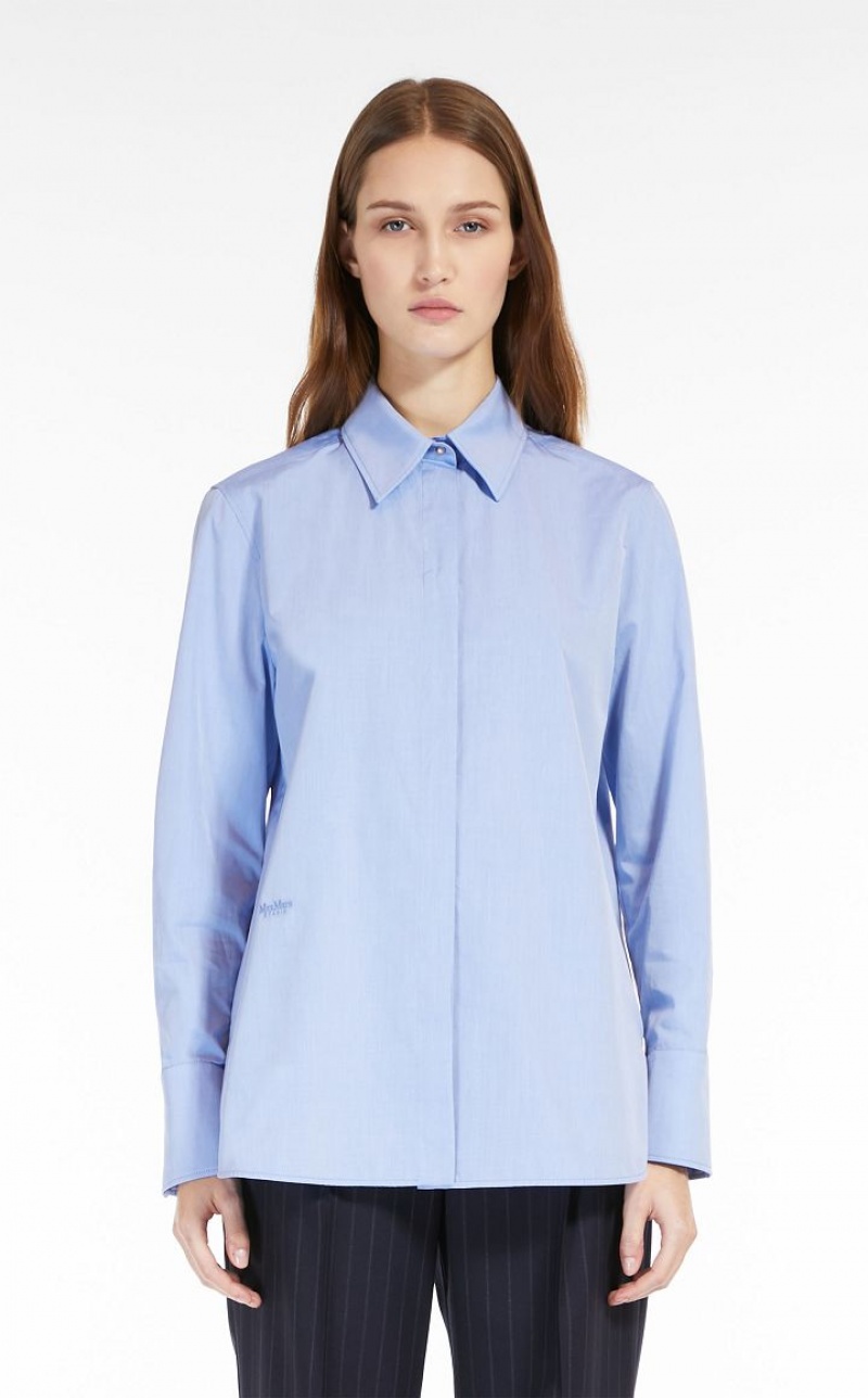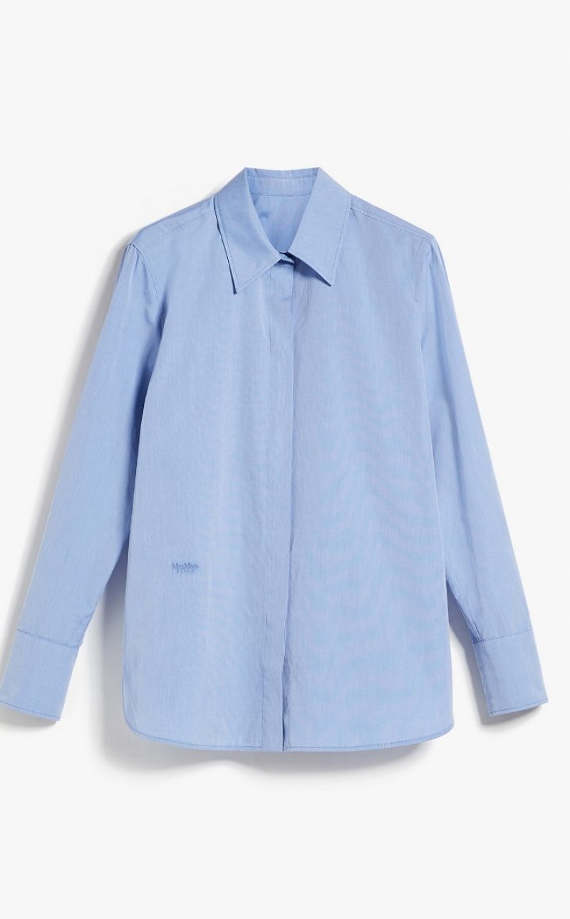 Boyfriend shirt in pure cotton chambray fabric featuring a pointed collar and long sleeves. The model boasts embroidered logo detail on the lower right-hand side, in addition to an asymmetrical high-low rounded hem design. Length: 70 cm.