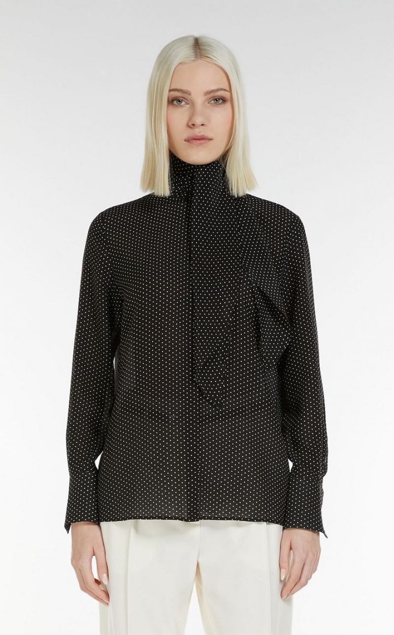 Shirt in luxurious printed, pure silk crêpe de Chine, featuring a foulard collar to tie in a bow and long sleeves with wide French cuffs. Concealed button fastening at the front. Length: 64 cm.
