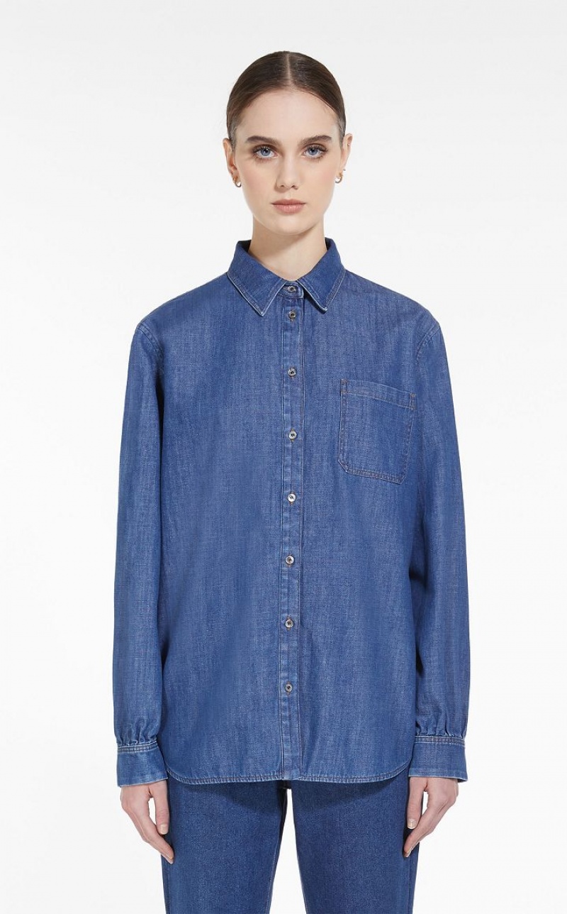 Loose-fit shirt in pure cotton denim. This style features a classic collar, patch breast pocket, rounded hem and long sleeves with cuff and button. Front fastening with mother-of-pearl buttons. Length: 70 cm.
