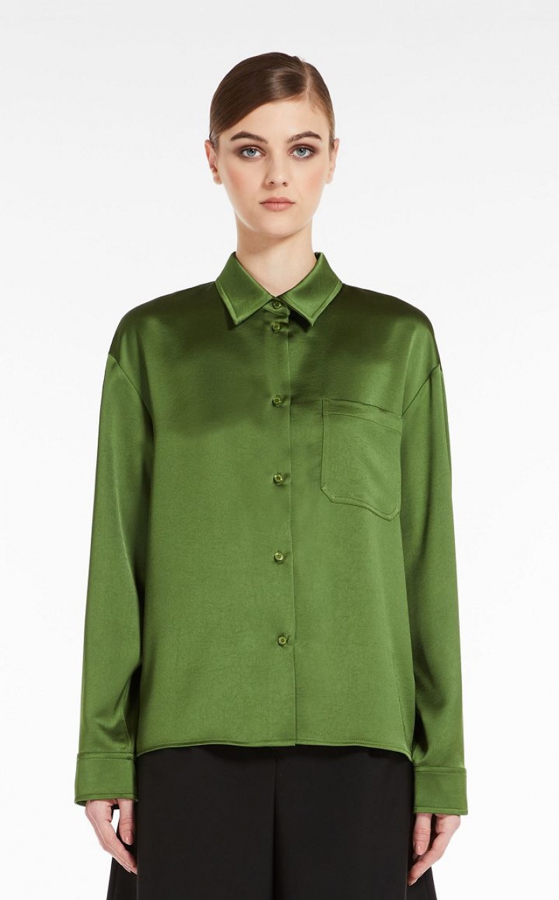 Shirt-style jacket in washed satin with a fluid fit. This style has a classic point collar, set-in sleeves with cuffs, patch breast pocket and side slits. Single-breasted fastening with buttons. Length: 62 cm.