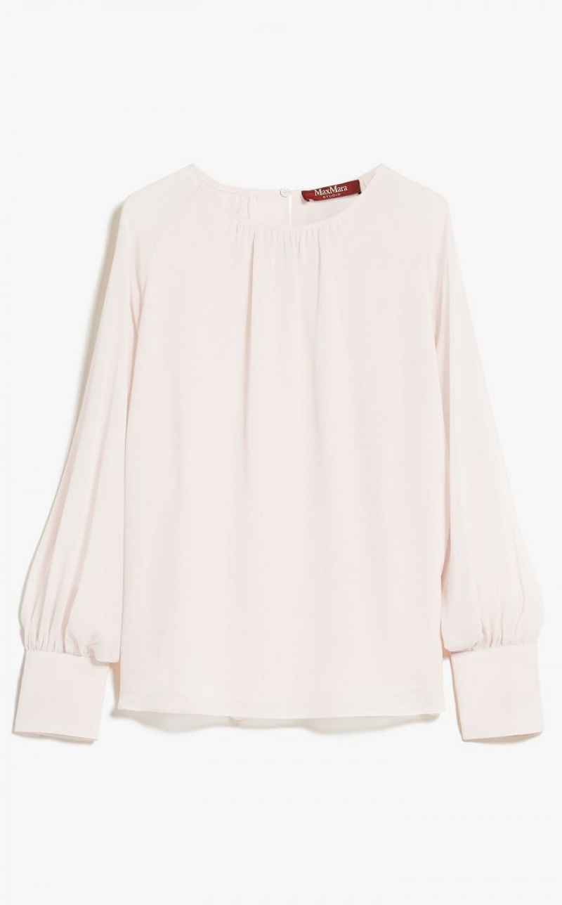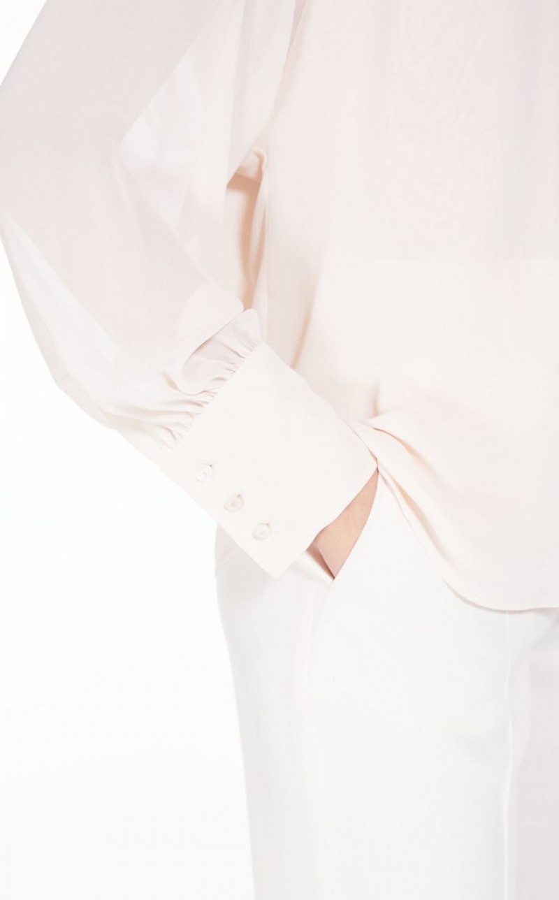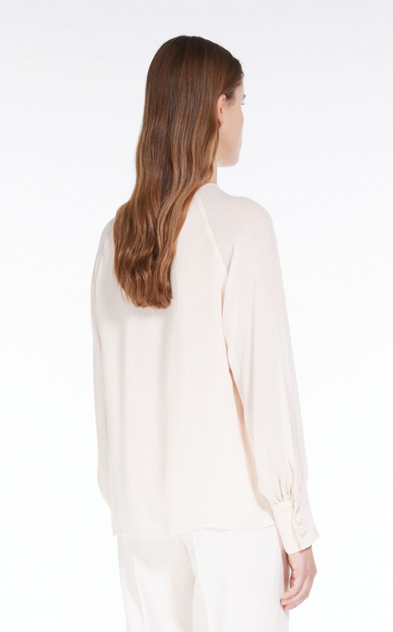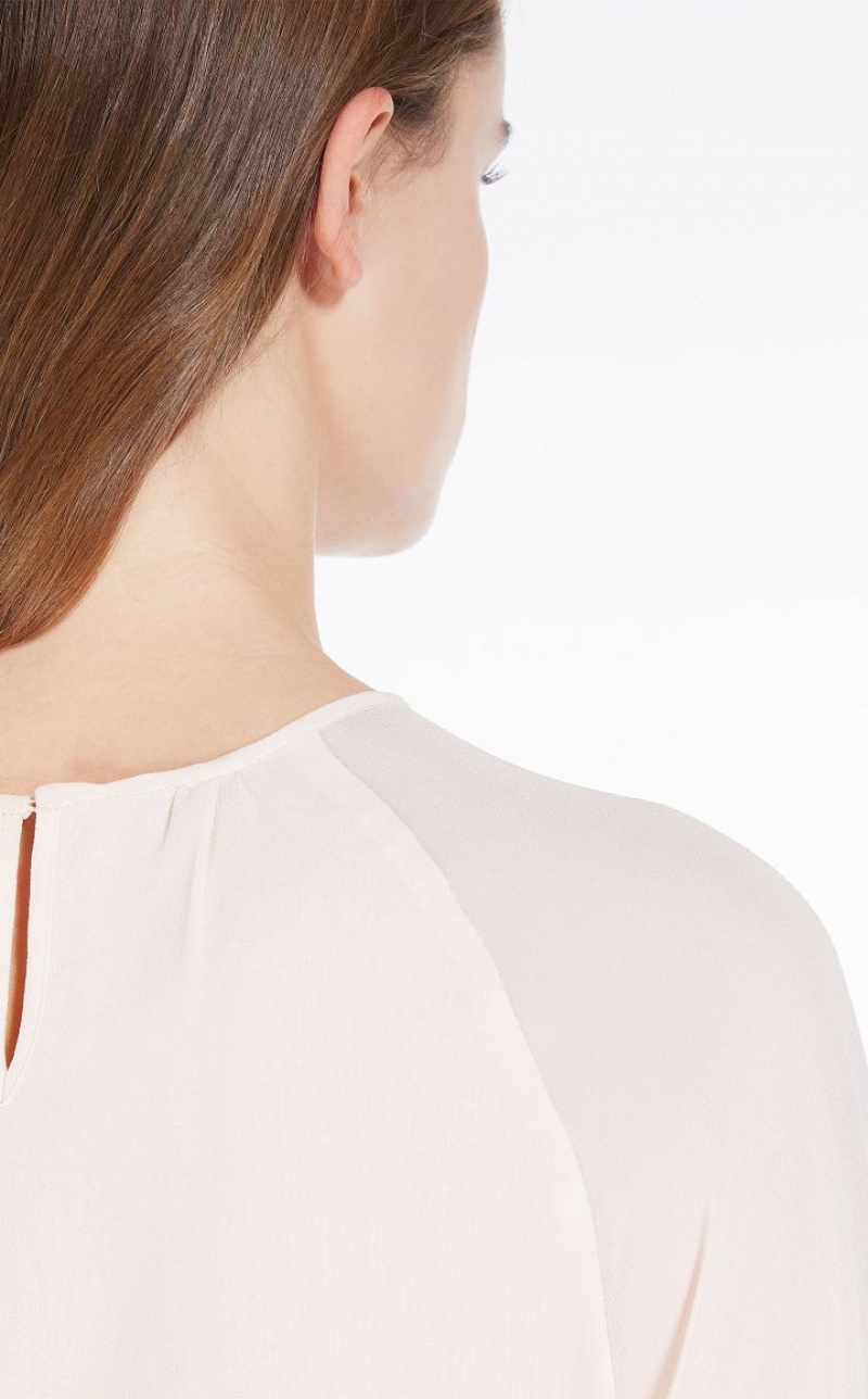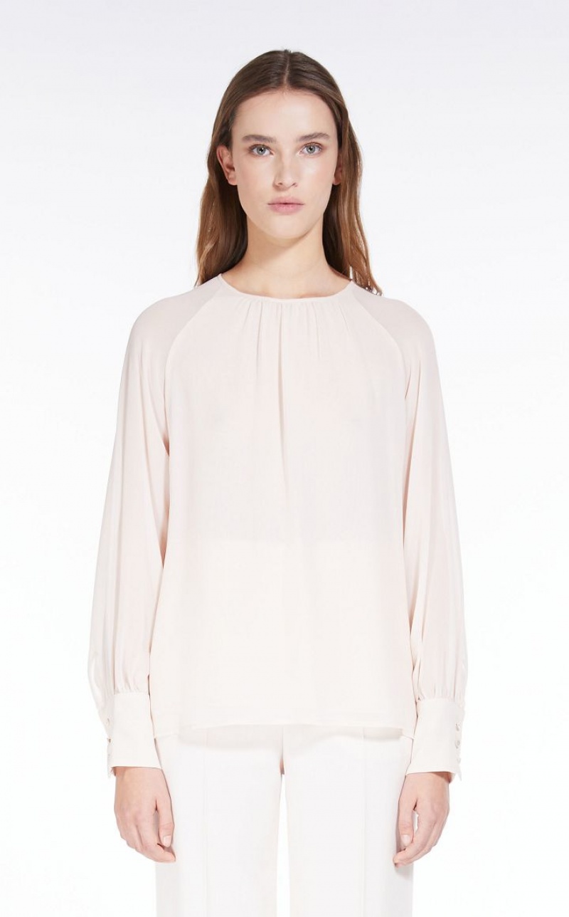 Crew-neck blouse in a playful pure silk georgette. The silhouette is straight and featured a delicate gathering at the neckline and wide raglan-cut sleeves with shirt cuffs. Teardrop opening at the back. Length: 64 cm.