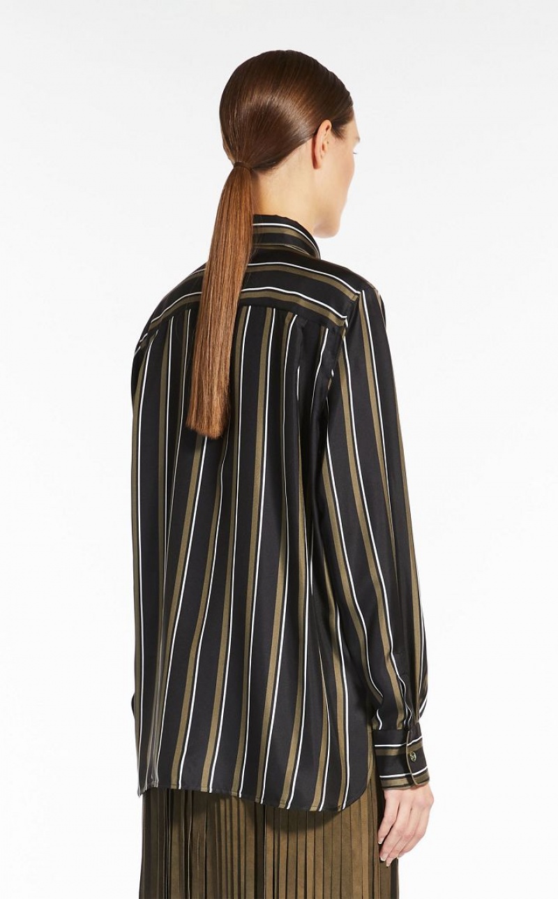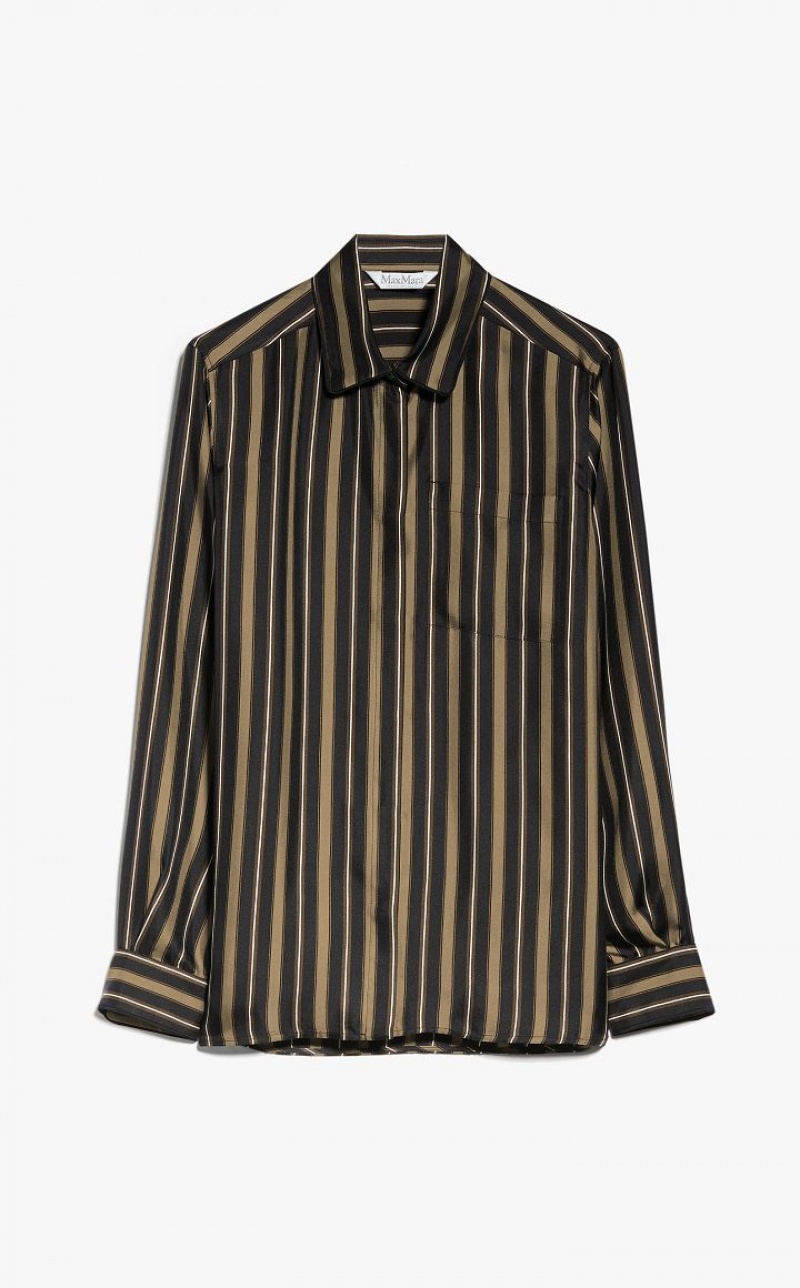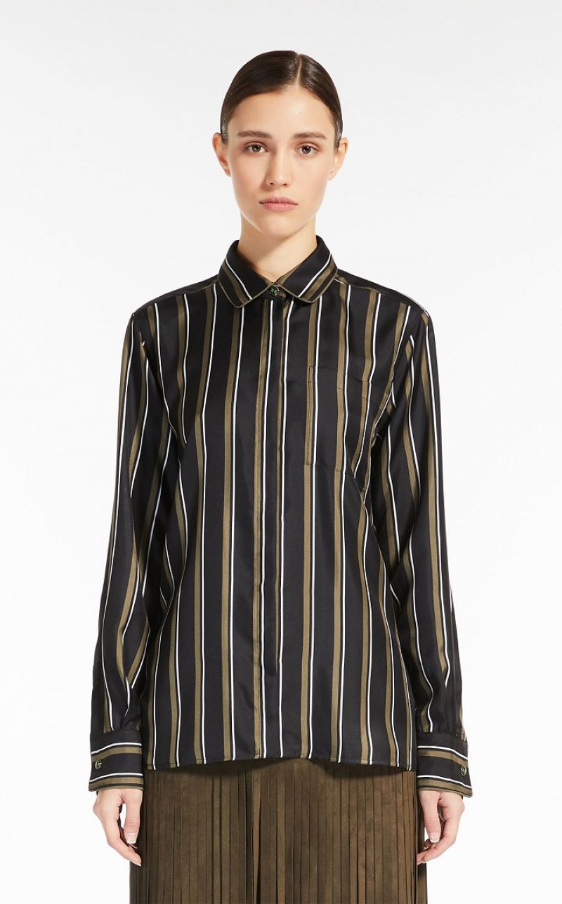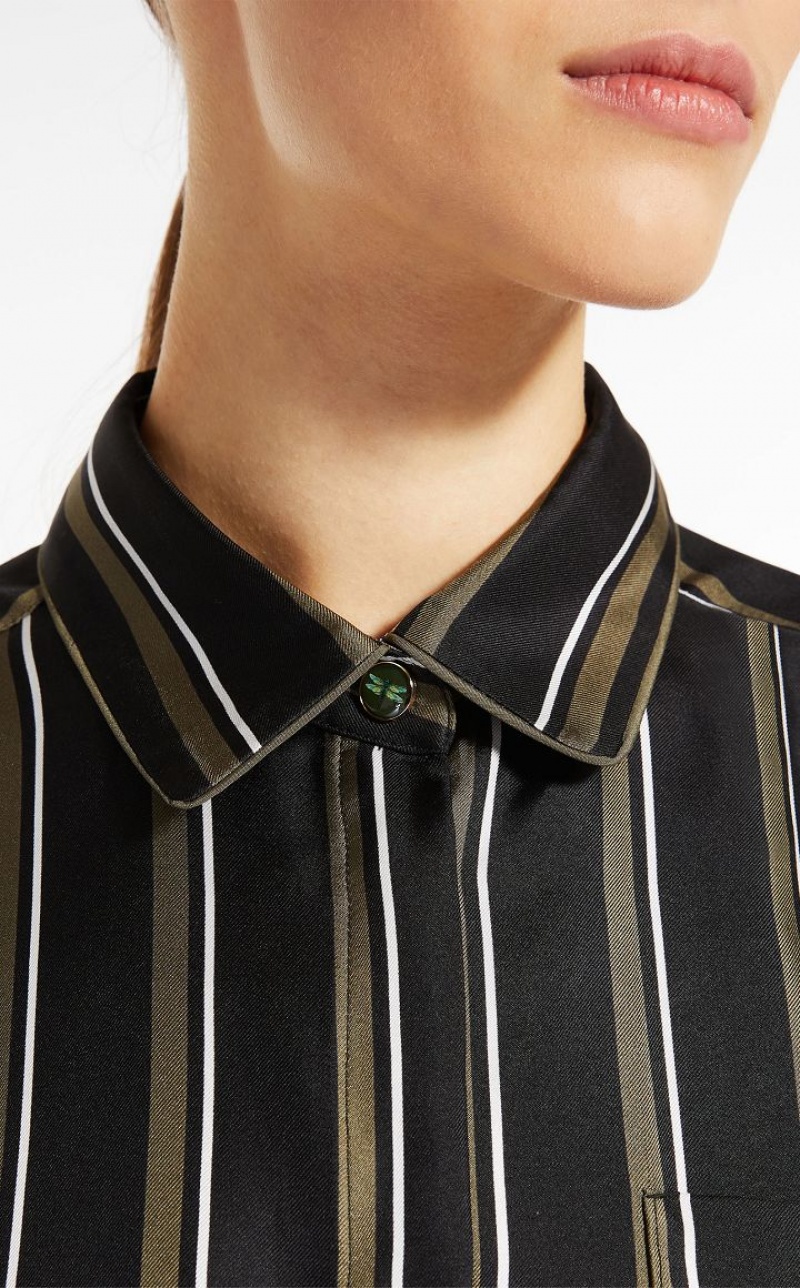 Long-sleeved shirt with a masculine cut, made of fine pure silk twill with an all-over printed striped pattern. Semi-fitted volume, with a small patch pocket on the chest, back yoke and small rounded side vents. Small rounded custom buttons. Concealed fastening. Length: 70 cm.