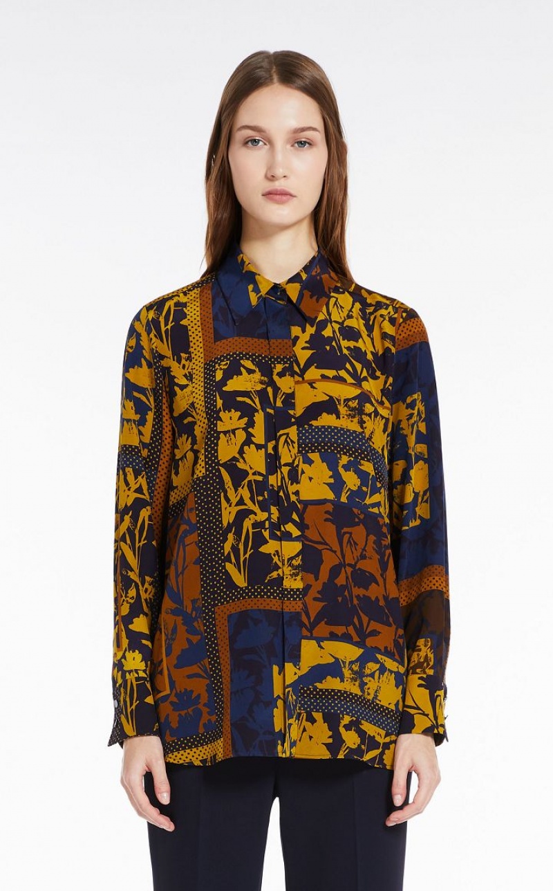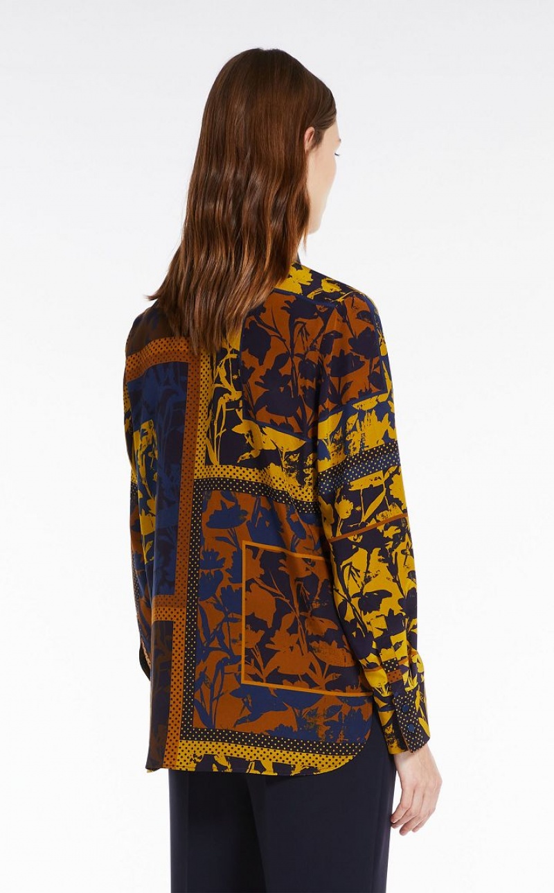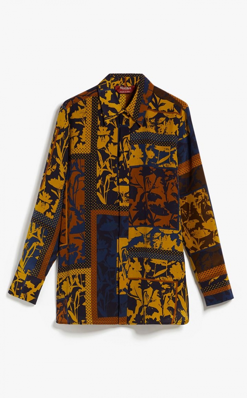 Classic shirt in printed pure silk crepe de chine fabric featuring a pointed collar and long sleeves. The design boasts an asymmetrical high-low rounded hem design. Concealed button placket. Length: 71 cm.