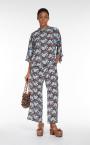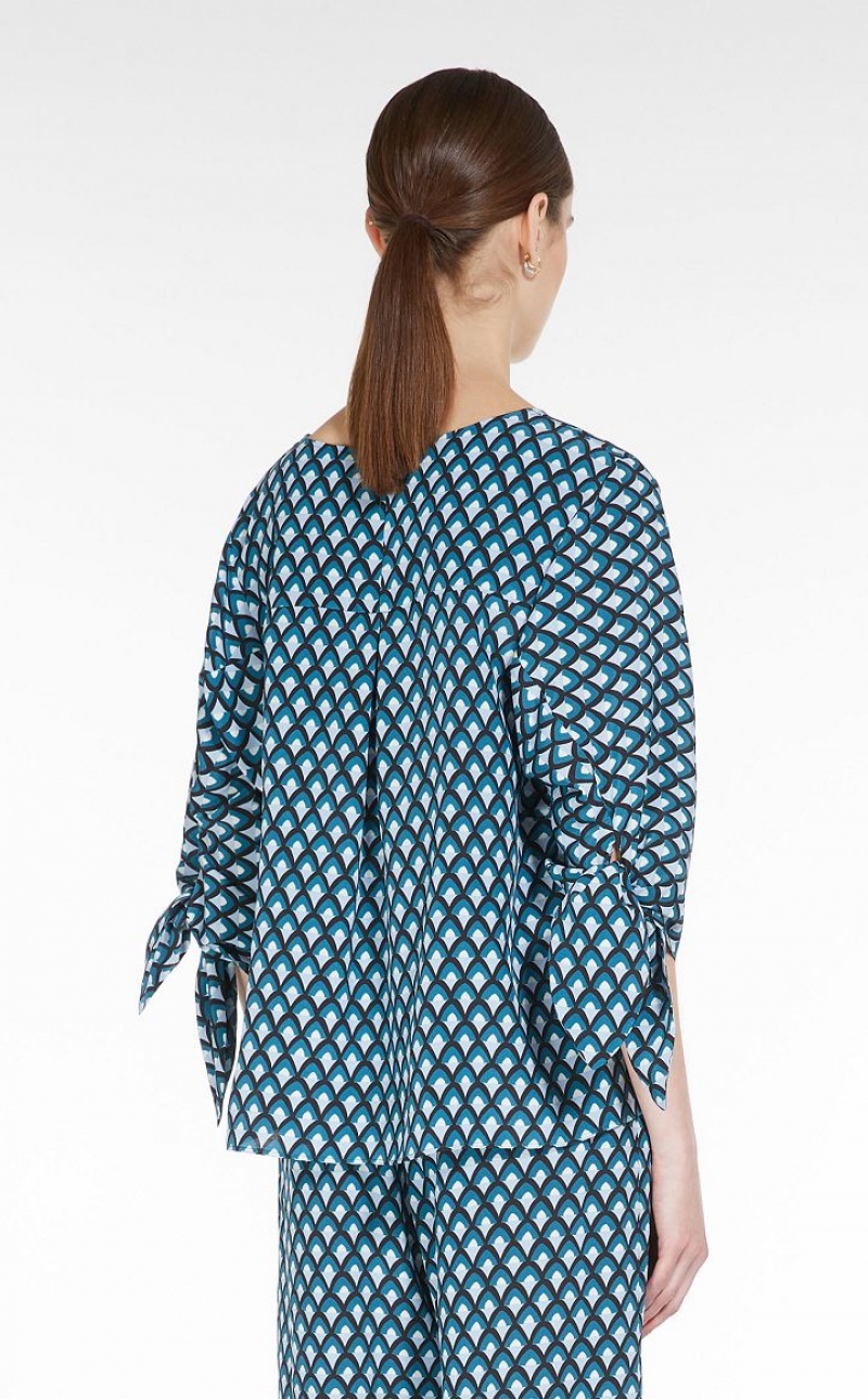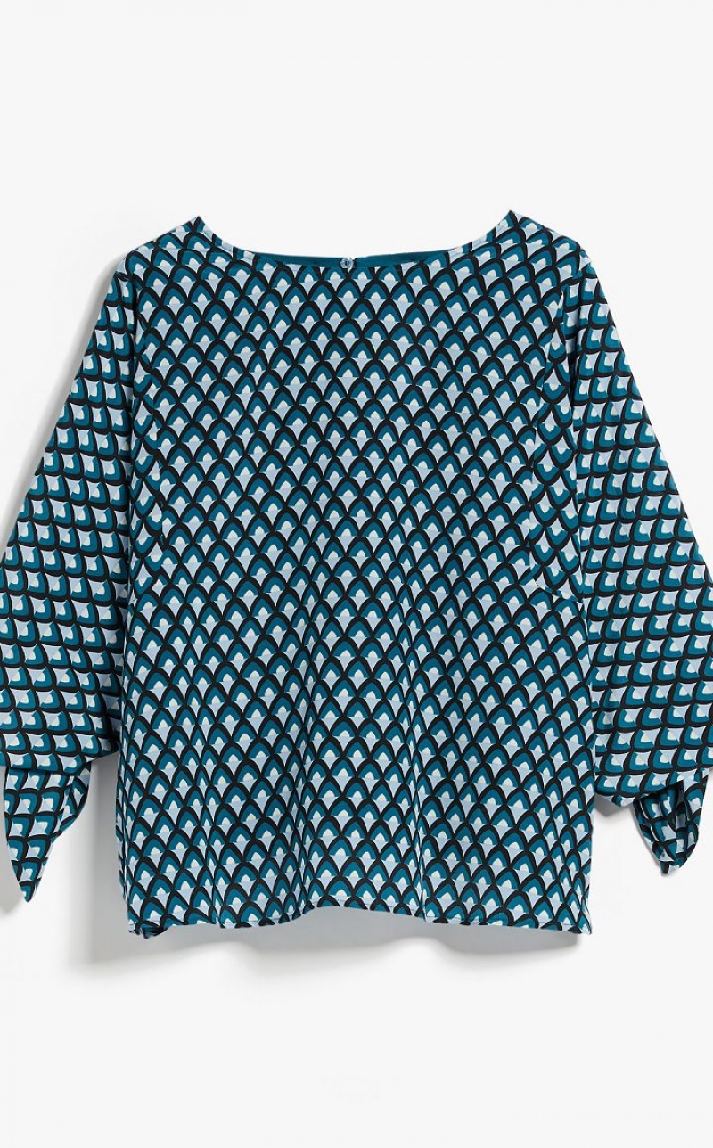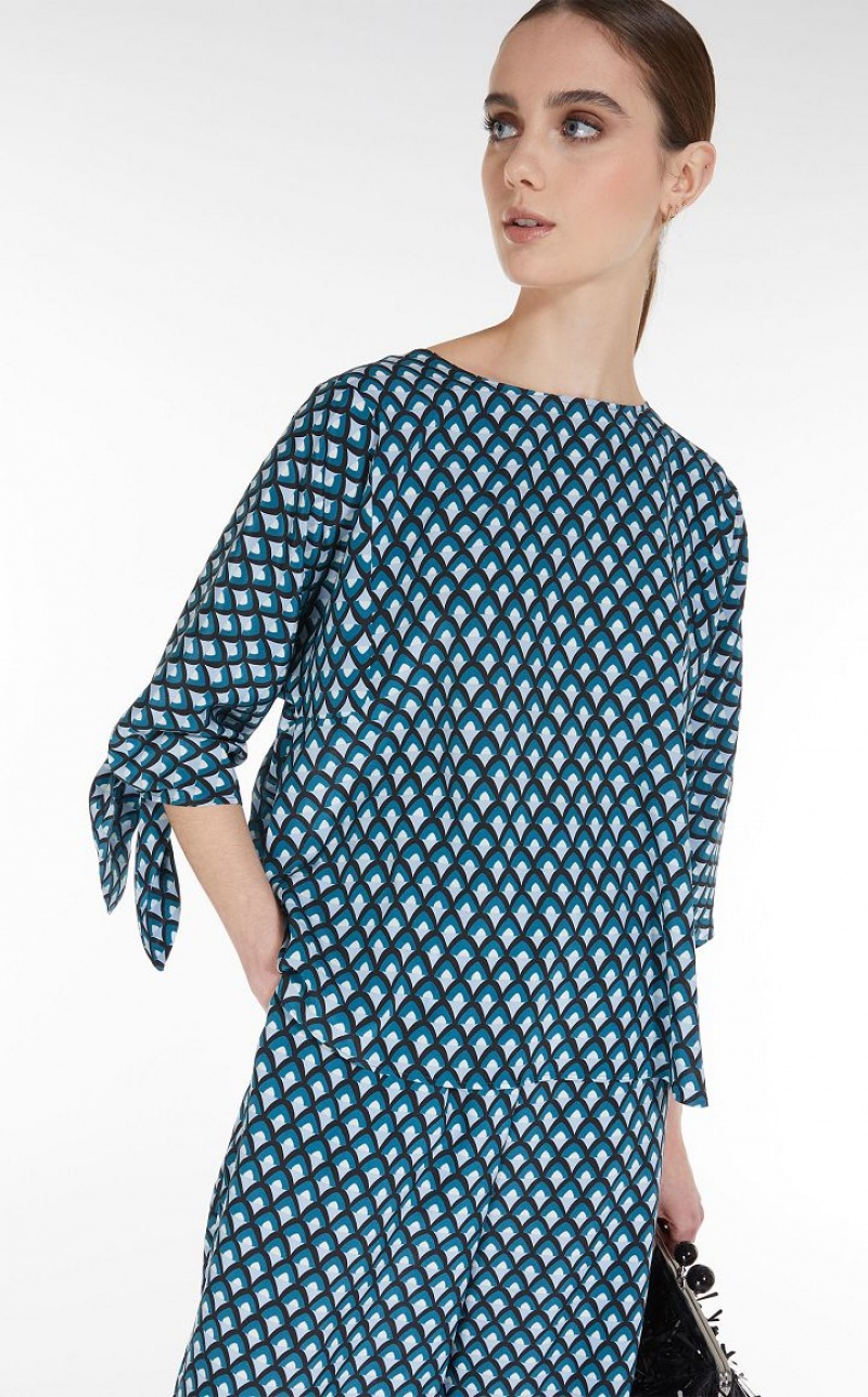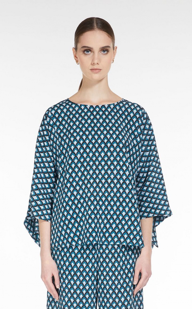 Round-neck blouse with a slightly flared line in luxe printed pure silk crepe de chine. This style has 3/4 sleeves with bow at the wrist. Teardrop fastening on the back with small button. Length: 58 cm.