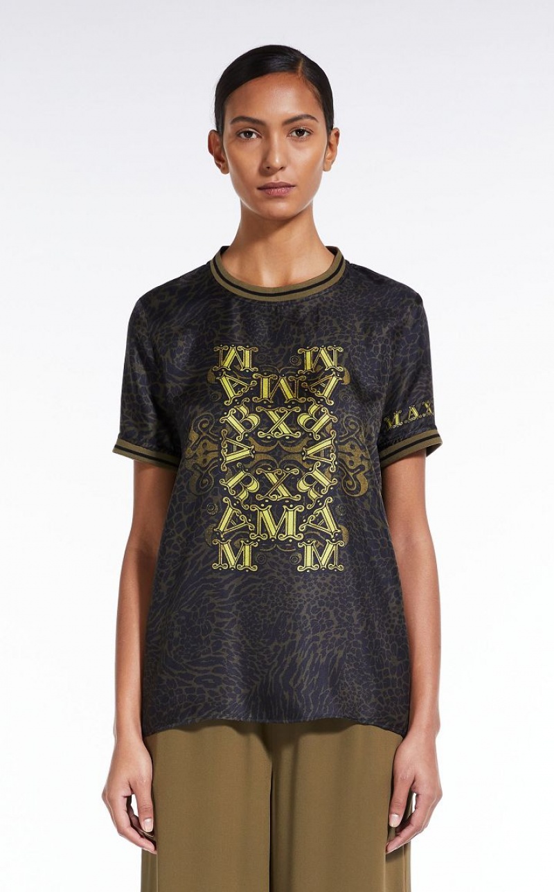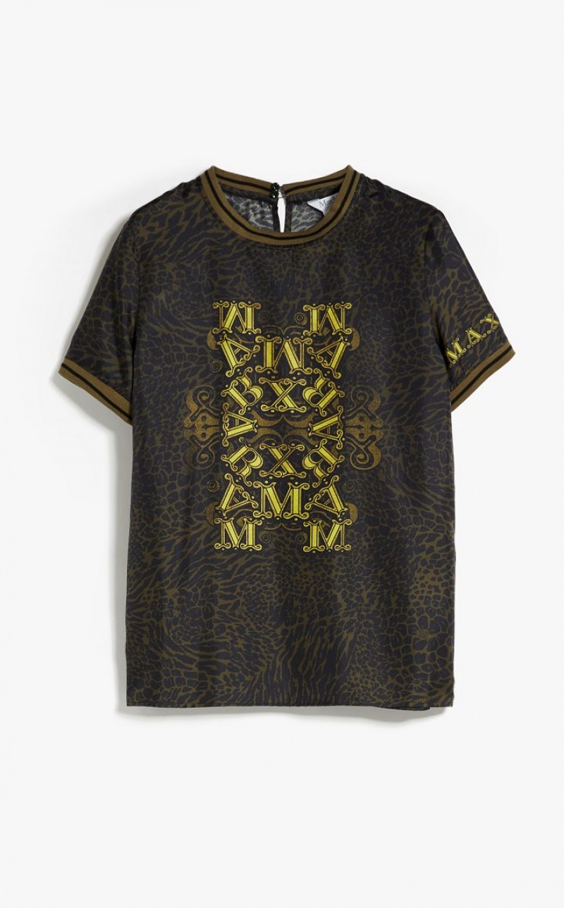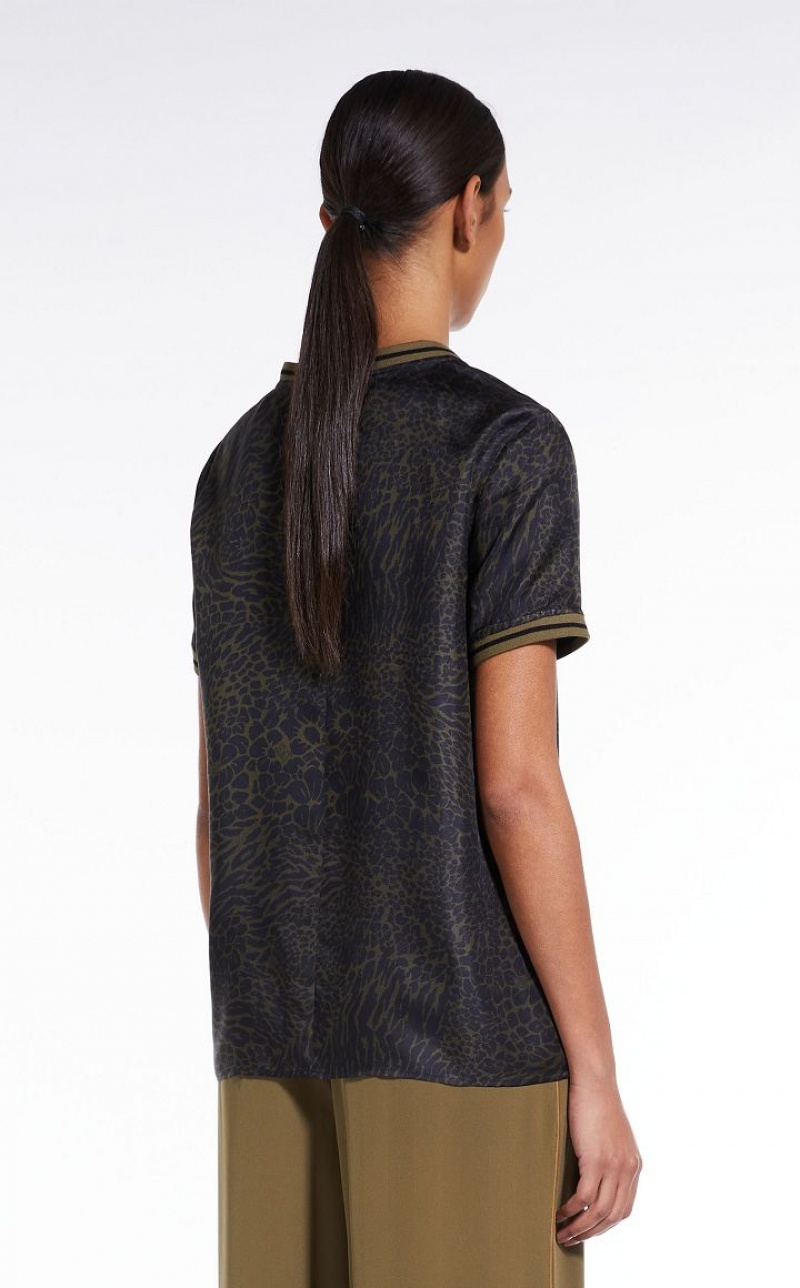 T-shirt blouse made of precious pure silk twill, with all-over animal print and monogram detail on the front. Short-sleeved style, finished with viscose yarn rib-knit collar and cuffs. Small teardrop opening with button at the back. Length: 65 cm.