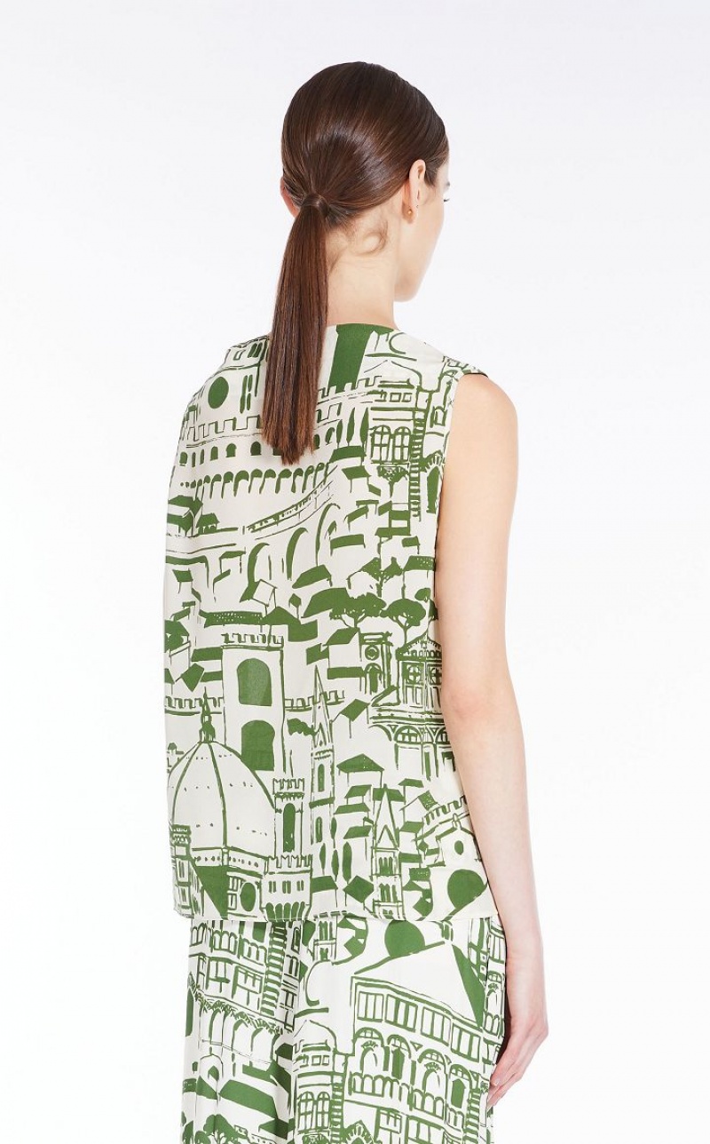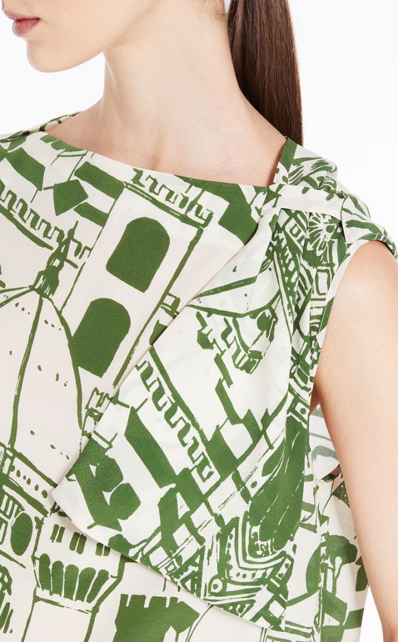Sleeveless top on luxe pure silk crepe de chine, with all-over print motif. The fluid silhouette and minimal design are enriched by a knot motif with soft draping on the left shoulder.