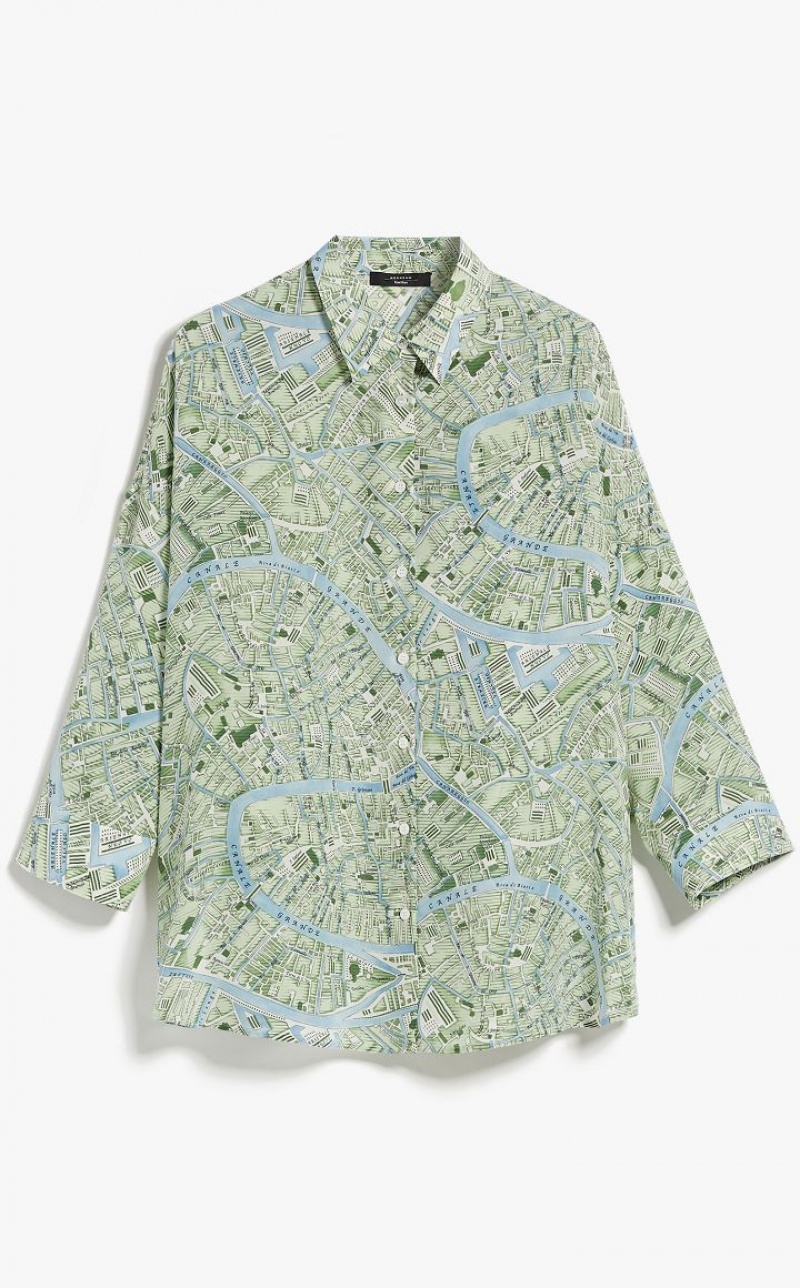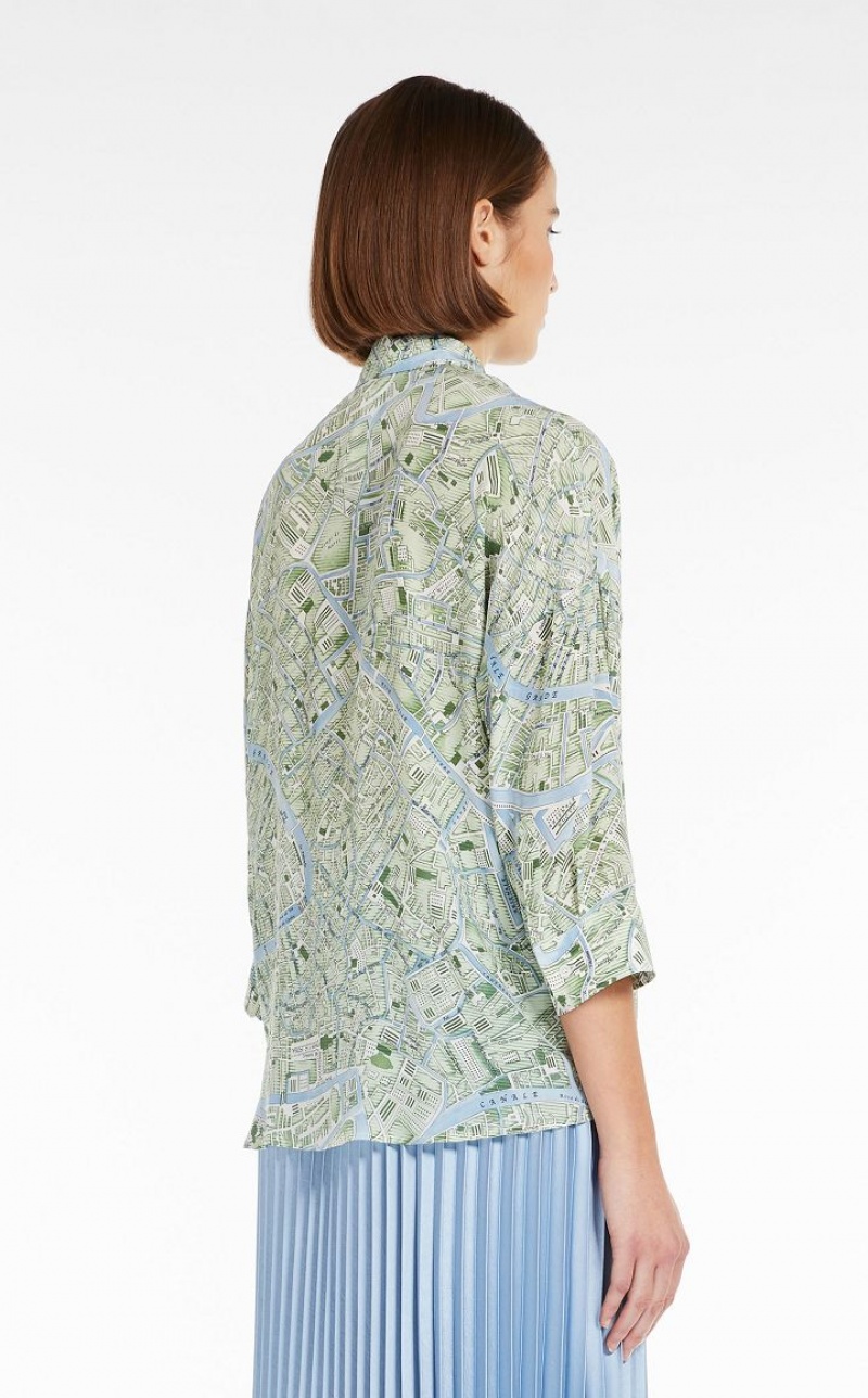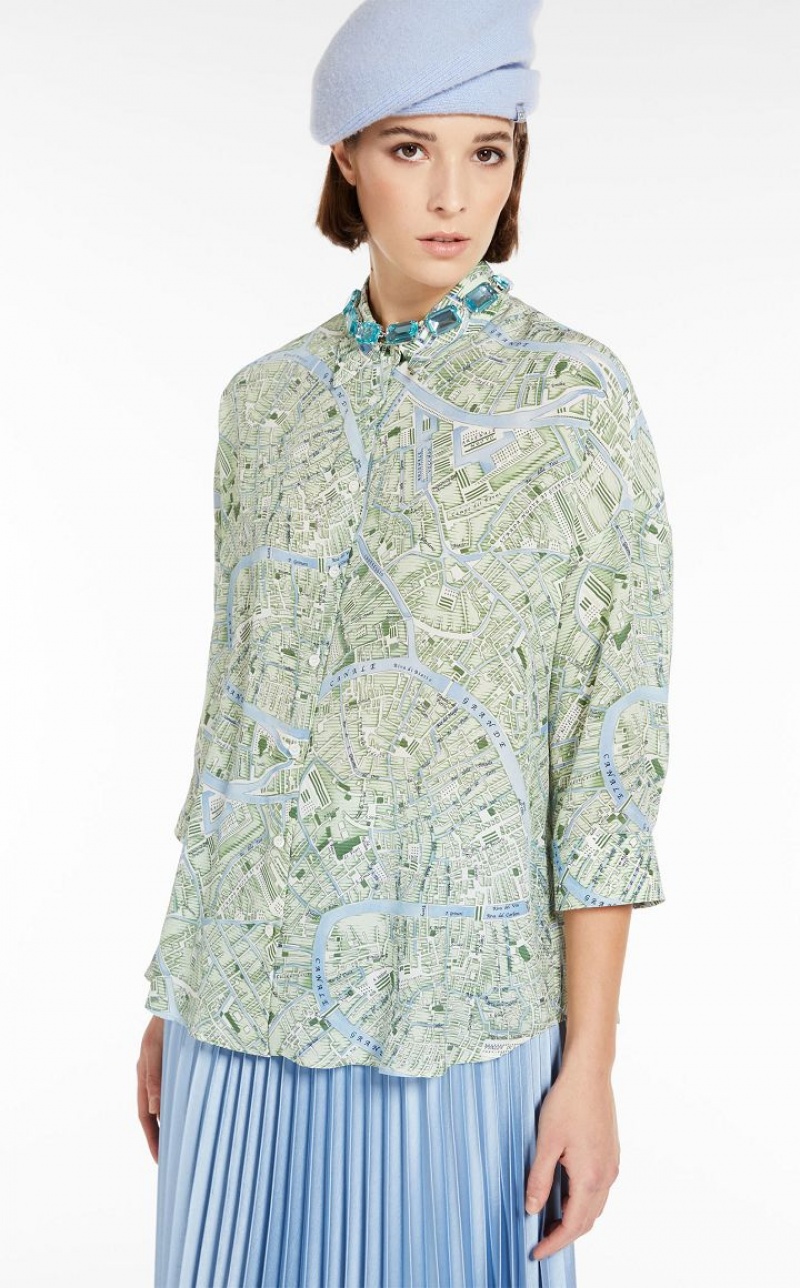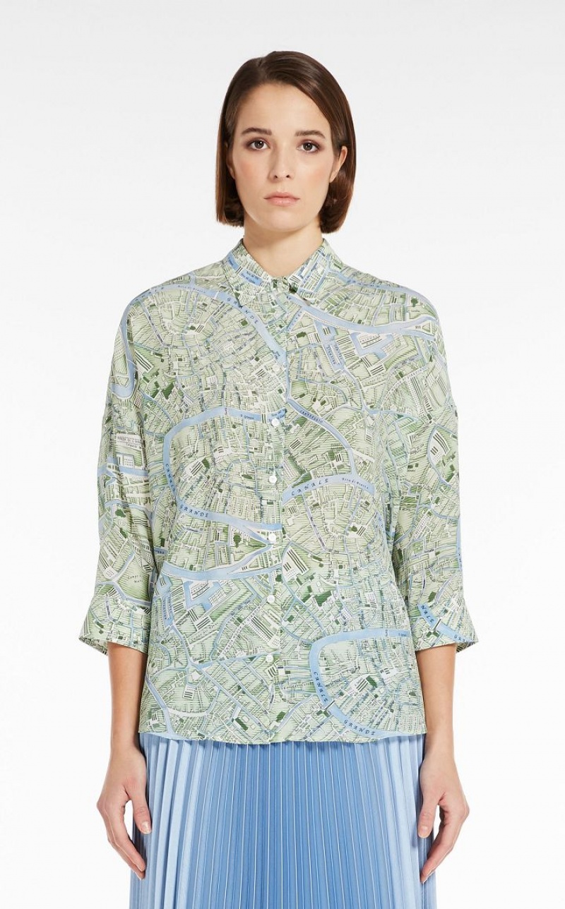 Shirt with a loose, slightly flared line in luxe pure silk crepe de chine with all-over print. This style features a classic collar, three-quarter sleeves and cuffs fastened with buttons. Front fastening with mother-of-pearl buttons. Length: 68 cm.
