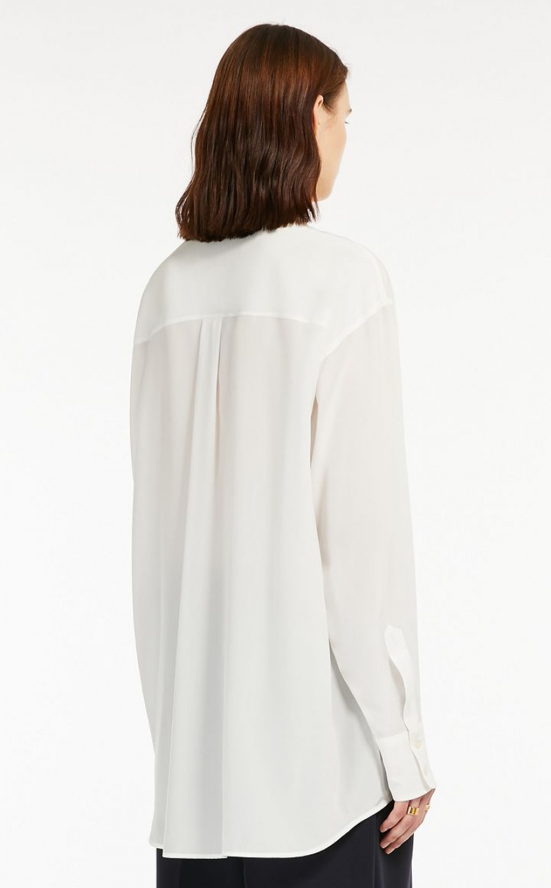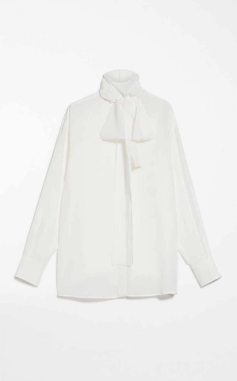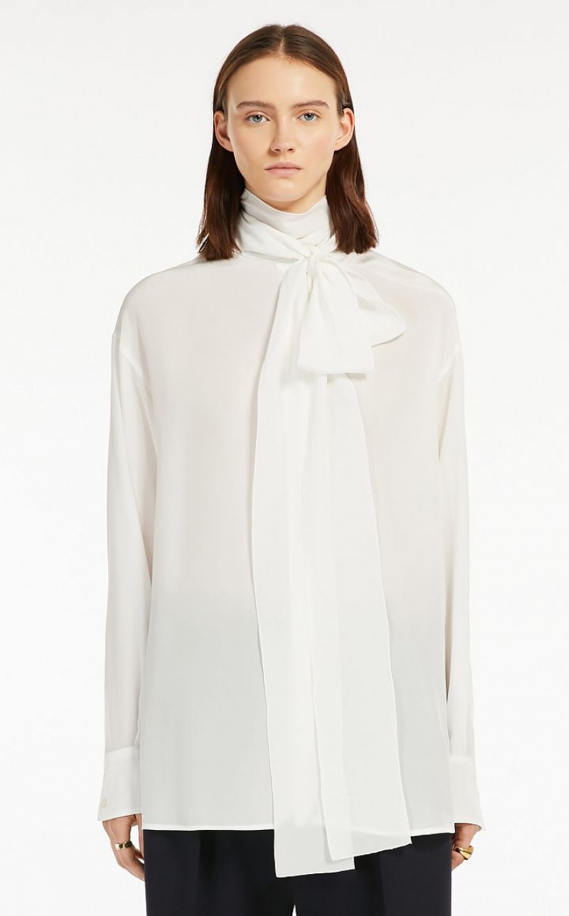 Pure silk crepe de chine blouse featuring a straight-fit bodice and dropped shoulders. The feminine, relaxed-fit model boasts a long sash at the neckline which can be tied at will. The shirt-style sleeves are defined by the placket and button detail.