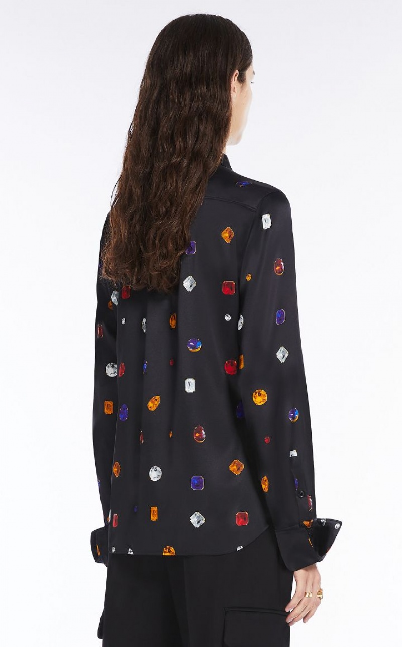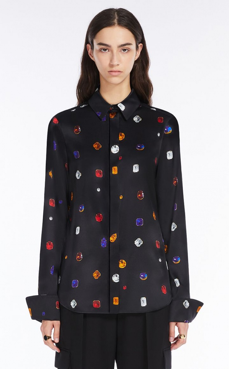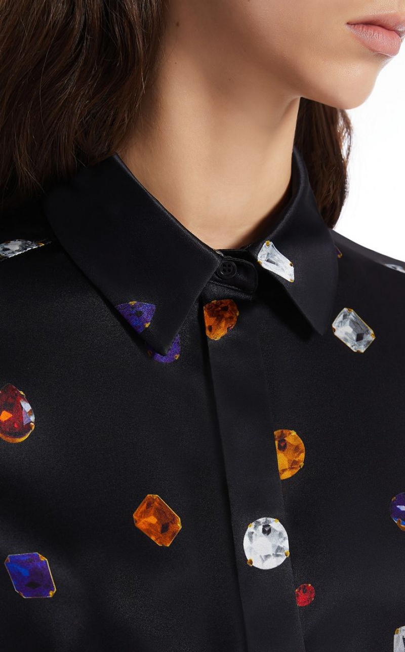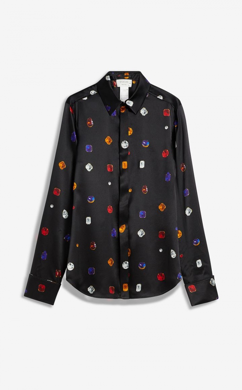 Shirt in pure stretch silk satin, decorated with a gem patterned print. Straight fit, with hidden buttoning, stand and fall collar, back yoke with box pleat. The double-button cuffs can be worn turned back or long and feature a menswear-inspired cufflink closure.