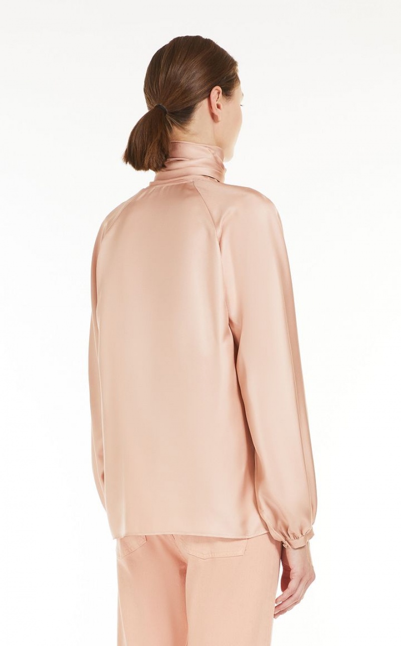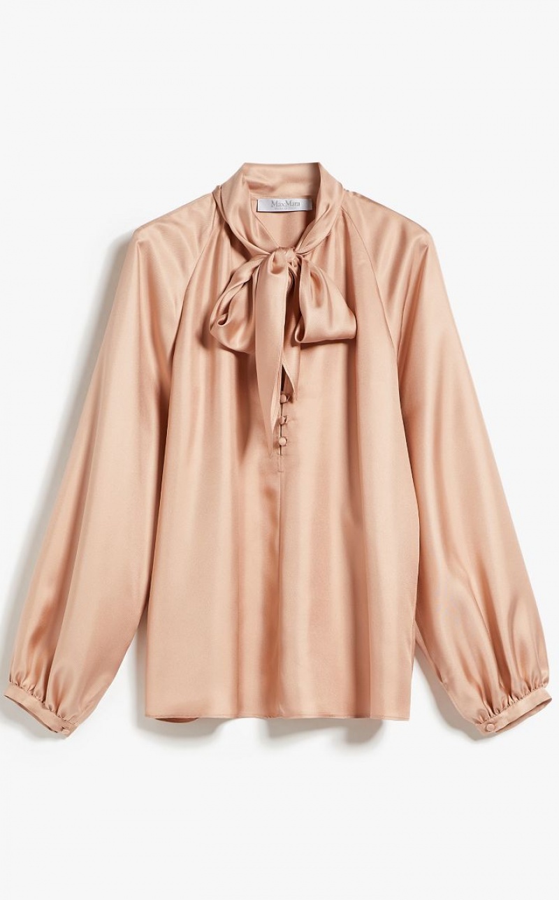 Feminine shirt with foulard collar made of fine pure silk twill. Soft-volume style with a V neck, small round covered buttons and wide raglan sleeves with buttoned cuffs. Length: 65 cm.