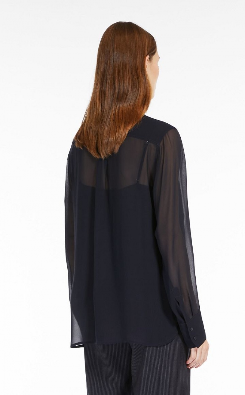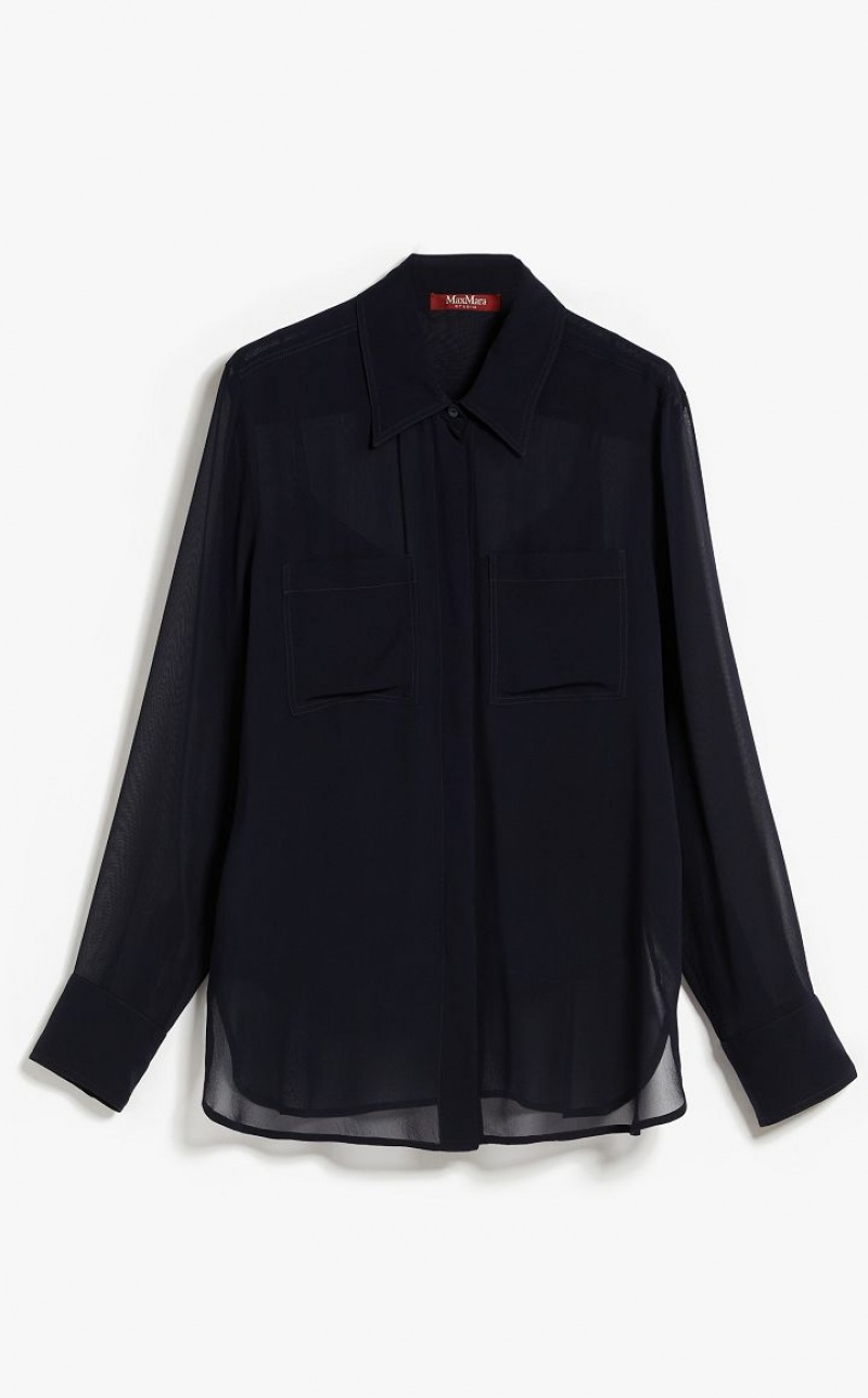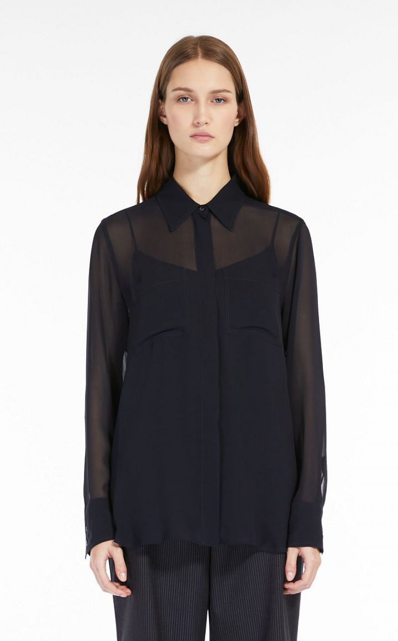 Masculine-inspired shirt crafted in delicate pure silk georgette, featuring a pointed collar, two patch pockets and long sleeves with cuffs. Featuring soft and fluid lines, the garment is completed with lateral vents and a slightly rounded hem. Matching slip top. Concealed fastening. Length: 70 cm.