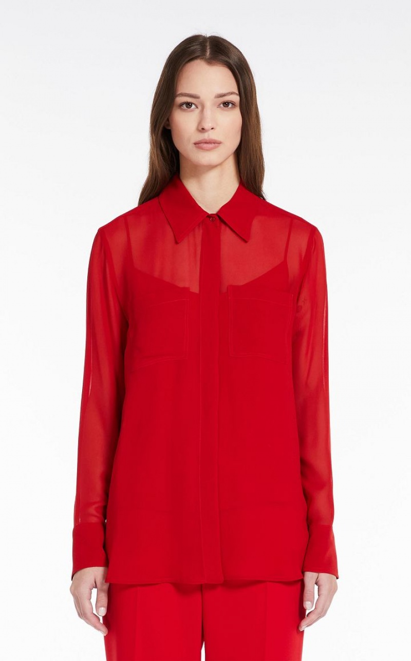 Masculine-inspired shirt crafted in delicate pure silk georgette, featuring a pointed collar, two patch pockets and long sleeves with cuffs. Featuring soft and fluid lines, the garment is completed with lateral vents and a slightly rounded hem. Matching slip top. Concealed fastening. Length: 70 cm.