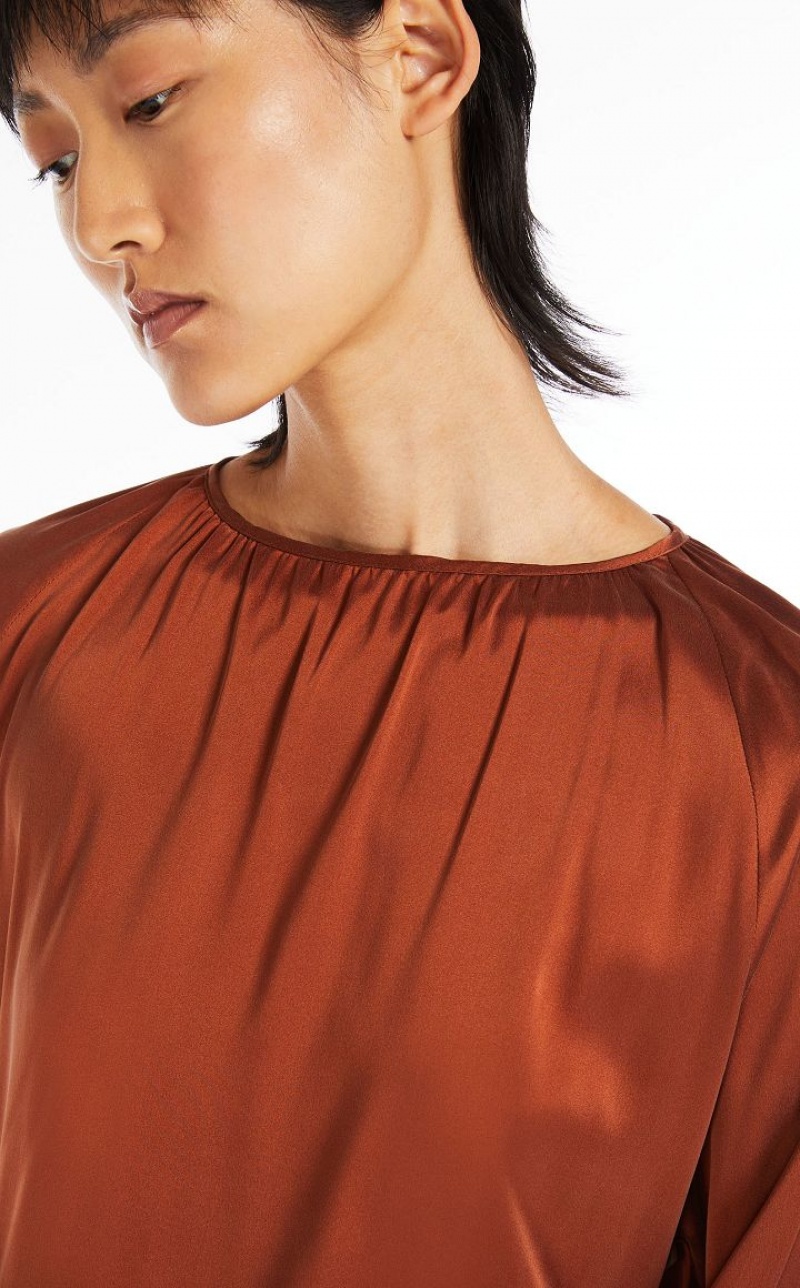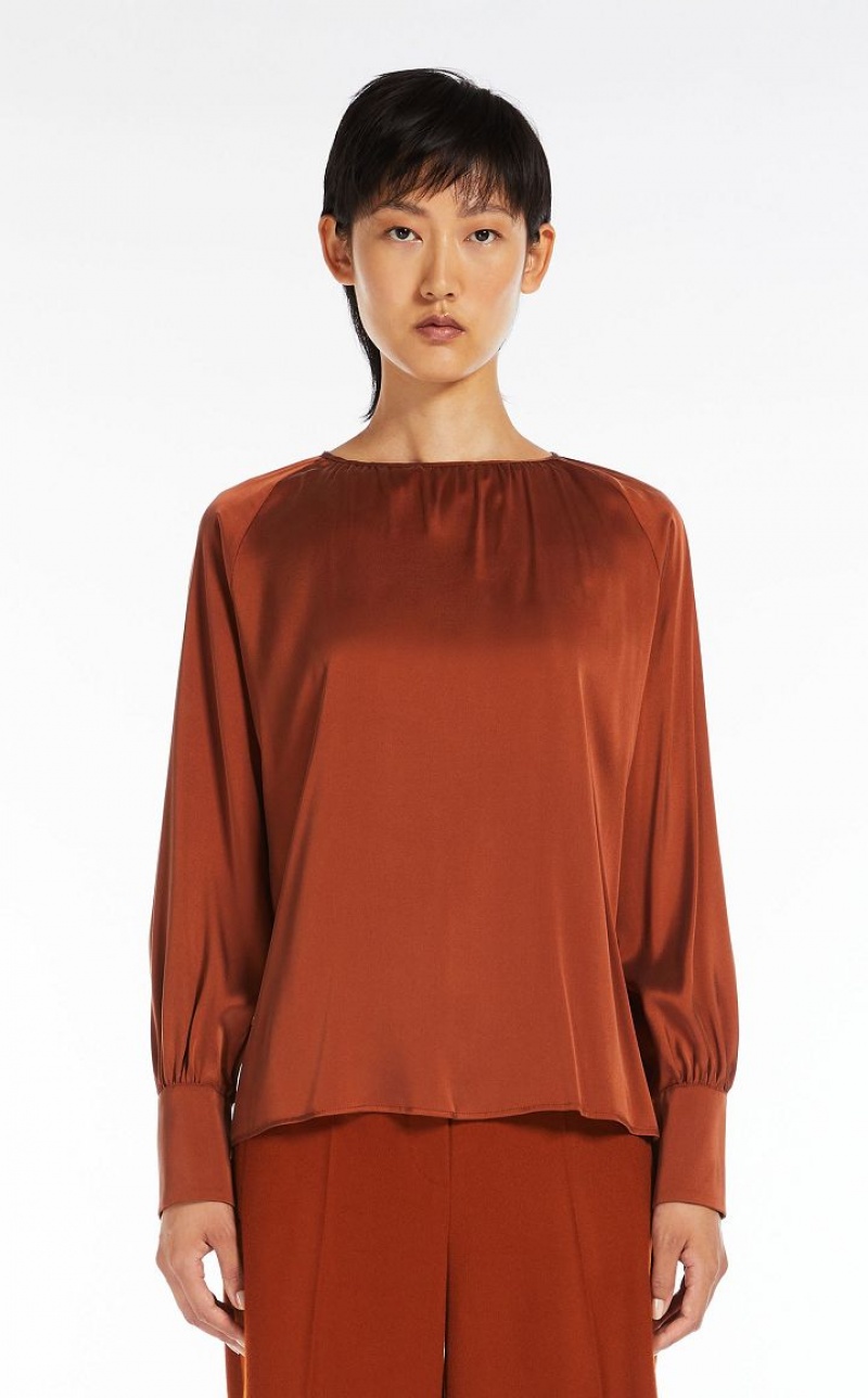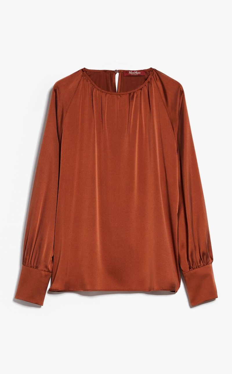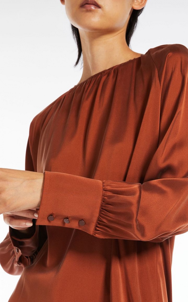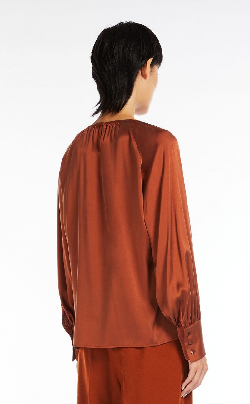 Blouse in fine silk satin with slightly gathered round neckline and wide raglan sleeves with cuffs. Length: 64 cm.
