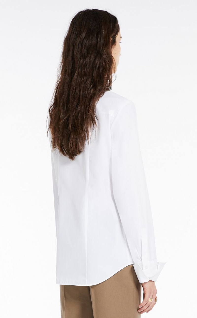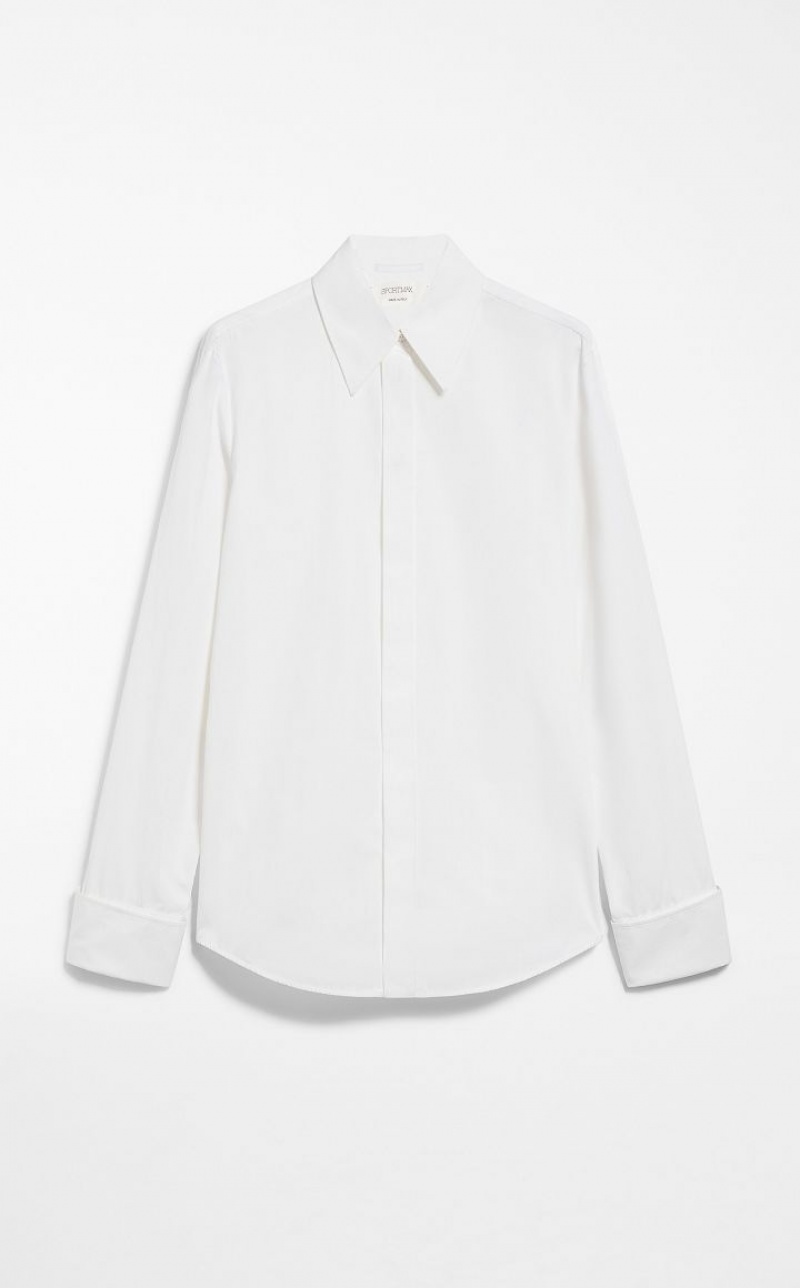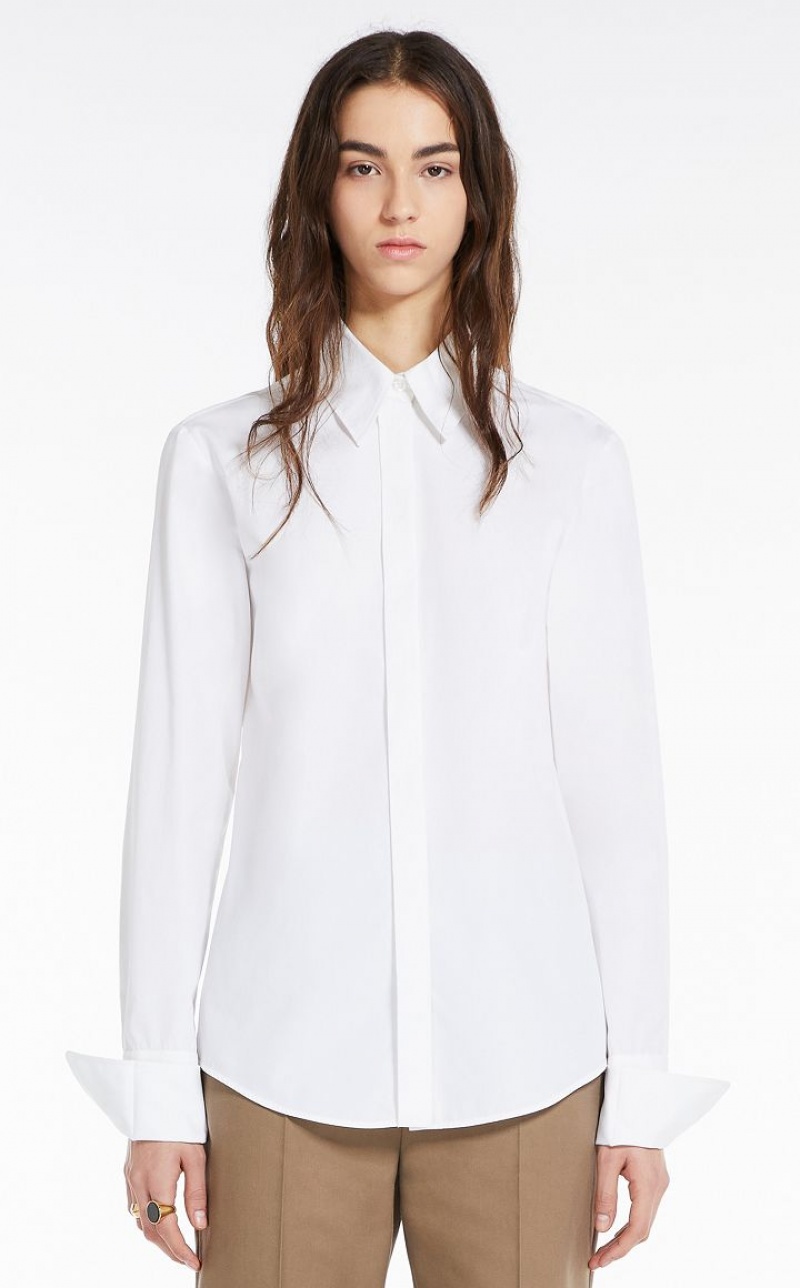 Shirt in pure cotton poplin, with a uncluttered look and waisted, feminine cut. The stand and fall collar is accompanied by a concealed buttoning. The wide double-button cuffs can be worn turned back or long and feature a menswear-inspired cufflink closure. The topstitching runs along all the edges and emphasises the details.