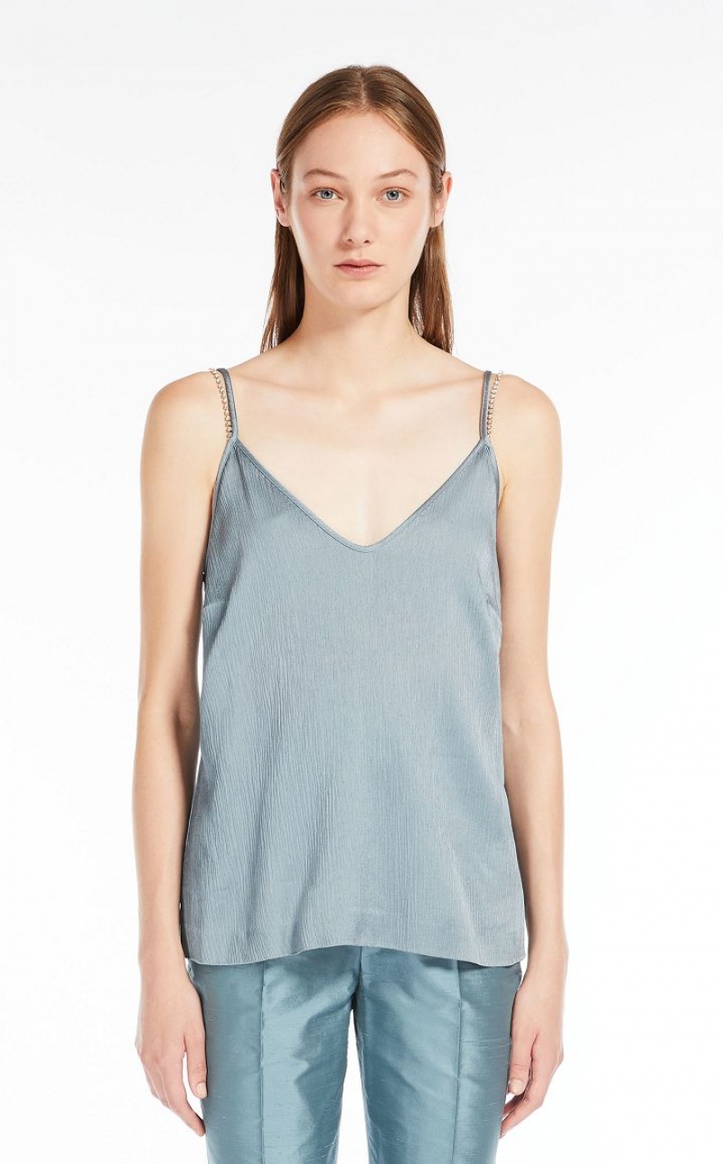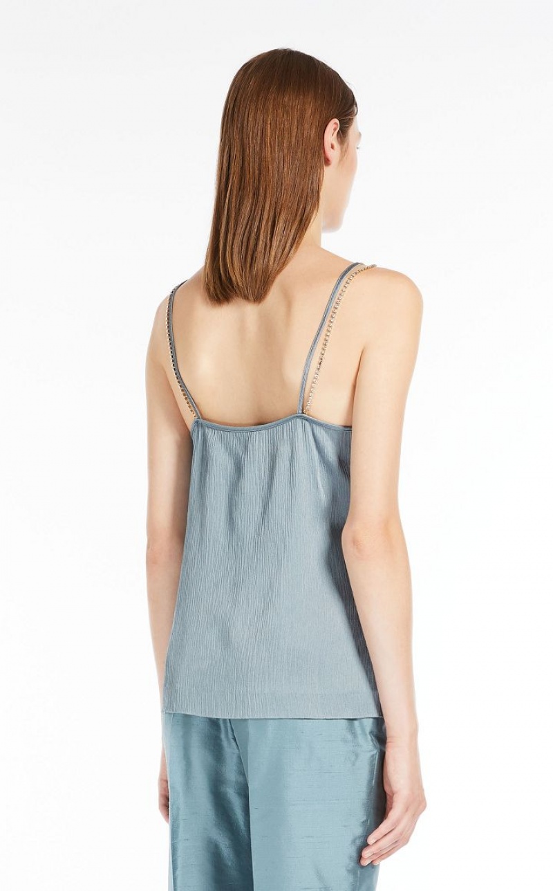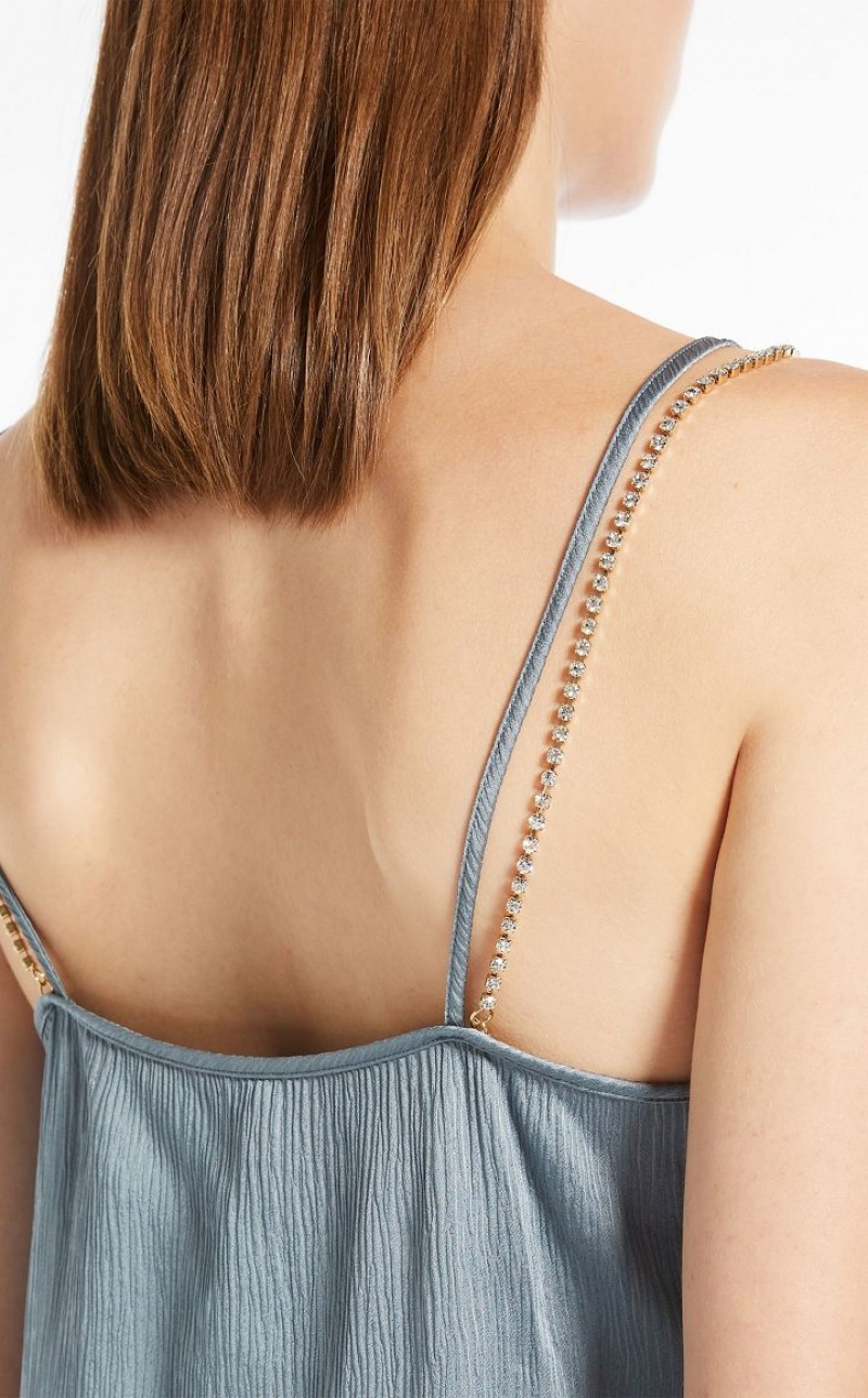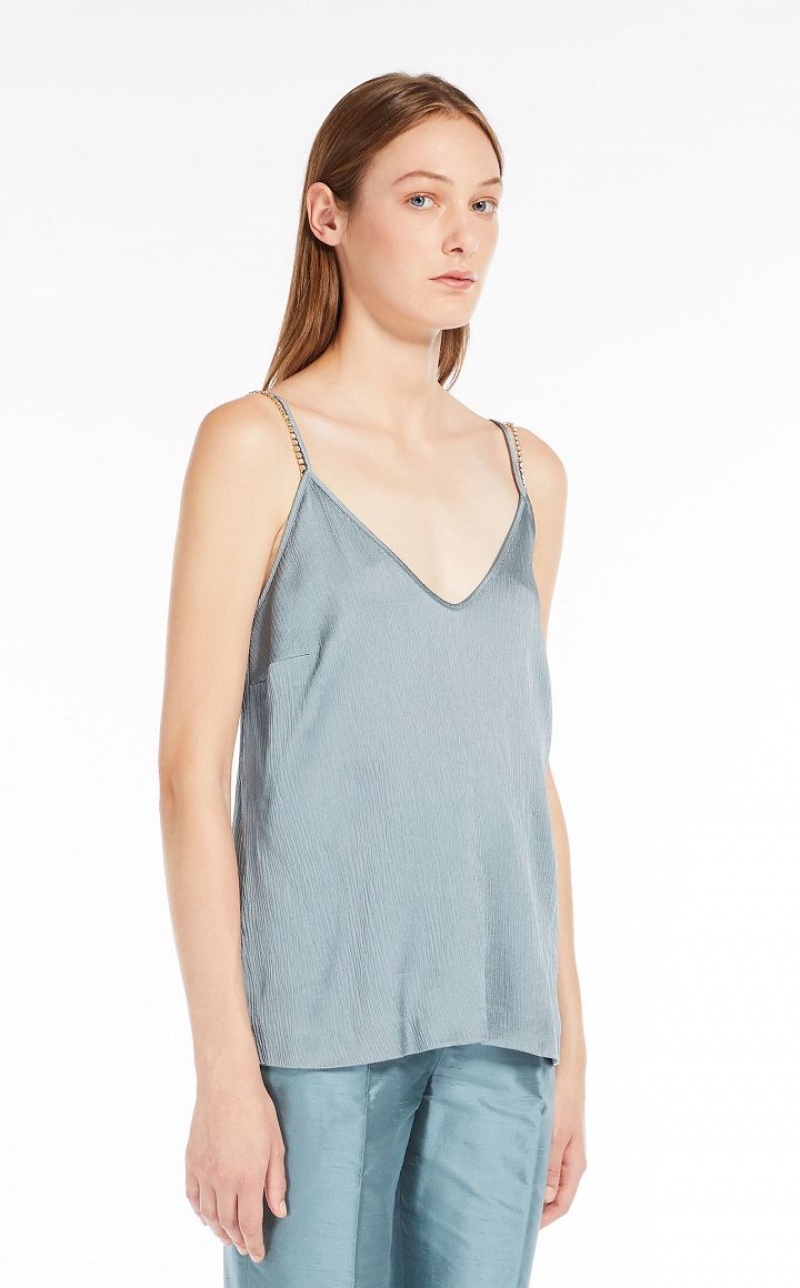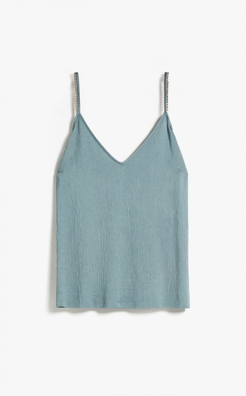 Fluid-fit sleeveless top in elegant viscose-blend crepon fabric featuring rhinestone-embroidered shoulder straps. Length: 62 cm.