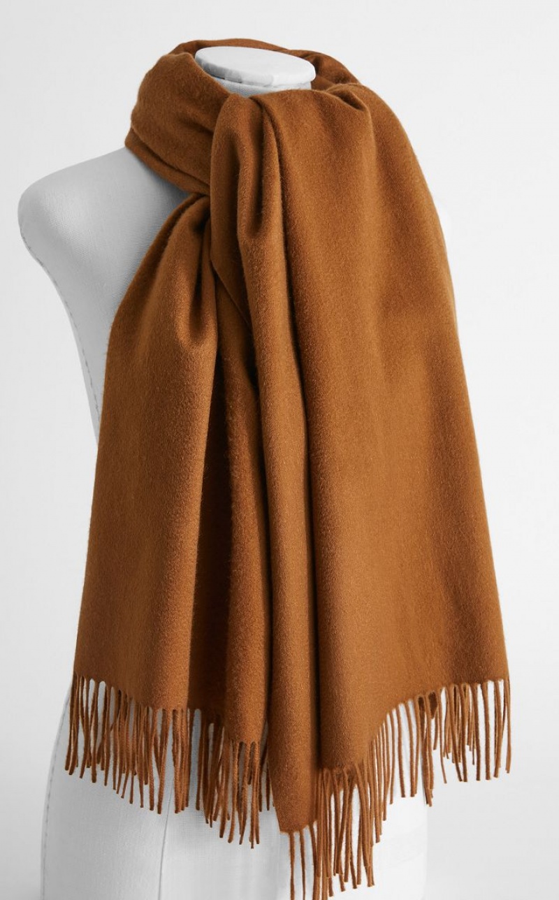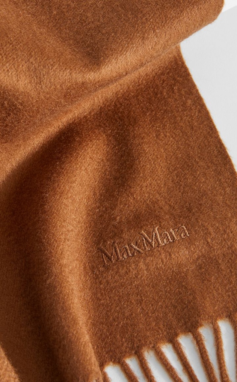 Stole made of exquisite pure sable cashmere yarn. The monochromatic design is embellished with delicate embroidery at the hem that reproduces the Max Mara lettering in the same shades. Finished with small fringes on the short sides. Measurements: 196 x 70 cm.