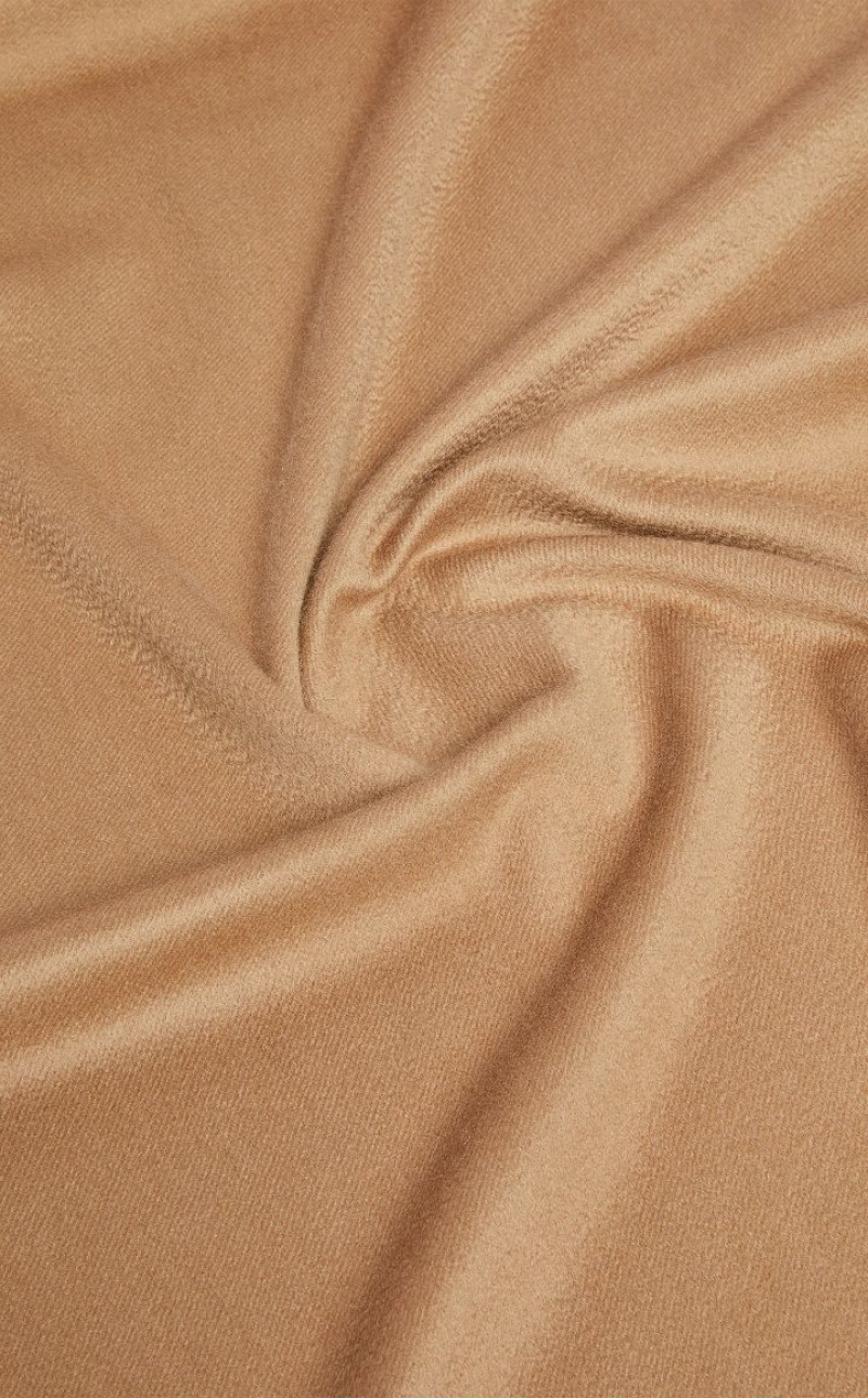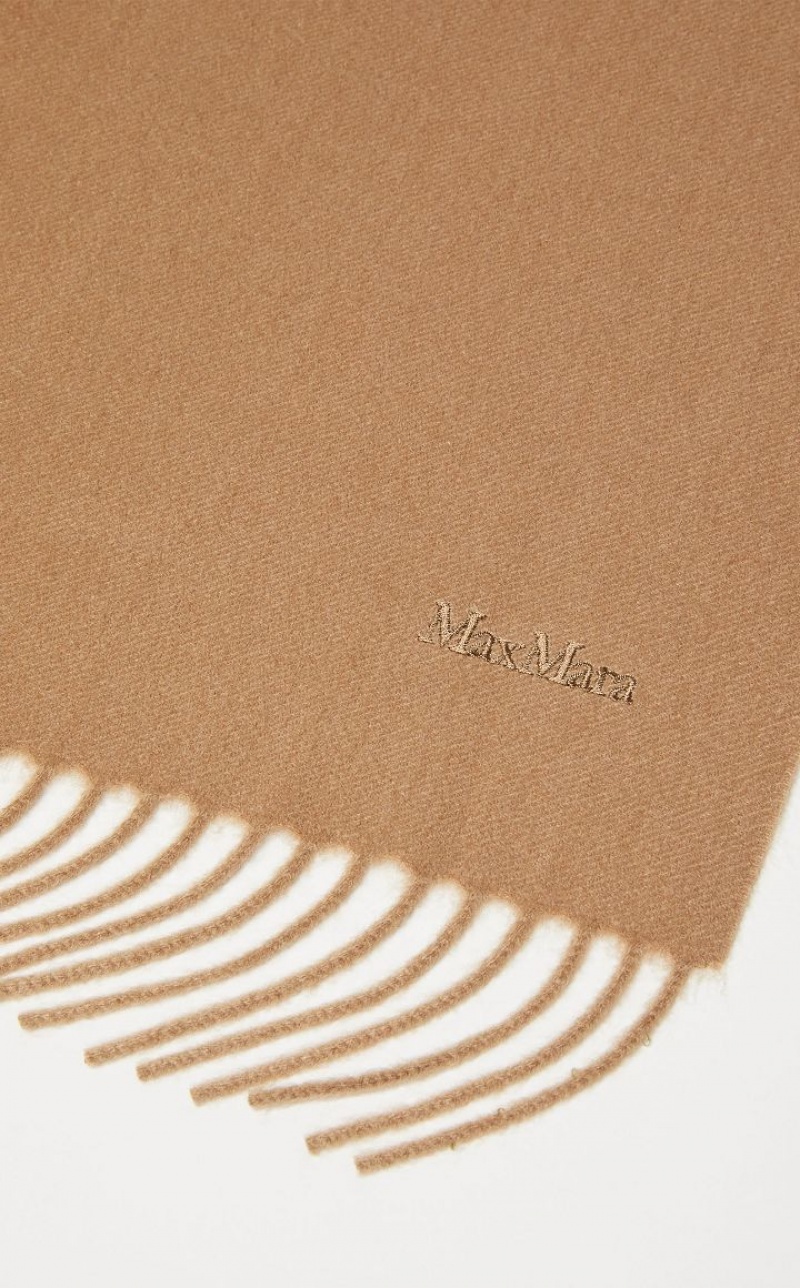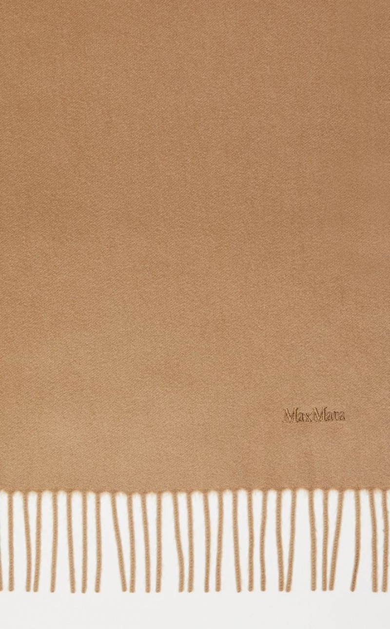 Stole made of exquisite pure sable cashmere yarn. The monochromatic design is embellished with delicate embroidery at the hem that reproduces the Max Mara lettering in the same shades. Finished with small fringes on the short sides. Measurements: 196 x 70 cm.