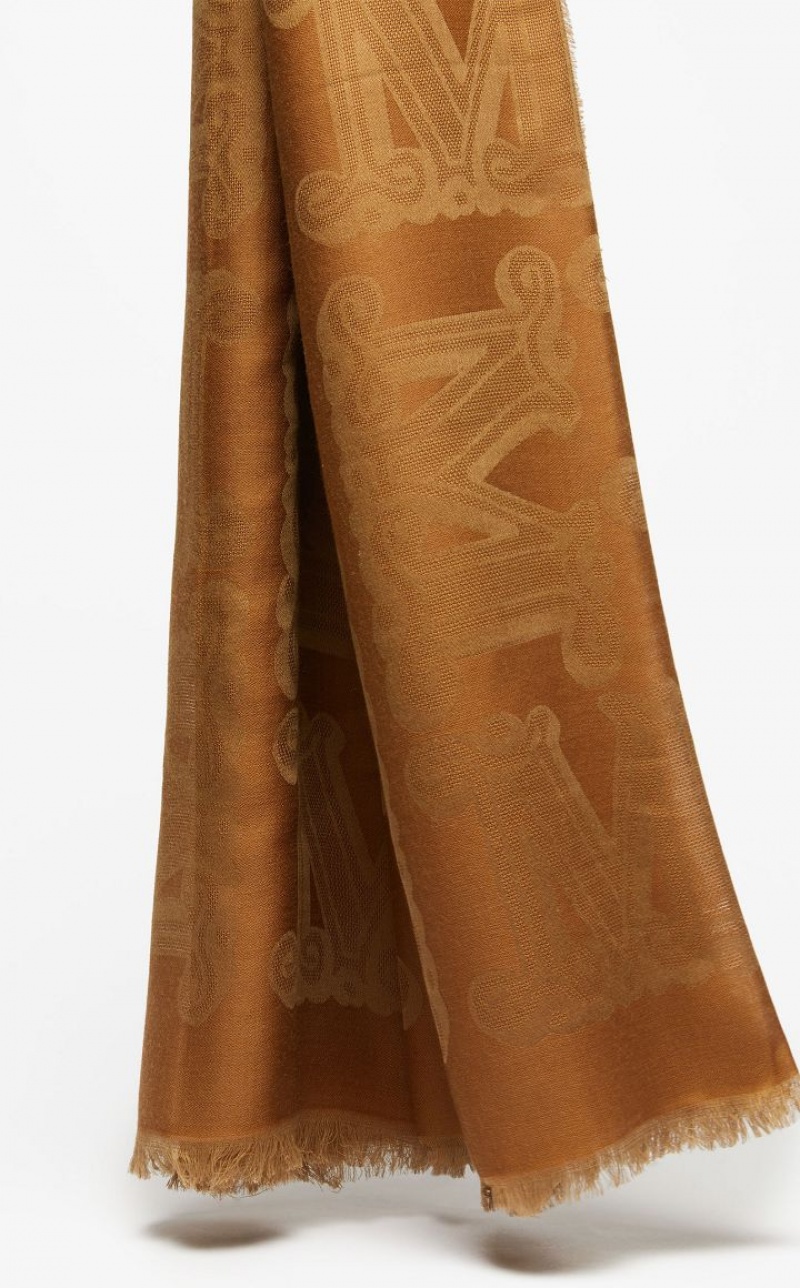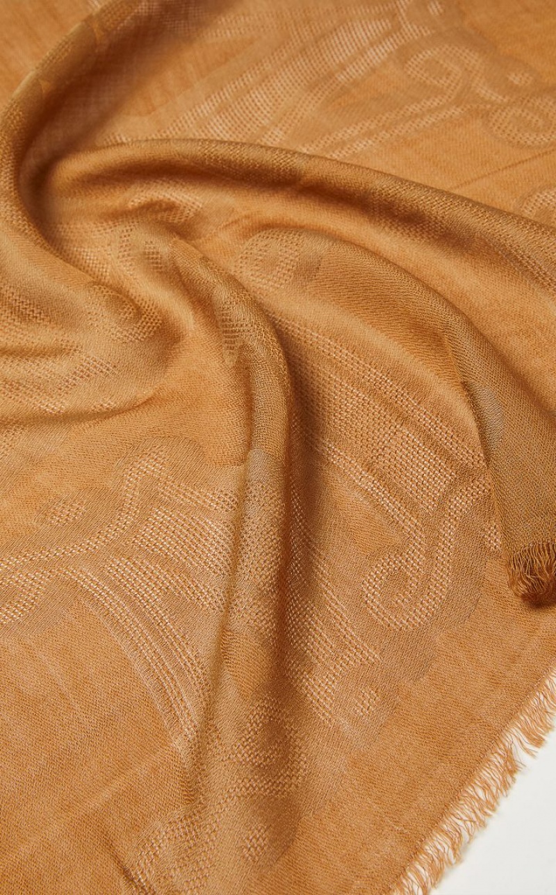 Wool and modal blend yarn shawl with an all-over jacquard motif. Finished with fringed edges. Measurements: 215 cm x 140 cm.