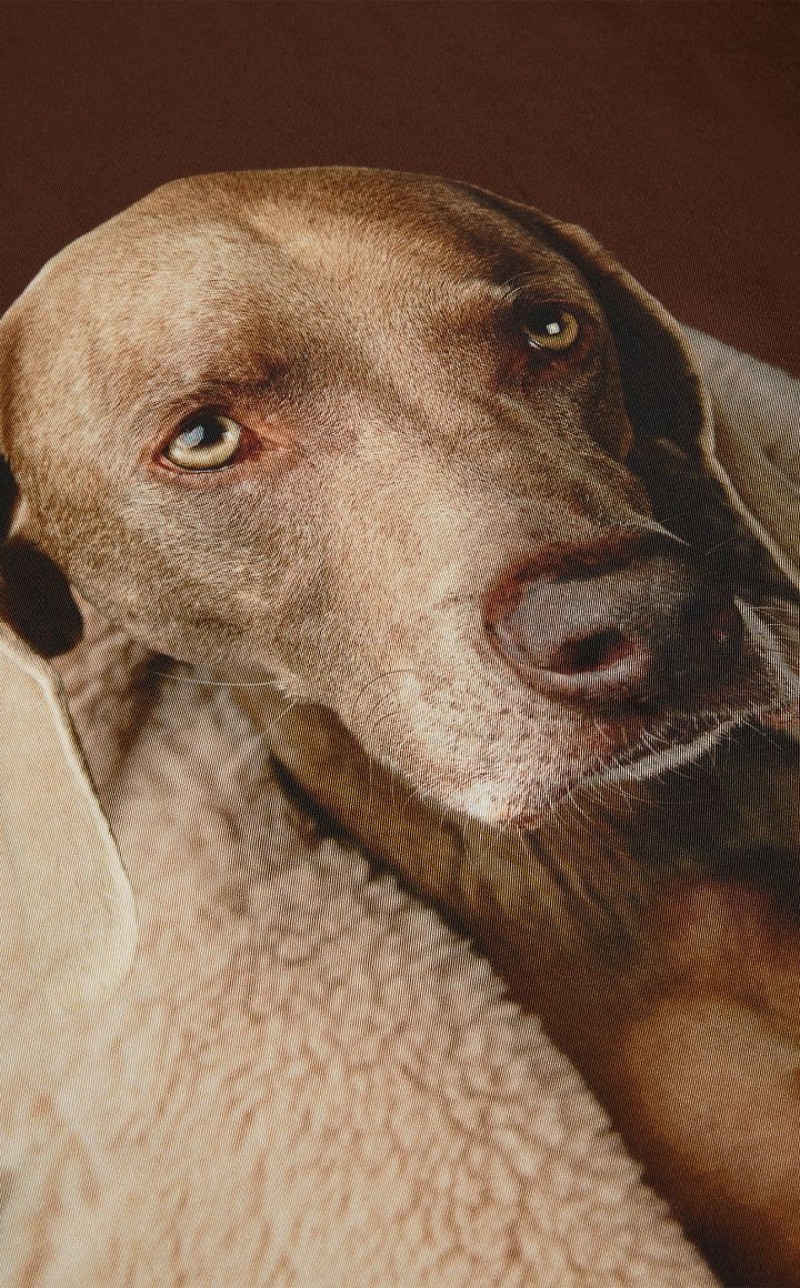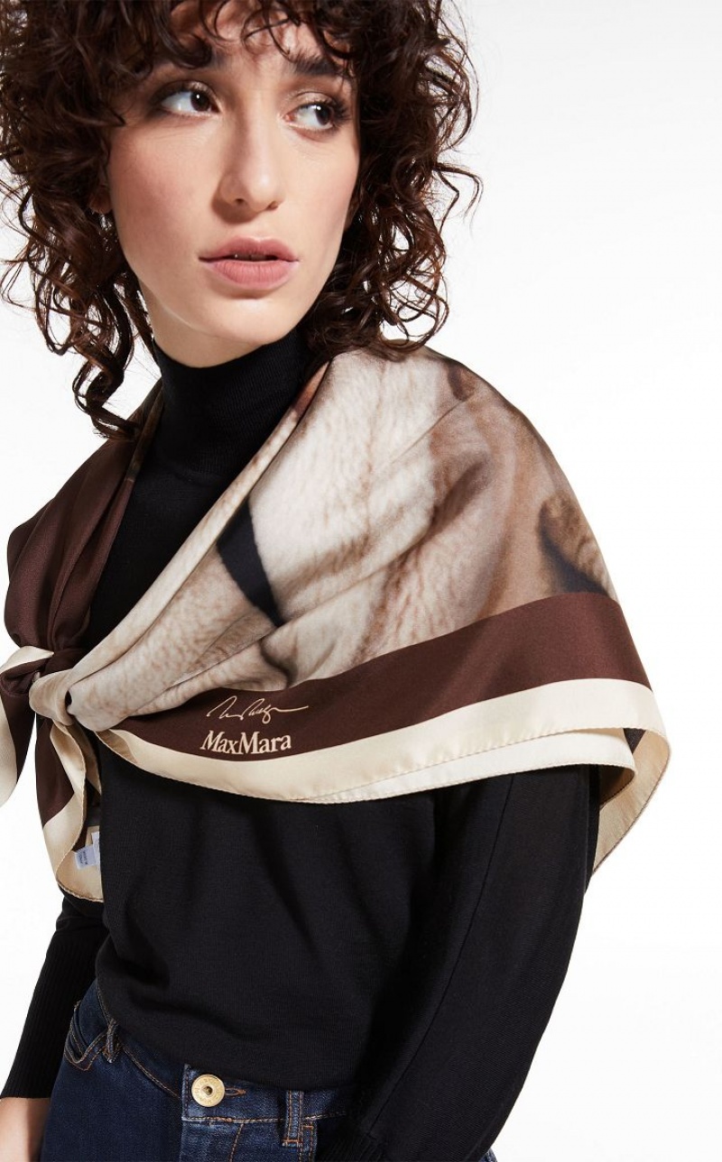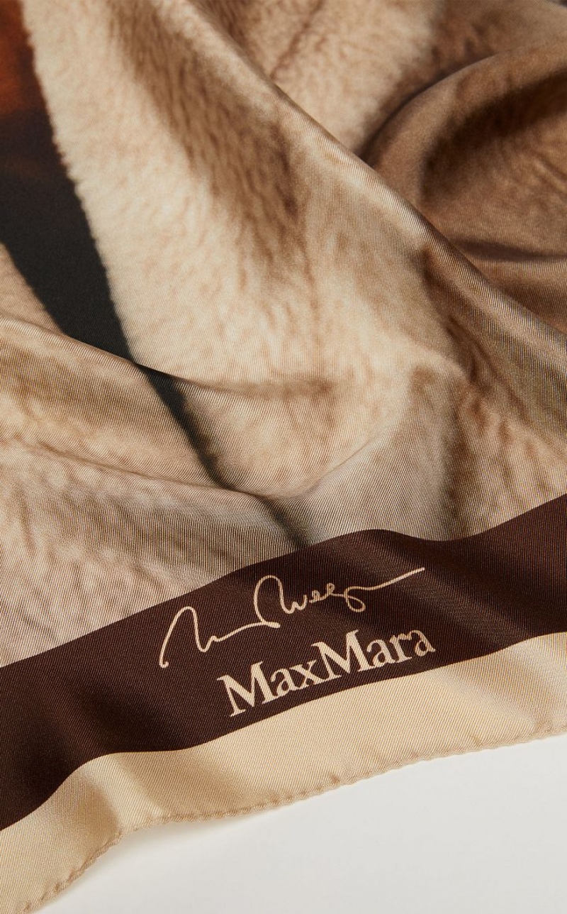 Square foulard in pure silk twill with a print of one of the famous photographic shots by the artist William Wegman for Max Mara. Delicately stitched edges. Measurements: 90 x 90 cm.