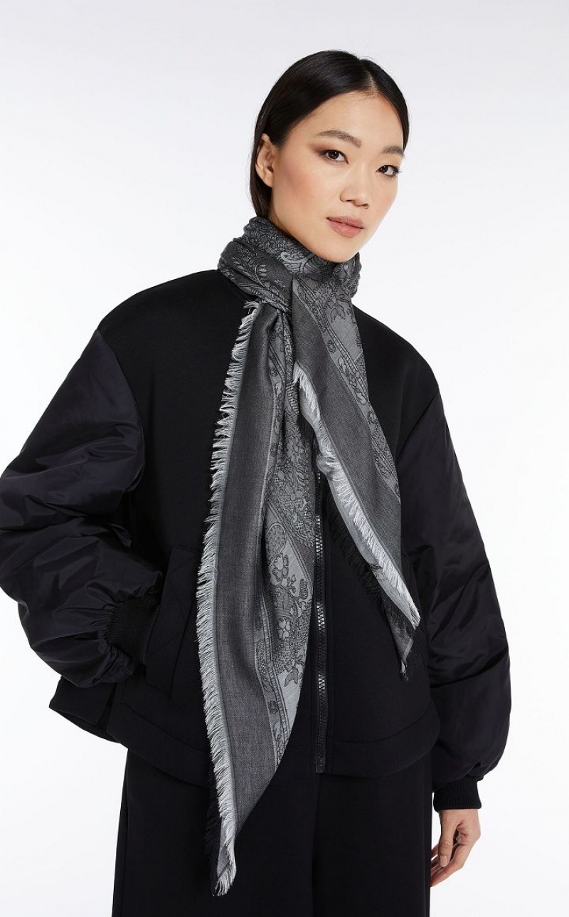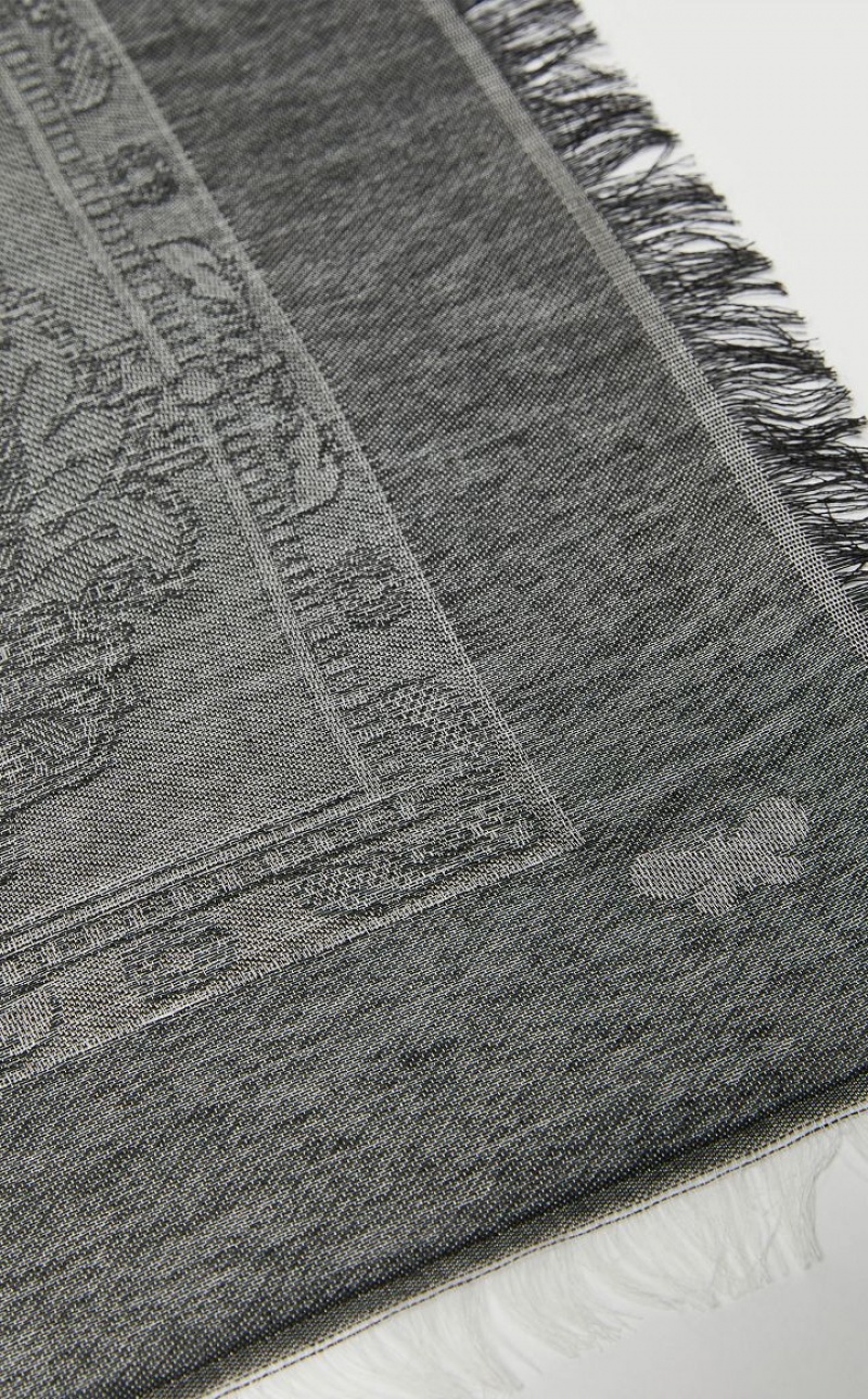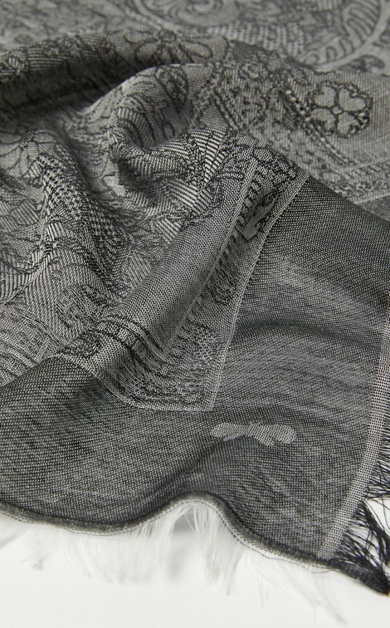 Shawl in viscose and modal blend yarn, woven with all over jacquard pattern. Size 125 x 125 cm.