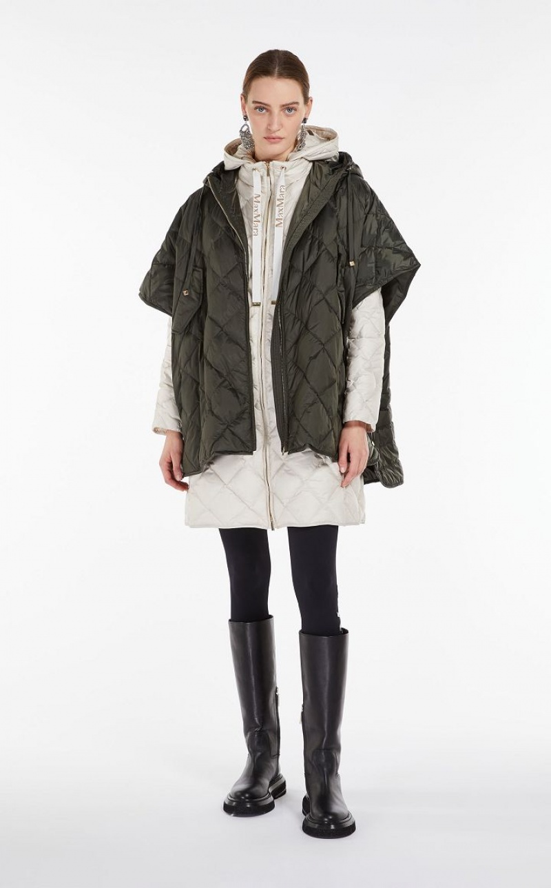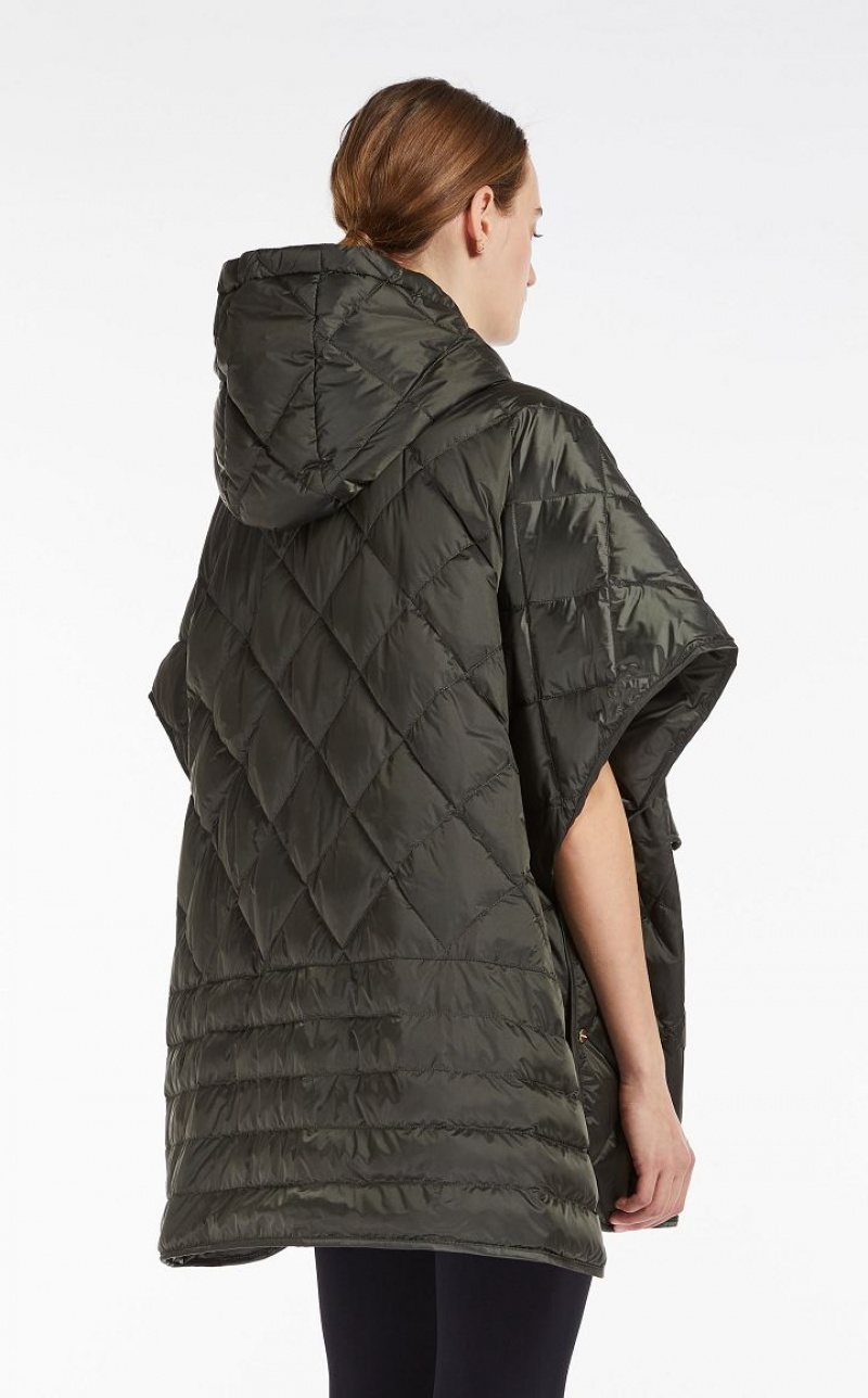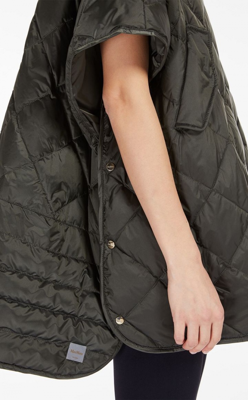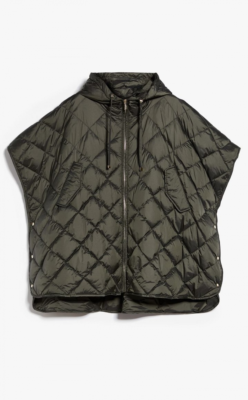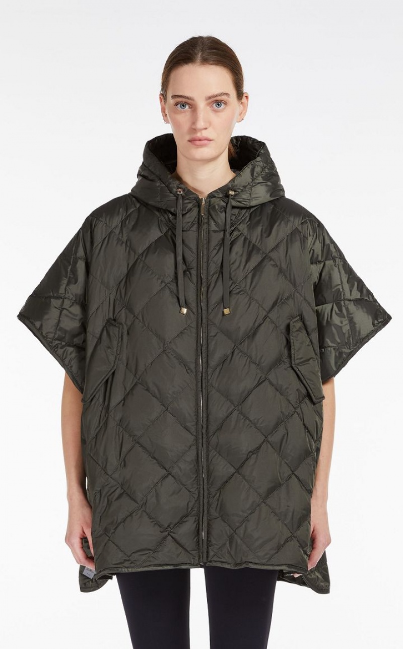 Short goose down cape made of water-resistant iridescent nylon canvas, featuring diamond quilting, a drawstring hood, short sleeves and trench coat style patch pockets with a flap on the front. This style can be opened at the sides with snap-buttons. Front zip closure. This model can be customised with accessories from The Cube collection. Accessories sold separately. Length: 80 cm.