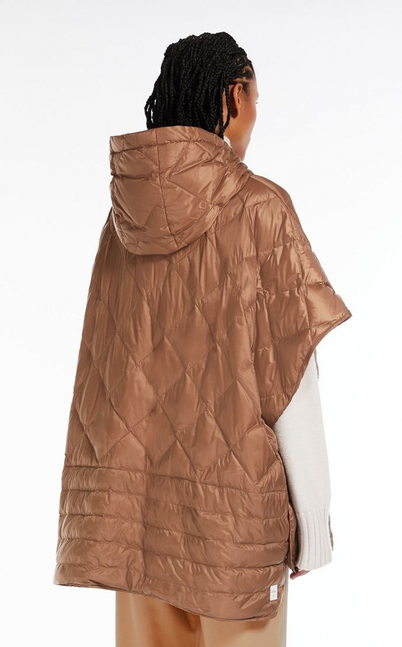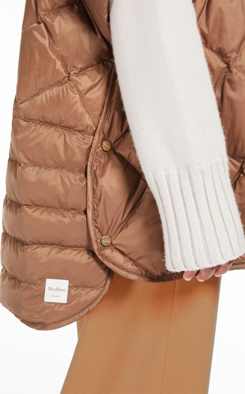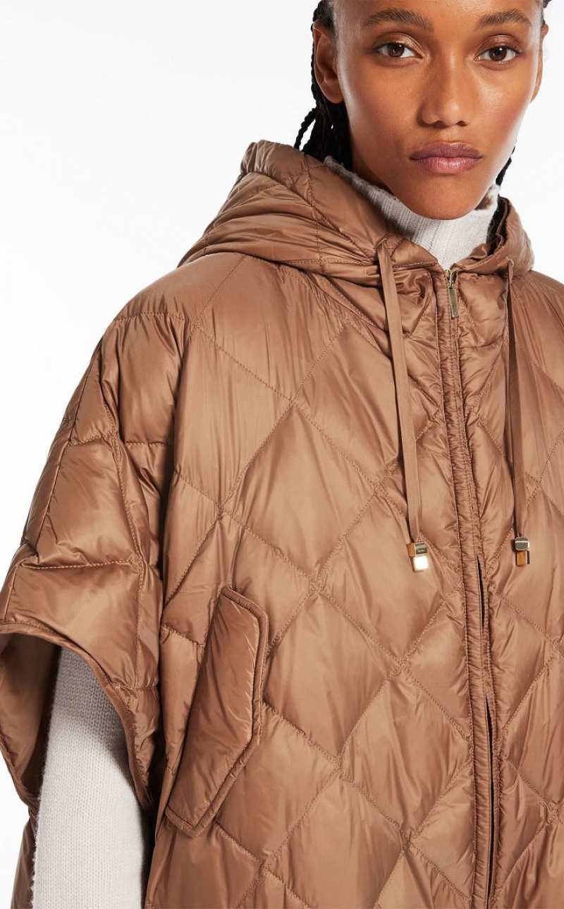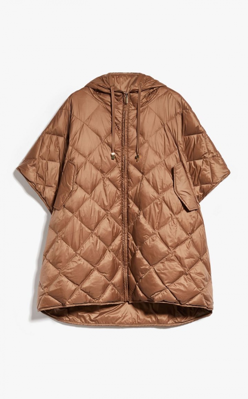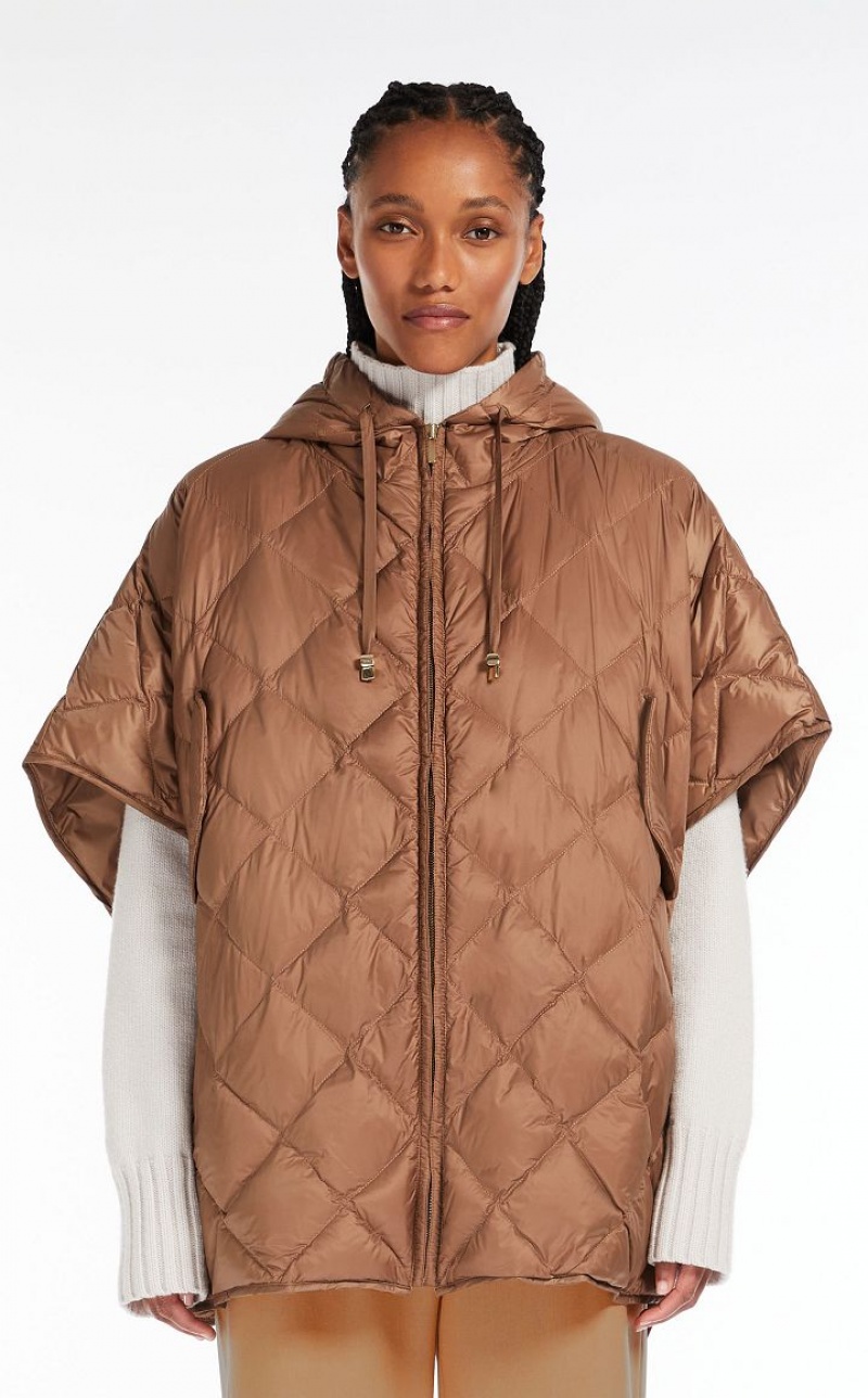Short goose down cape made of water-resistant iridescent nylon canvas, featuring diamond quilting, a drawstring hood, short sleeves and trench coat style patch pockets with a flap on the front. This style can be opened at the sides with snap-buttons. Front zip closure. This model can be customised with accessories from The Cube collection. Accessories sold separately. Length: 80 cm.