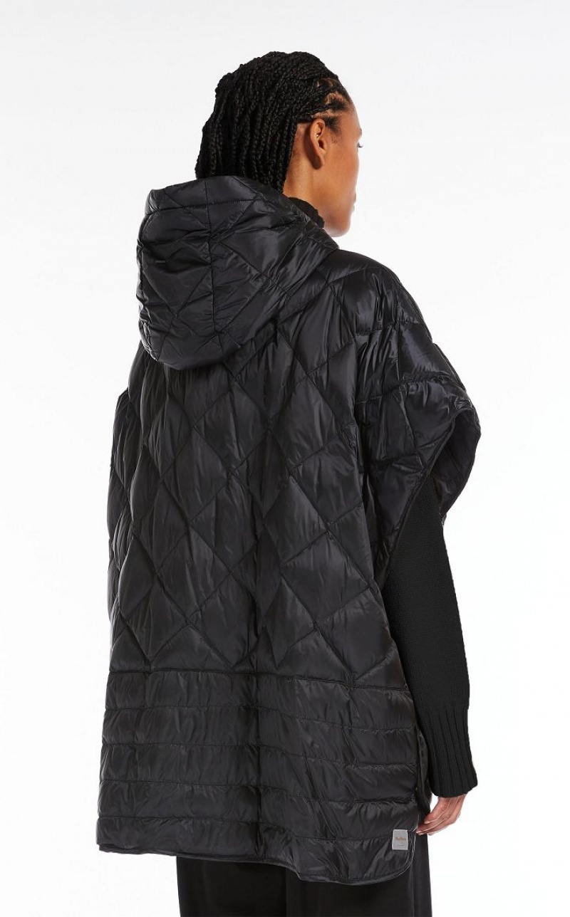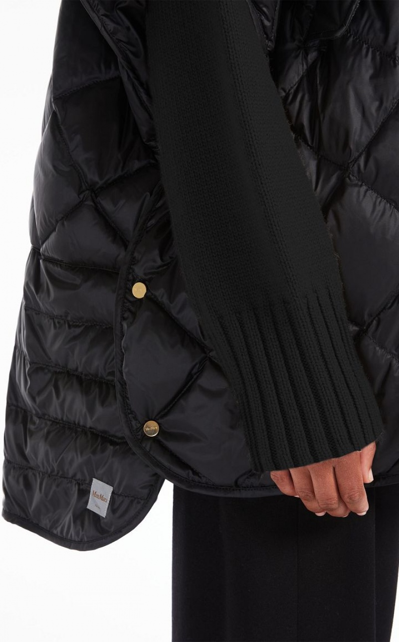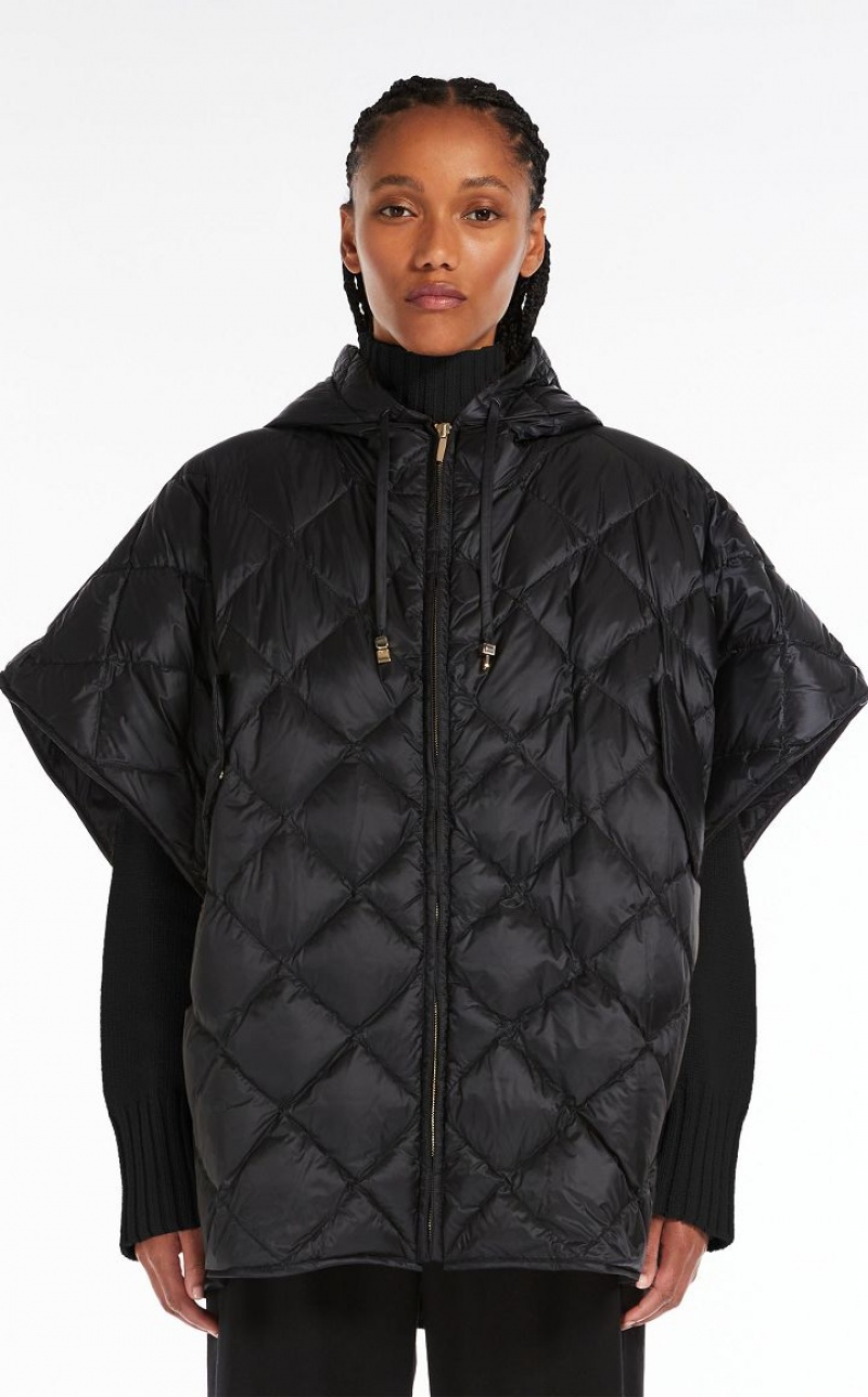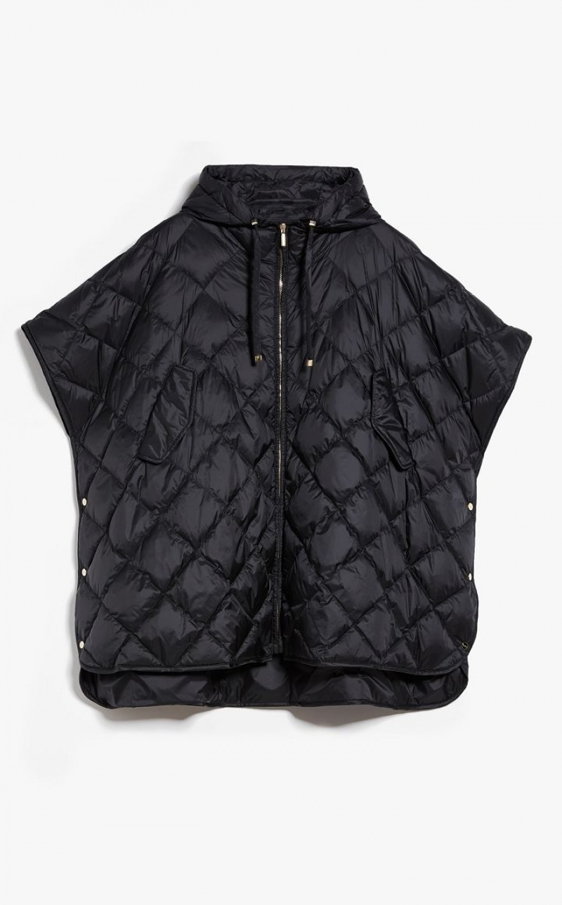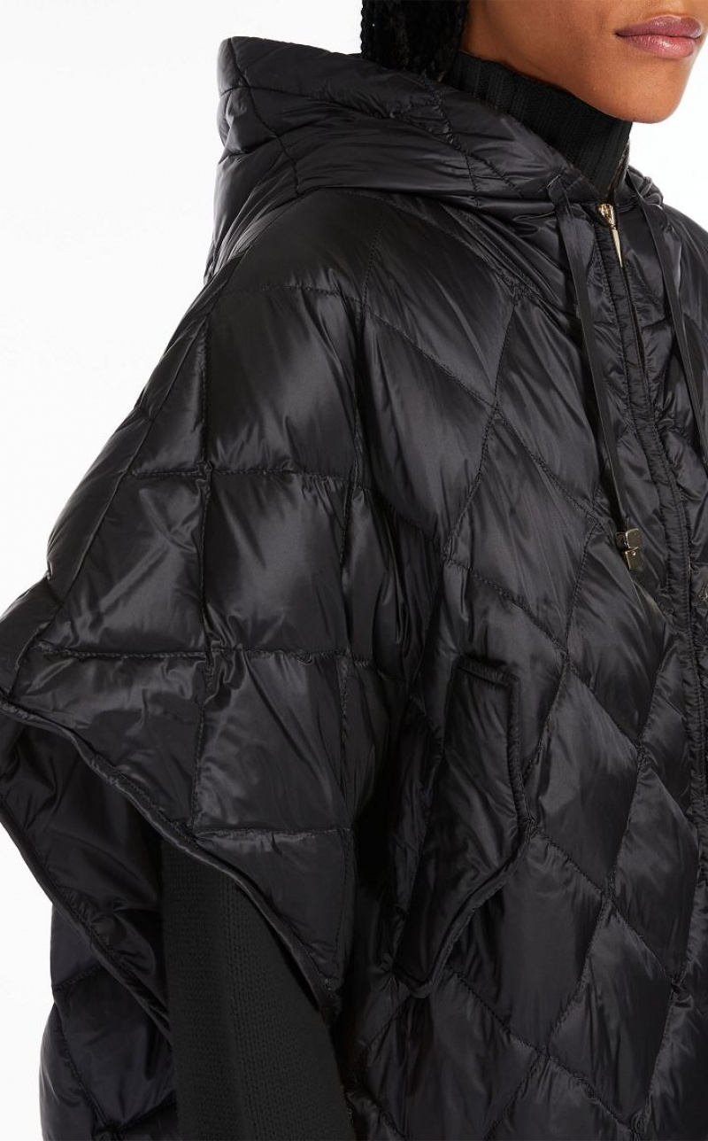Short goose down cape made of water-resistant iridescent nylon canvas, featuring diamond quilting, a drawstring hood, short sleeves and trench coat style patch pockets with a flap on the front. This style can be opened at the sides with snap-buttons. Front zip closure. This model can be customised with accessories from The Cube collection. Accessories sold separately. Length: 80 cm.