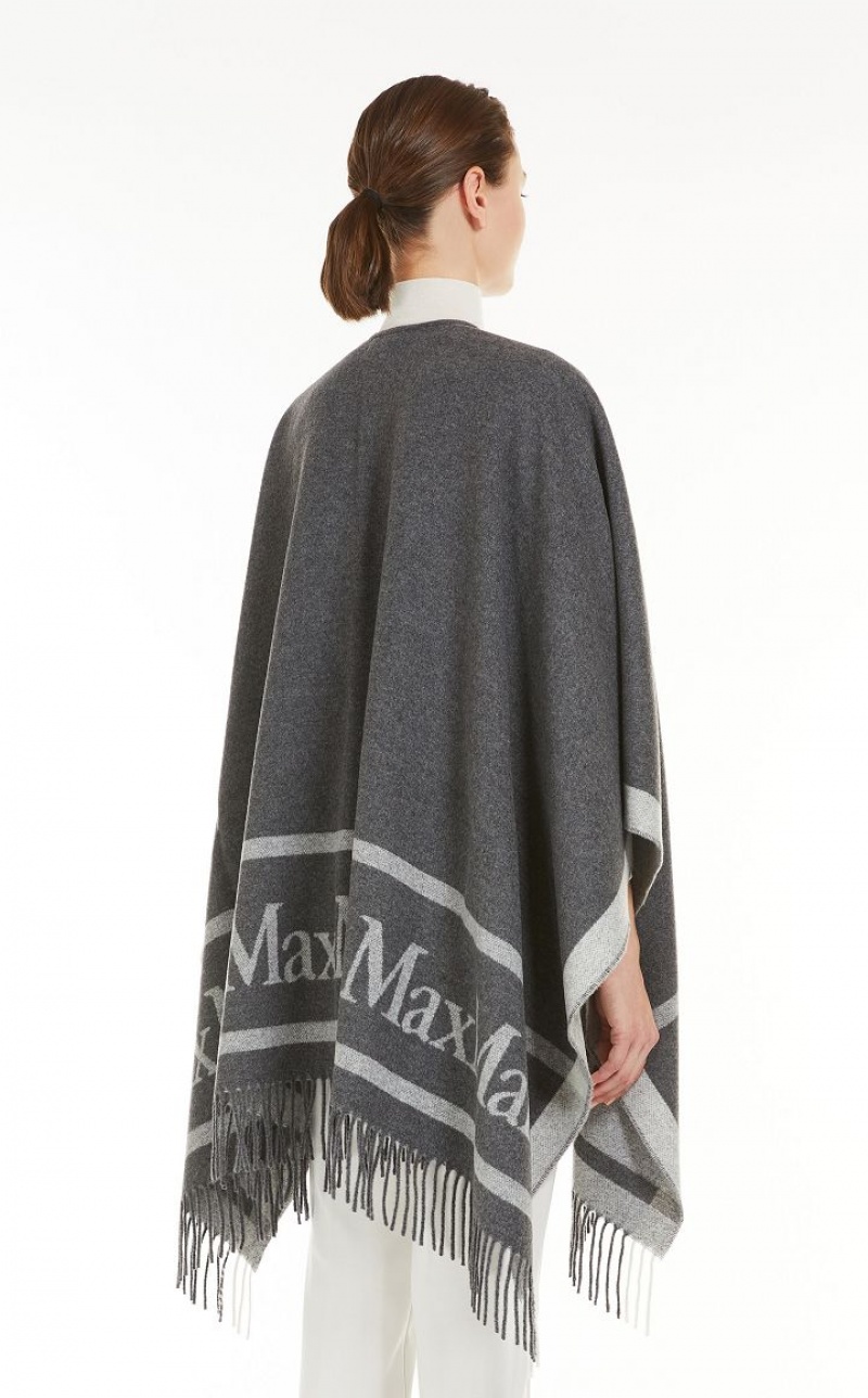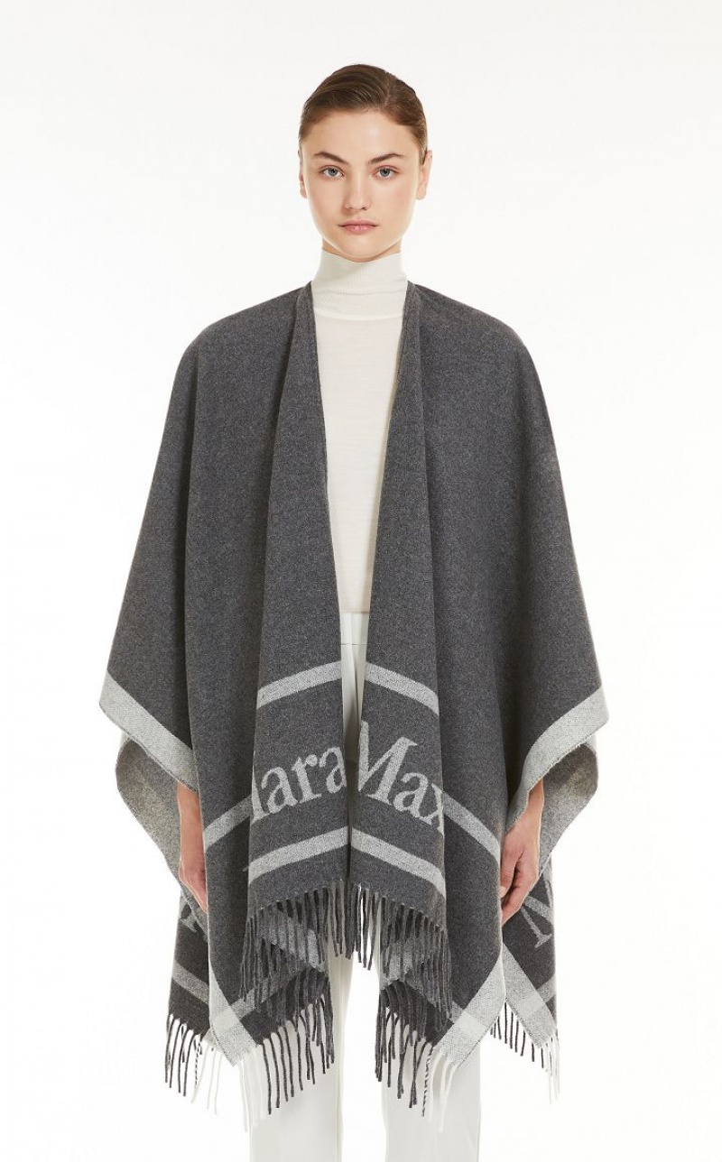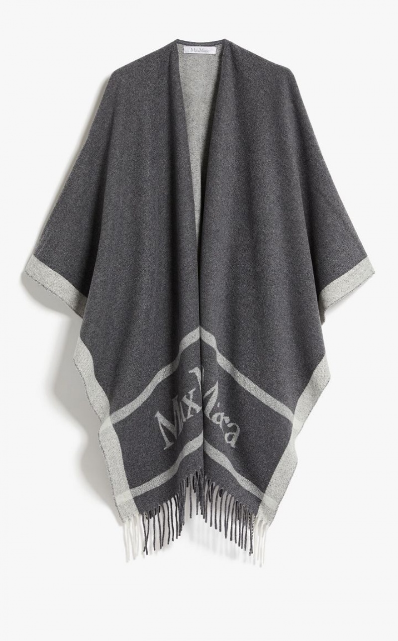 Wide, enveloping cape, inspired by the classic Max Mara stoles, made of exquisite yarn-dyed pure wool yarn, with a jacquard Max Mara motif on the edges, front and back. Edge with long fringes. Measurements: 160 cm x 130 cm.