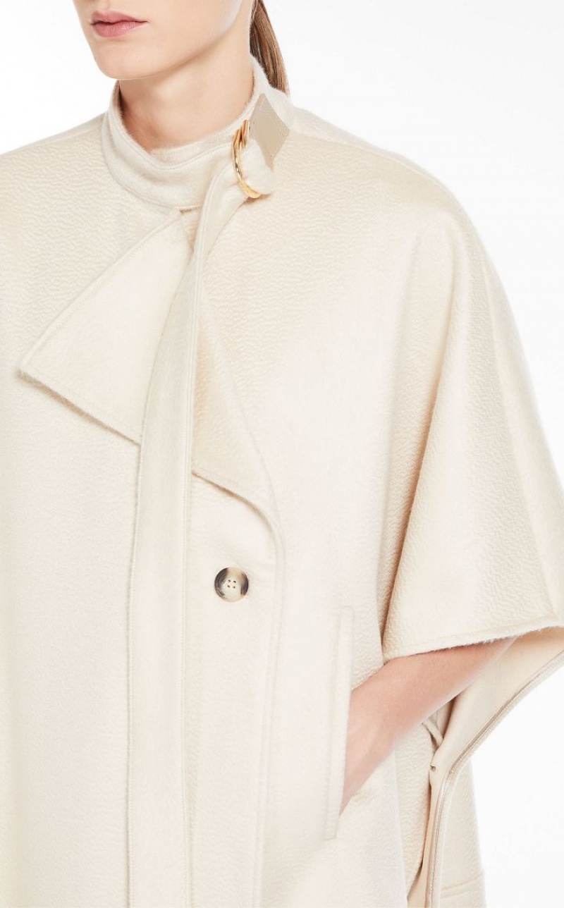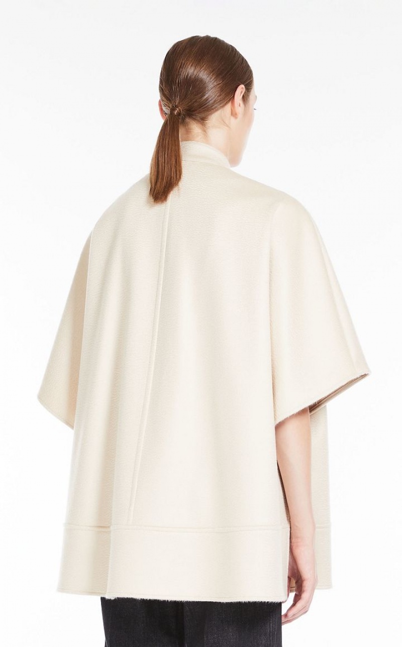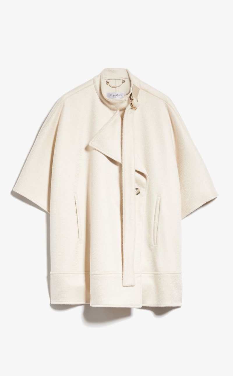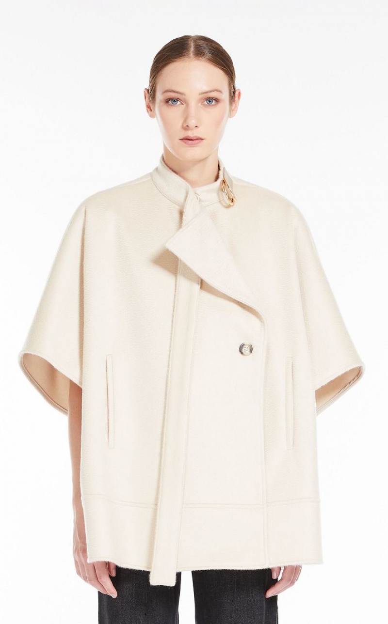 Elegant cape made of luxurious double wool and cashmere fabric, with a mandarin collar and short kimono sleeves. Welt pockets and side snap buttons to adjust the fit. Midi style with a fastening tie at the neck with a double light gold-coloured metal ring and an asymmetric button at the waist.