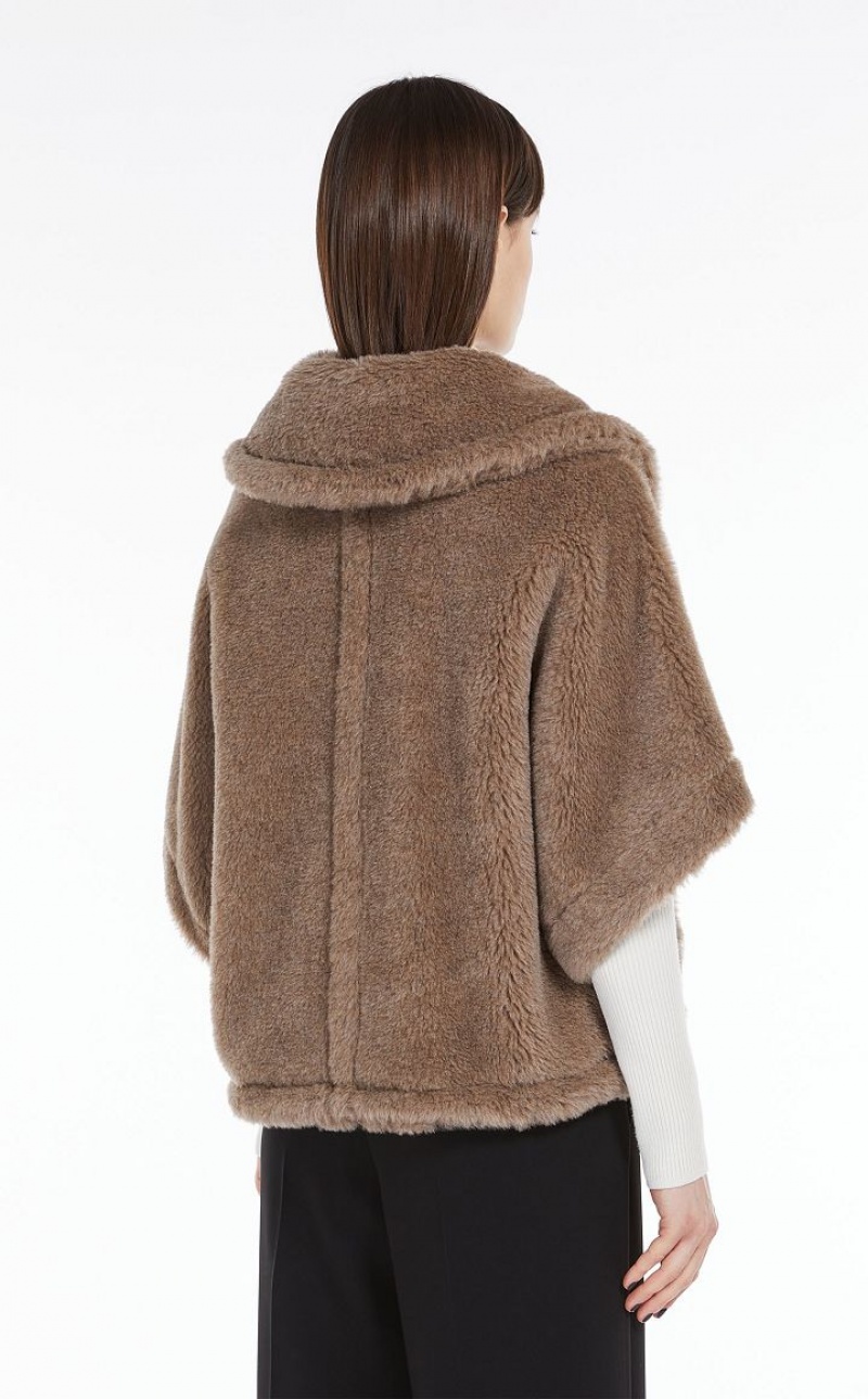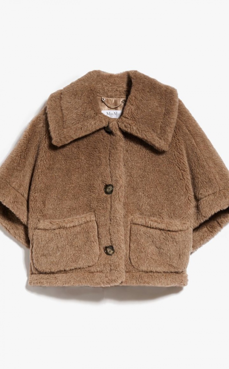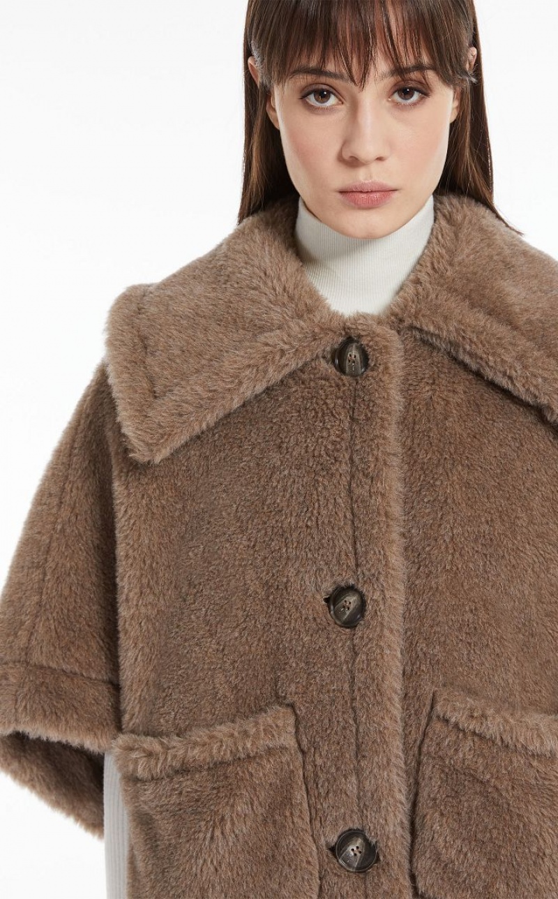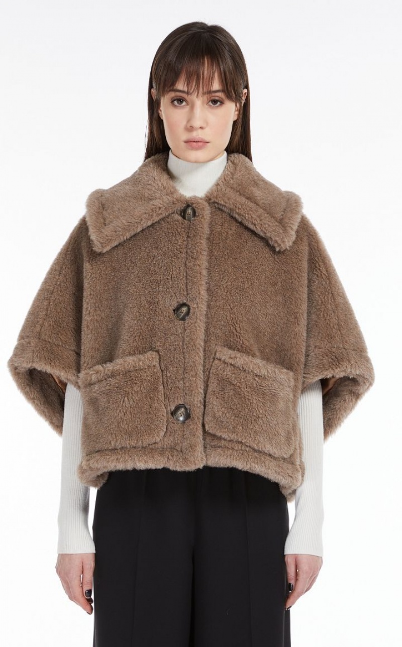 Cape with a boxy silhouette made of iconic alpaca and cashmere Teddy fabric on a silk base. Hip-length style, featuring a shirt construction with a wide pointed collar and patch pockets on the front. Front closure with chunky ’50s-inspired buttons. Length: 58 cm.