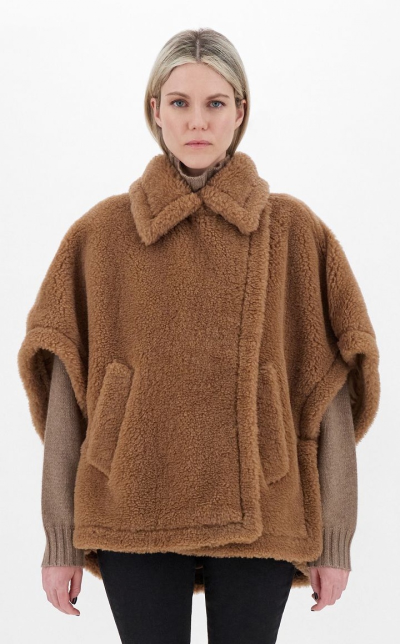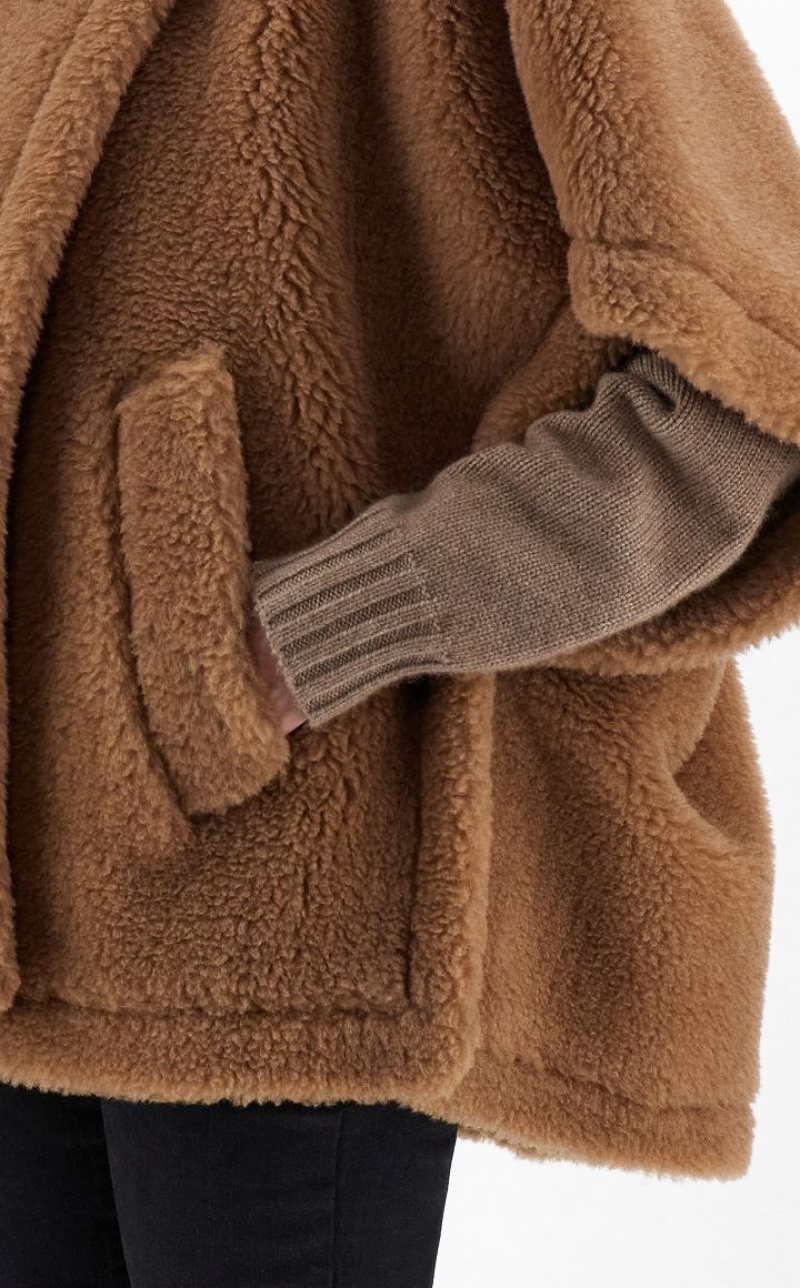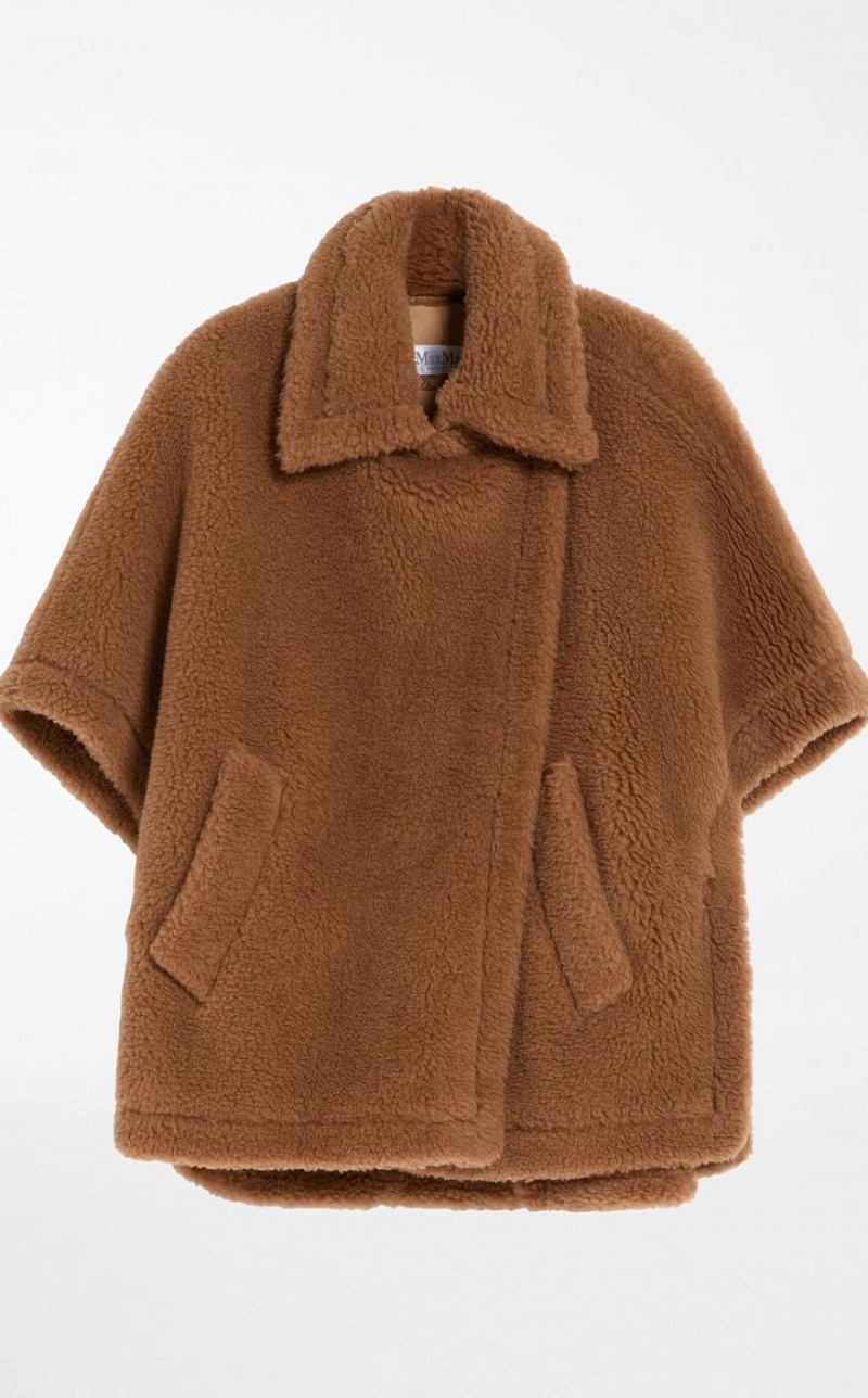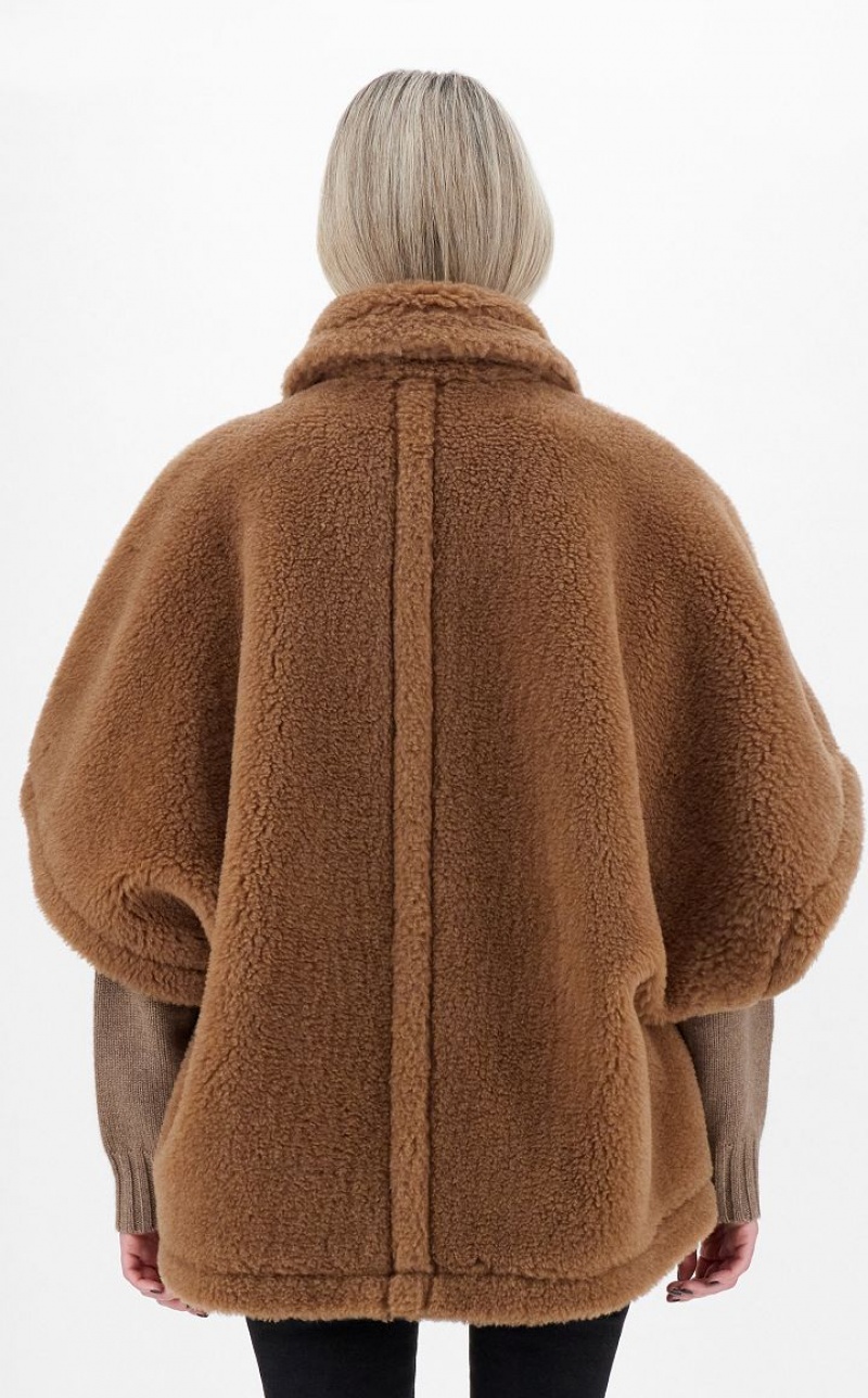 The short cape is one of the season’s iconic pieces, perfect for a casual yet sophisticated look. The style, made with the iconic Teddy fabric of camel on a silk base, has an enveloping line characterised by a pointed maxi collar, wide short sleeves and slanted welt pockets.