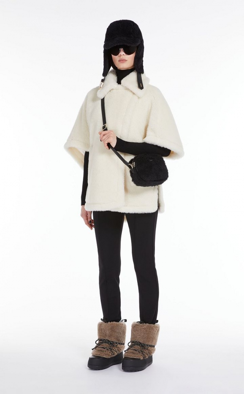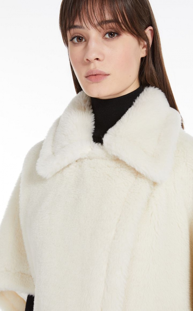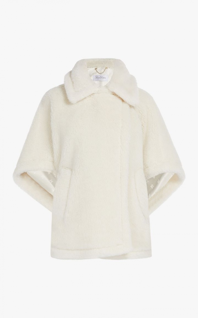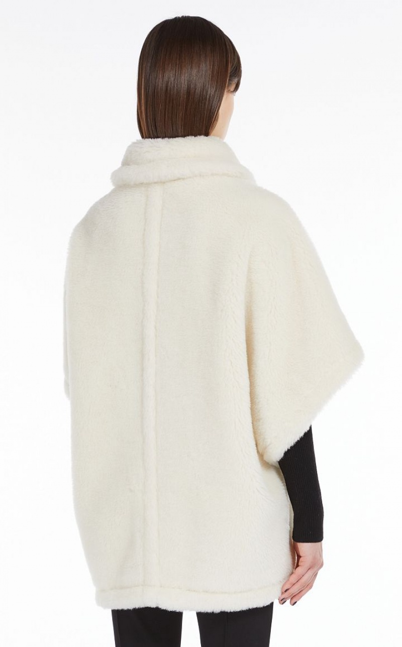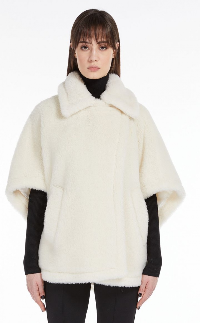 Cape with asymmetric fastening, made of iconic alpaca and wool Teddy fabric on a silk base. Long, mid-thigh oversized style, featuring a wide shirt collar, wide sleeves and pockets with broad welts at the sides. Single button fastening at the front. Length: 75 cm.