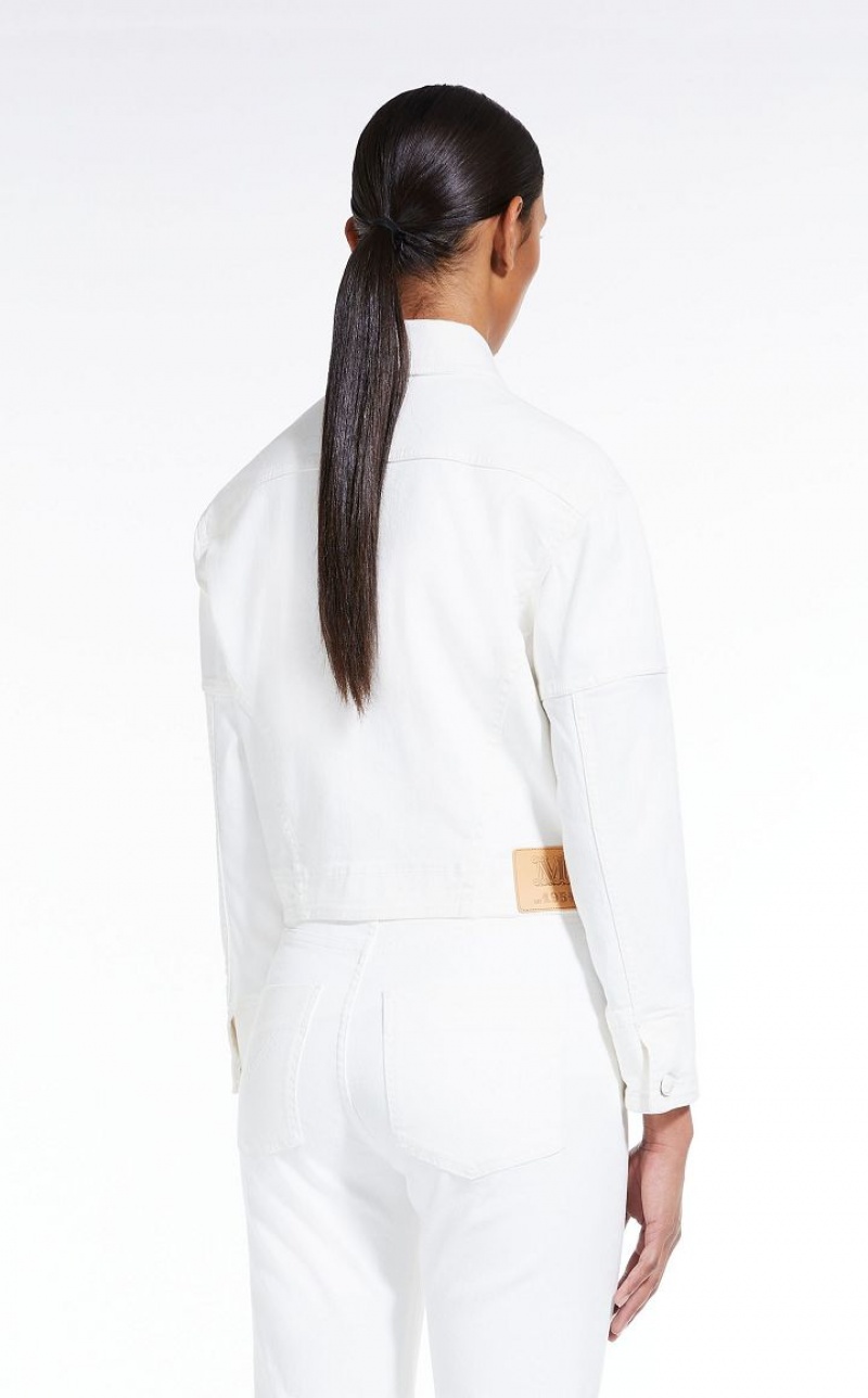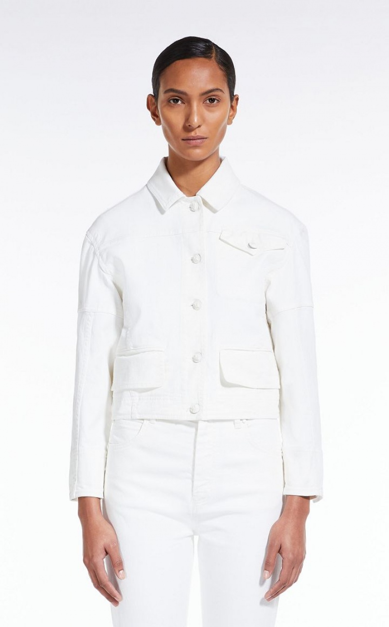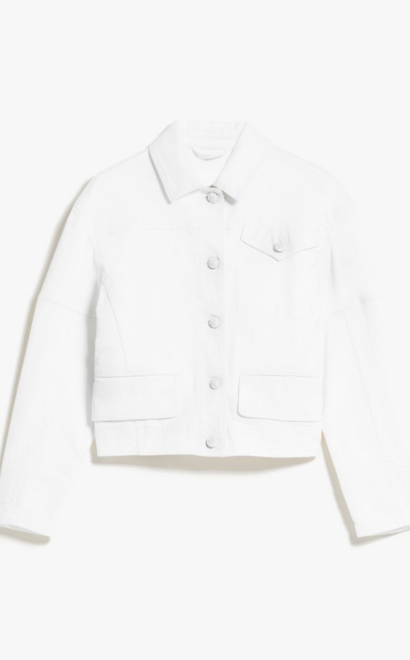 Denim-inspired cropped jacket made of garment-dyed stretch cotton bull with a lived-in effect. Featuring a slightly oversized boxy line, it has a breast pocket with flap and button, low pockets with applied flap and long sleeves with cuffs. Lined in light cotton fabric, it is finished with a customised label sewn on the back of the waist. Fastening with metallic logo buttons. Length: 50 cm.