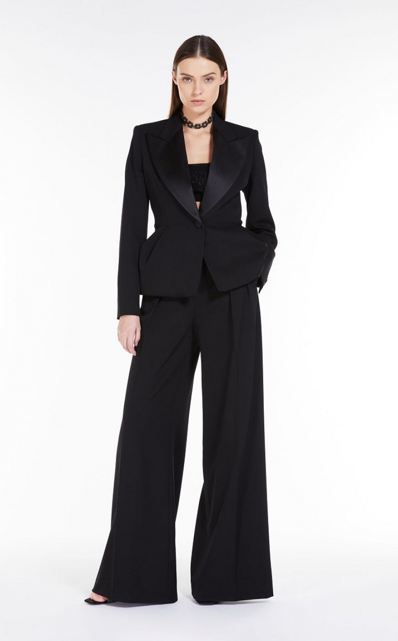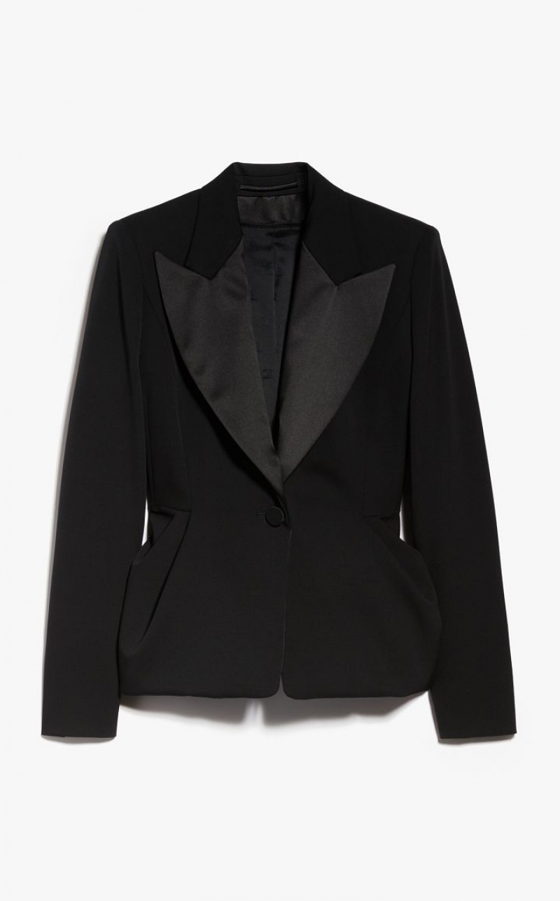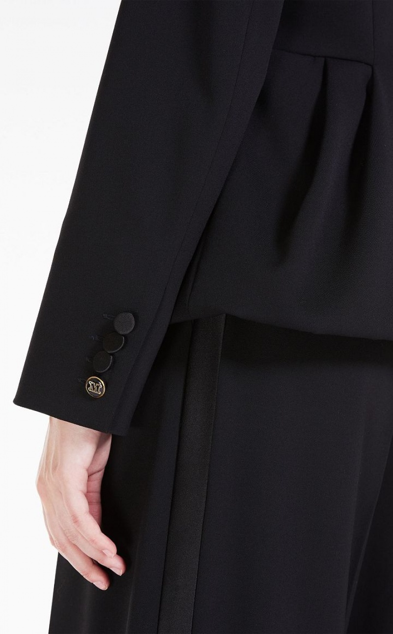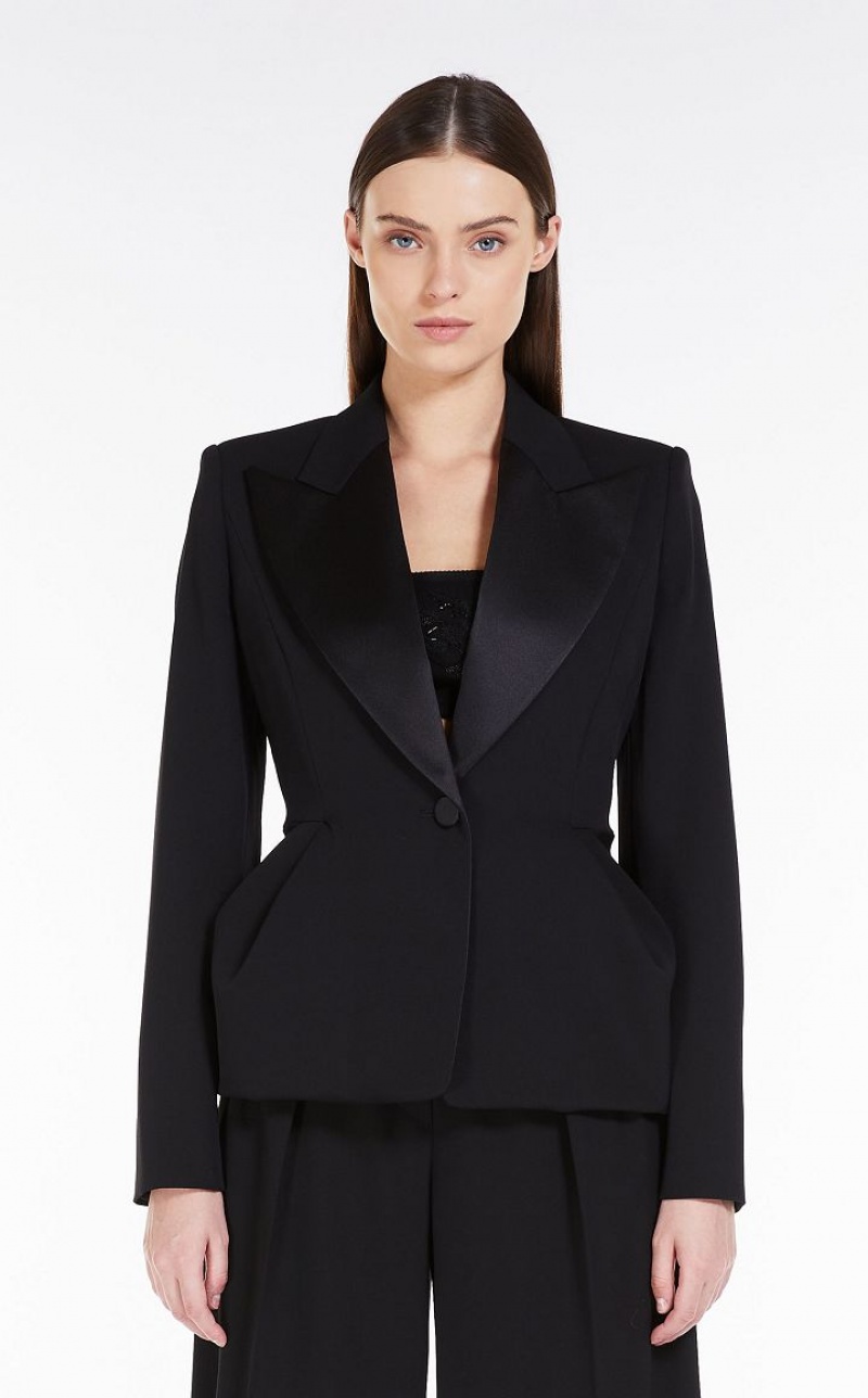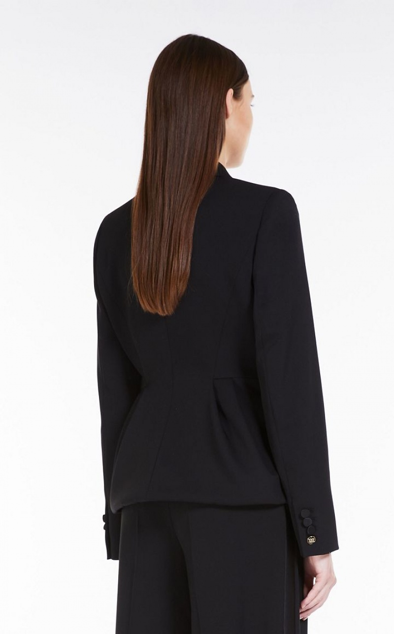 Couture-inspired single-breasted jacket crafted in exquisite stretch wool. Featuring a silhouette with pleats at the back that create volume at the top of the hip, accentuating the waistline. Finished with a shiny satin tone-on-tone large lapel collar and matching covered buttons on the cuffs with an enamelled Monogram button. One-button closure. Length: 60 cm.