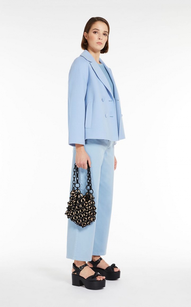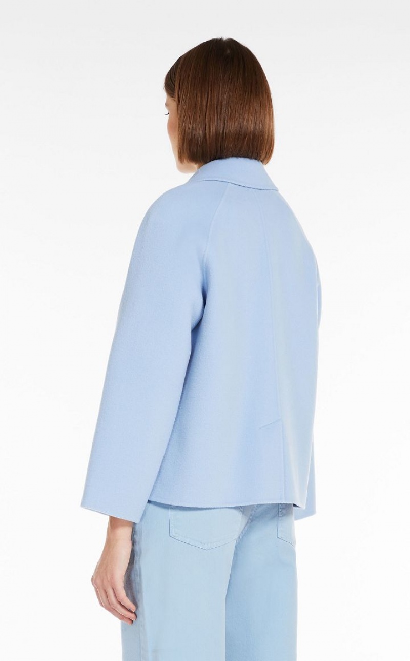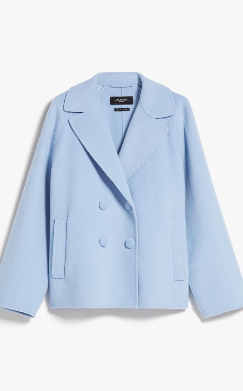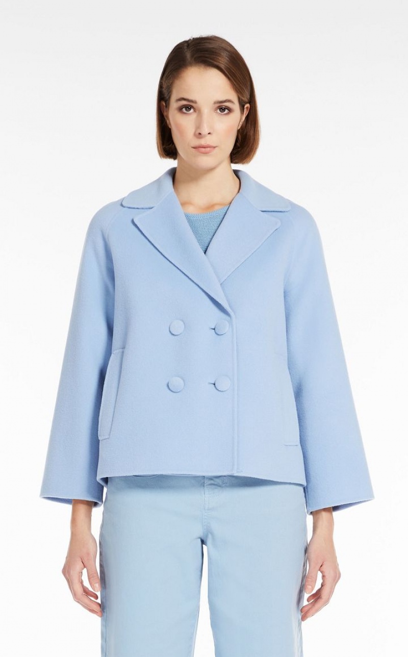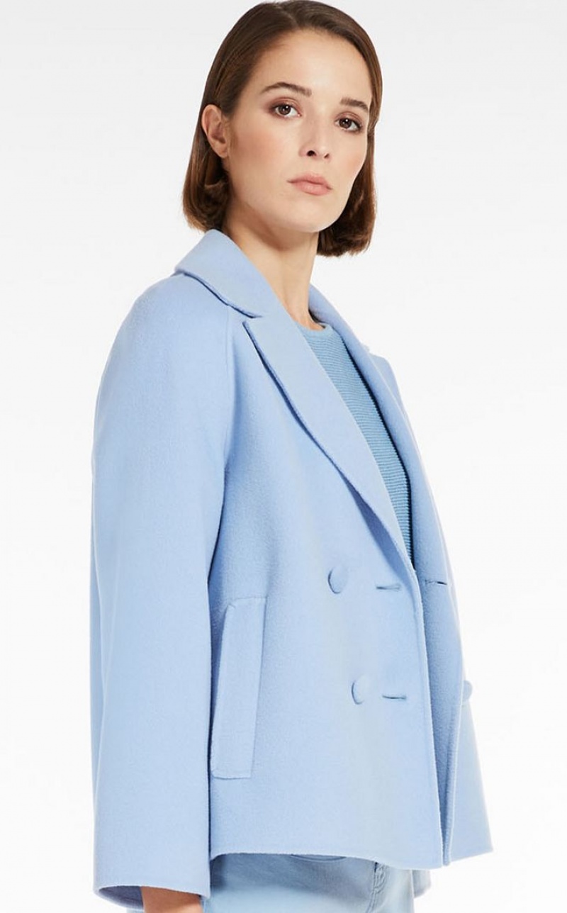 Double-breasted jacket with a bon ton influence in luxe hand-sewn double-layer wool fabric. Lined style, with lapel collar, raglan sleeves and slanted pockets on the front. Fastening with matching buttons.