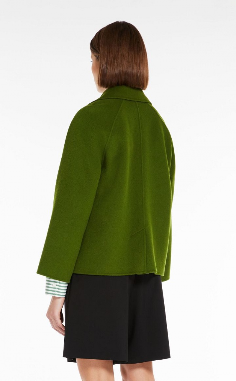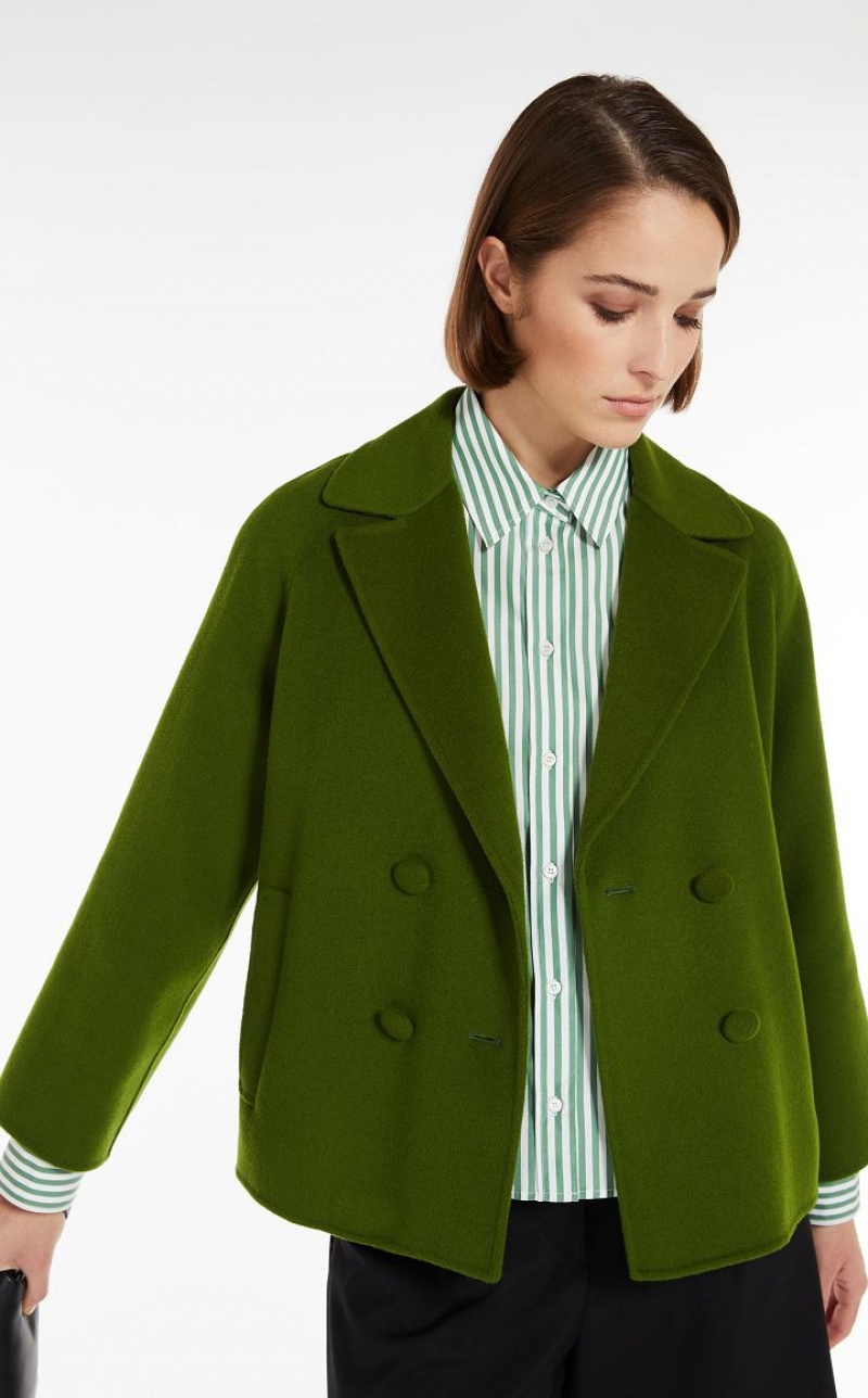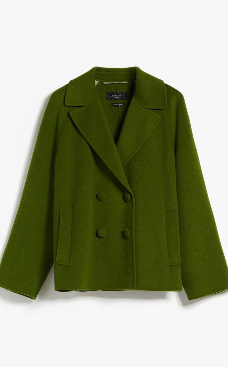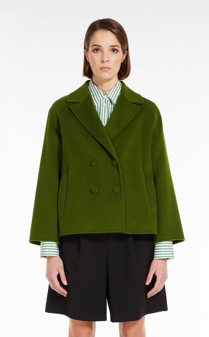 Double-breasted jacket with a bon ton influence in luxe hand-sewn double-layer wool fabric. Lined style, with lapel collar, raglan sleeves and slanted pockets on the front. Fastening with matching buttons.
