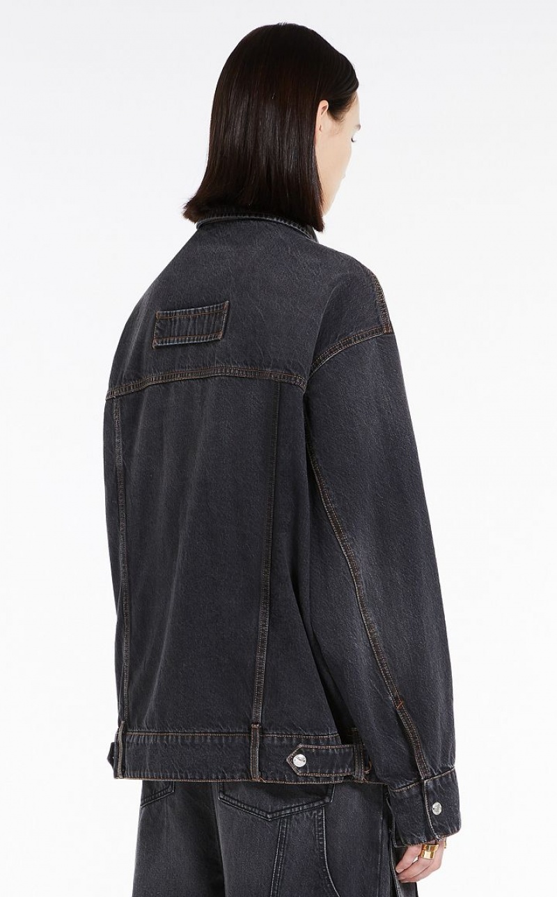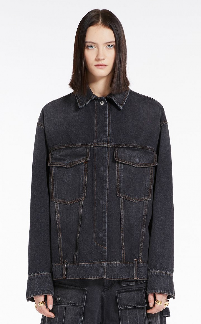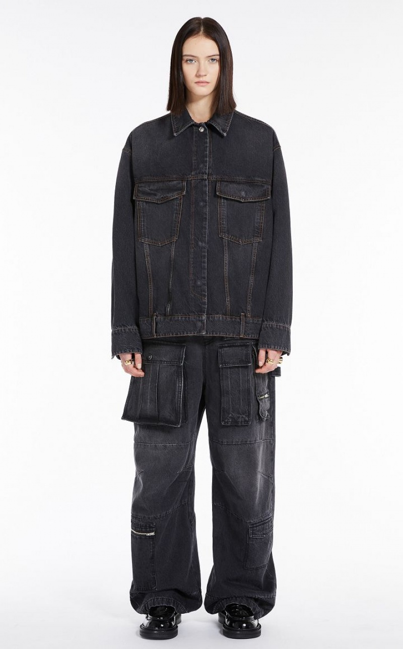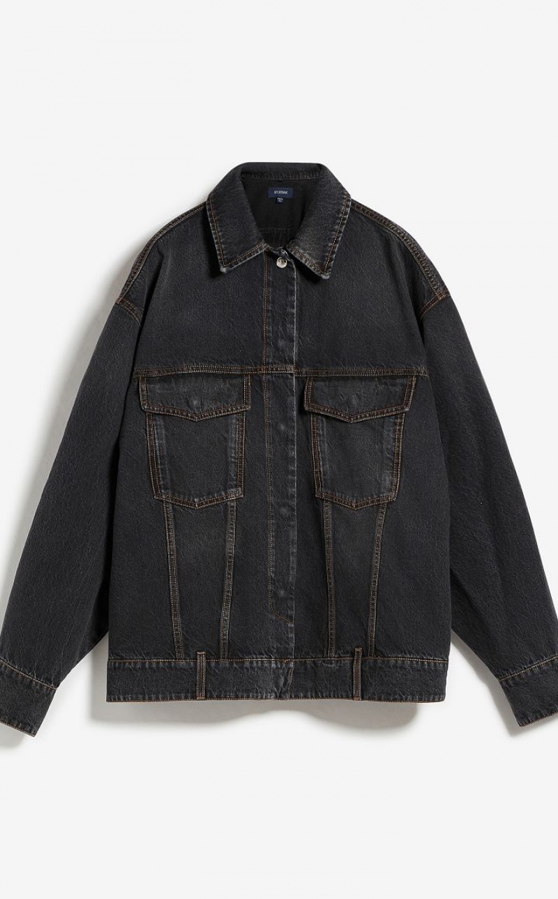 Oversize jacket made of black-black denim, garment washed for a used-effect. The seaming and construction are emphasised by contrasting tobacco-colour stitching. The style is completed by pockets with shaped flap on the chest, waistband with belt loops at the waist, back yoke and snap-buttons.