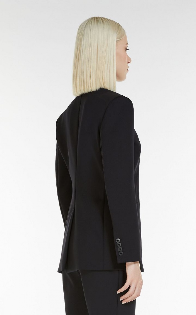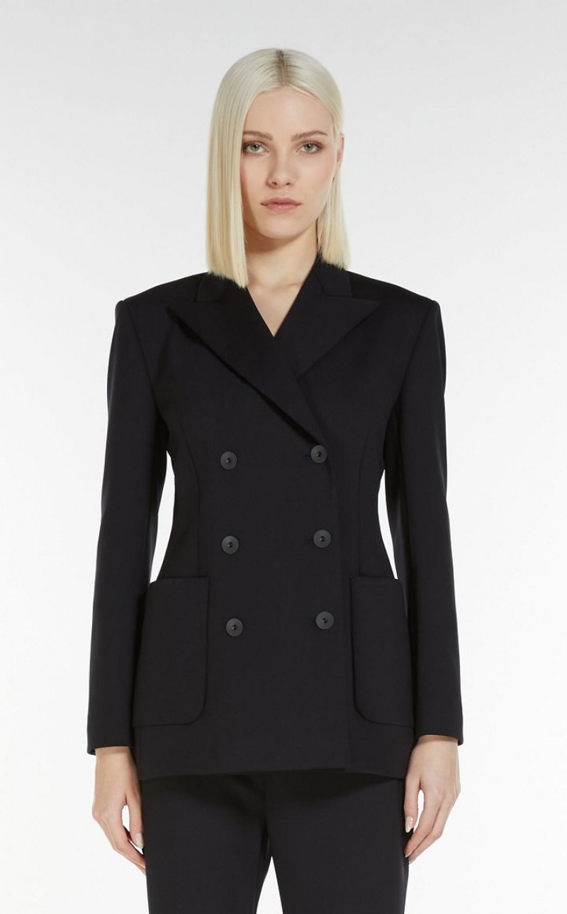 Double-breasted jacket in scuba jersey with peak lapel collar, long sleeves and patch pockets on the front. Shaped-waist fit, matching button fastening on the front. Length: 72 cm.