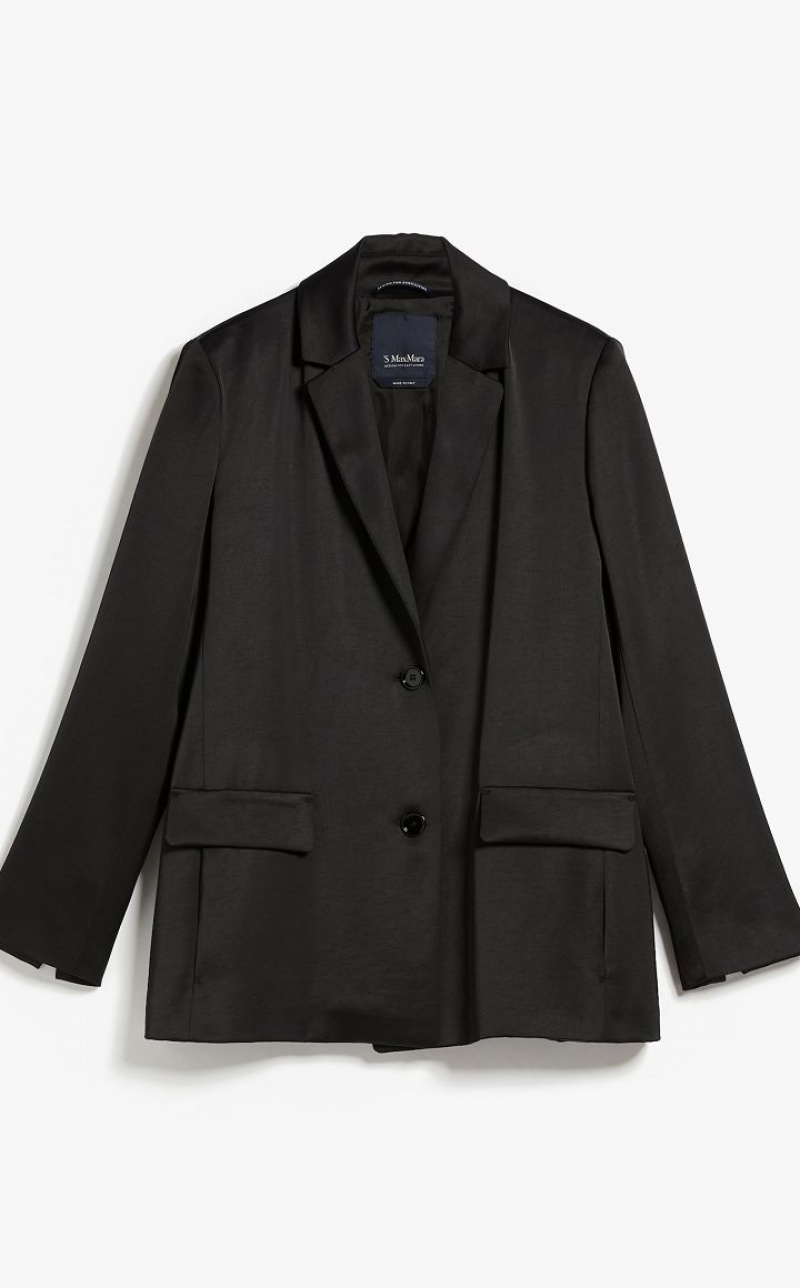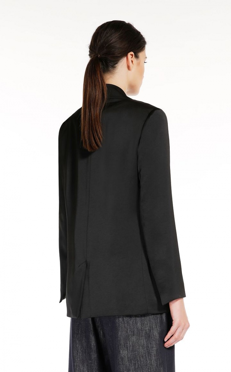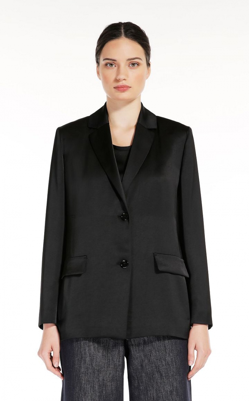 Single-breasted jacket in viscose-blend satin fabric featuring a lapel collar, long set-in sleeves and front flap-adorned side pockets. Lined model. Two-button fastening. Length: 70 cm.