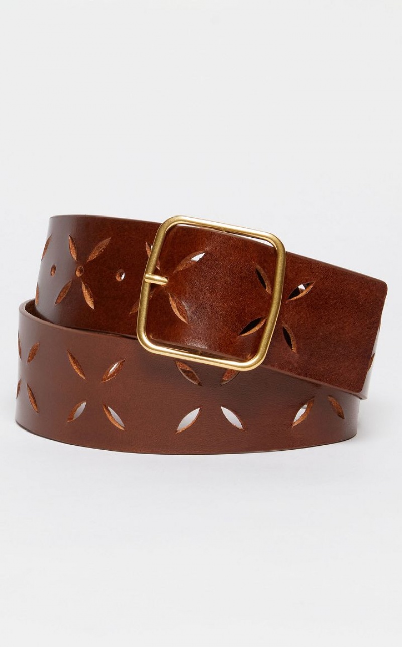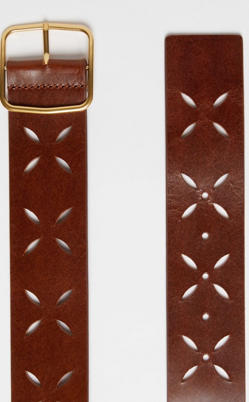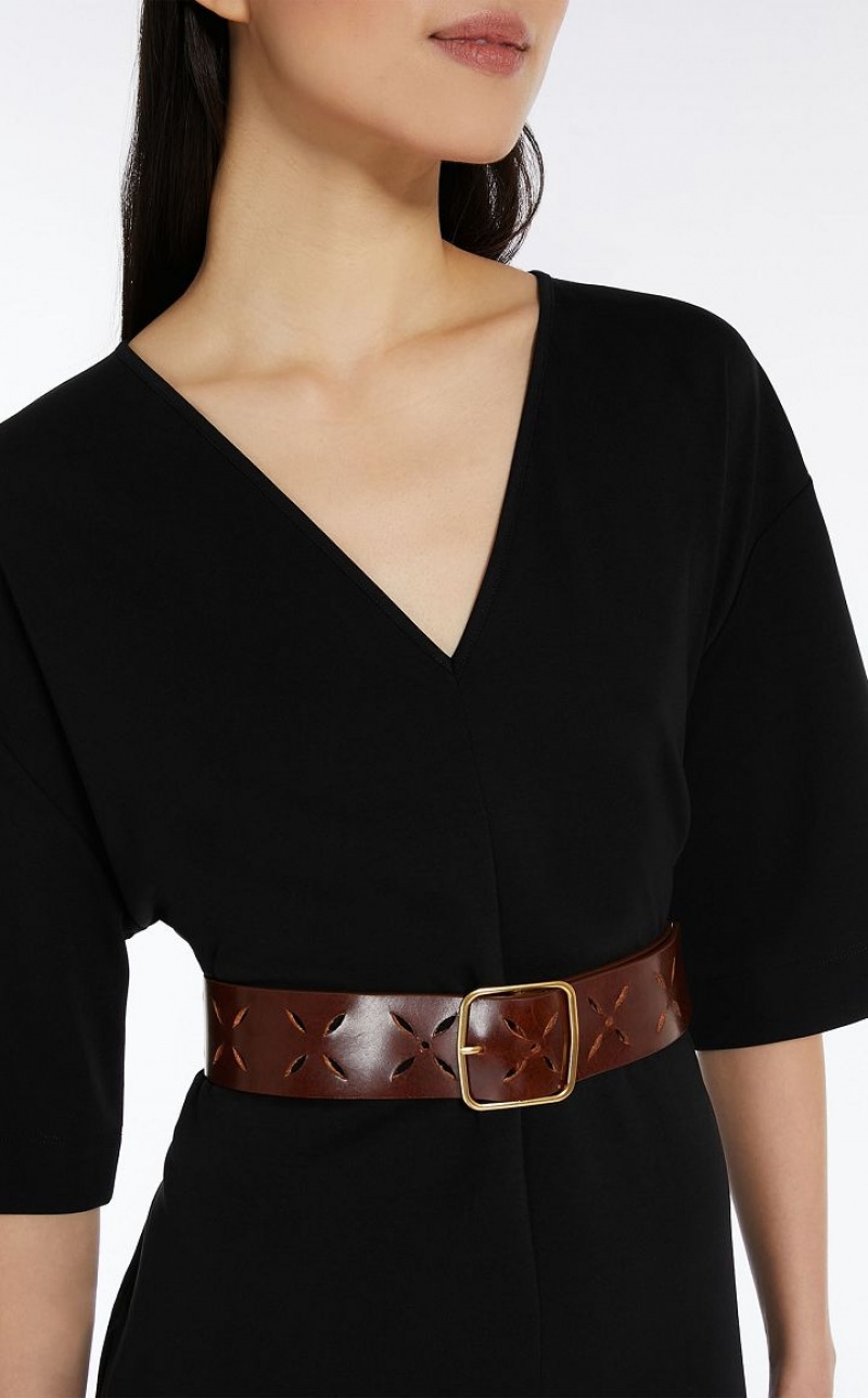 Leather belt decorated with laser cut motif down its entire length. Geometric metal tongue buckle. Width 5 cm. The accessory is delivered with fabric dust bag bearing the Weekend Max Mara logo.