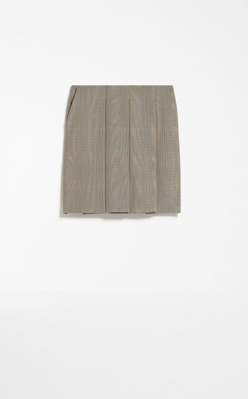 Low-waisted mini skirt made in macro check fabric. The front features large ironed pleats, with slanted side pockets, while the back has two tailored-style welt pockets.
