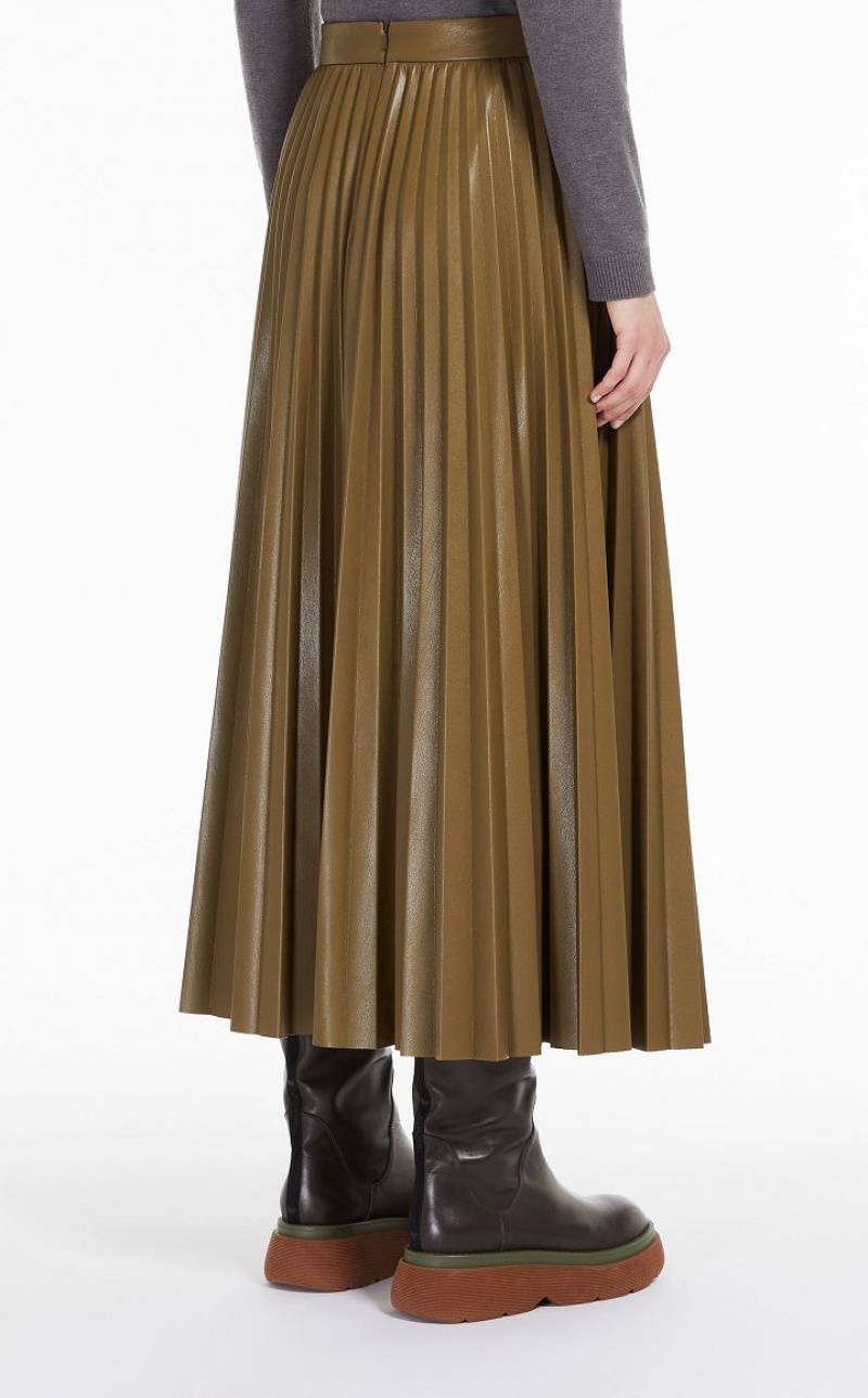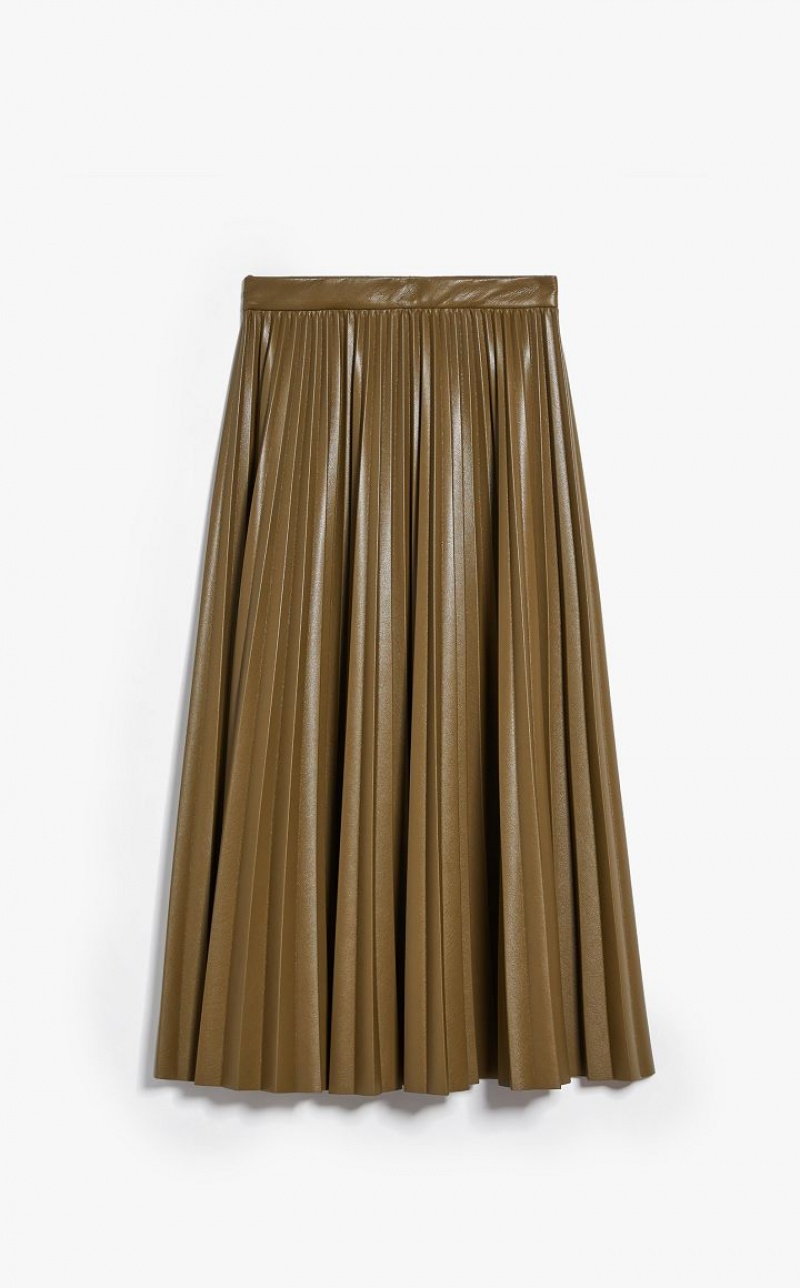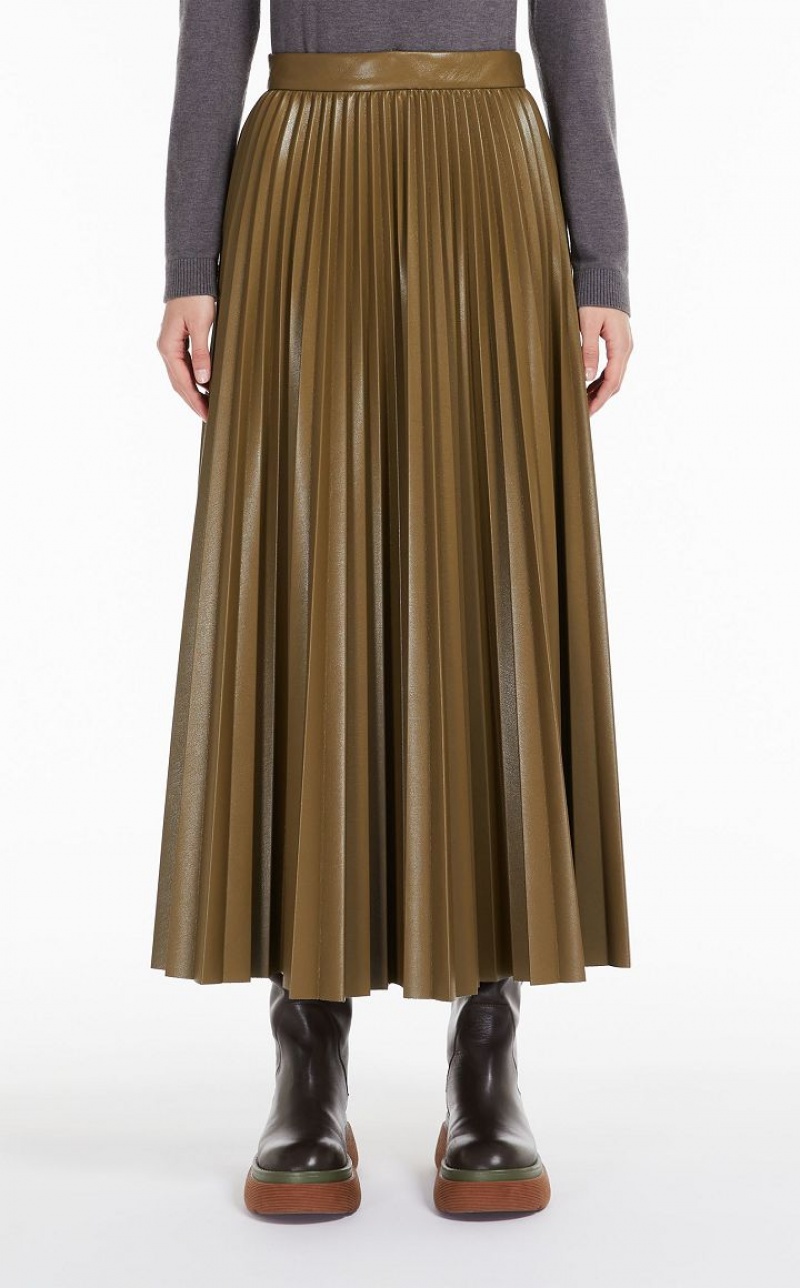 Coated jersey skirt featuring a fabric waistband and side zip fastening. Movement bestowing full length pleated detail. Length: 90 cm.
