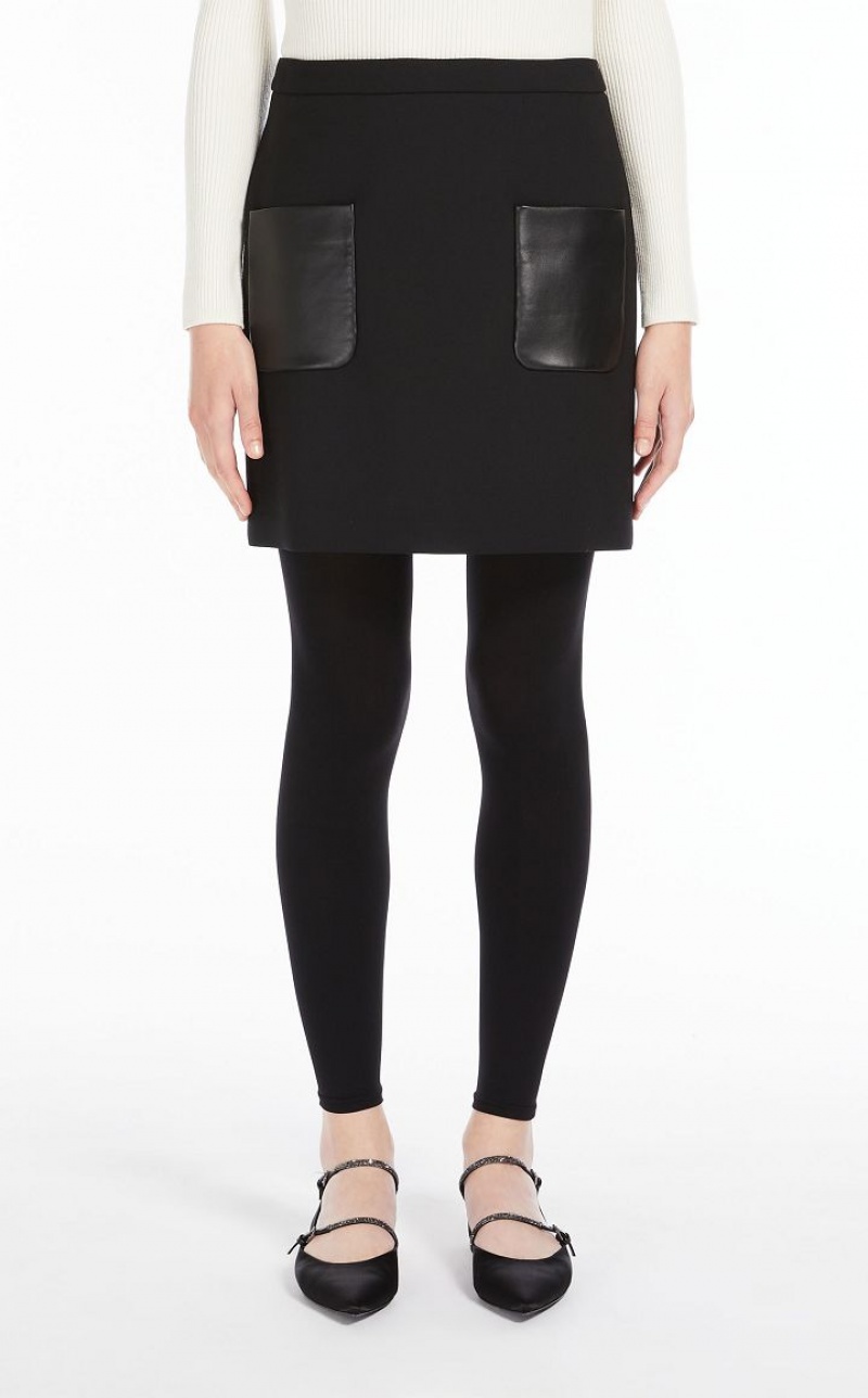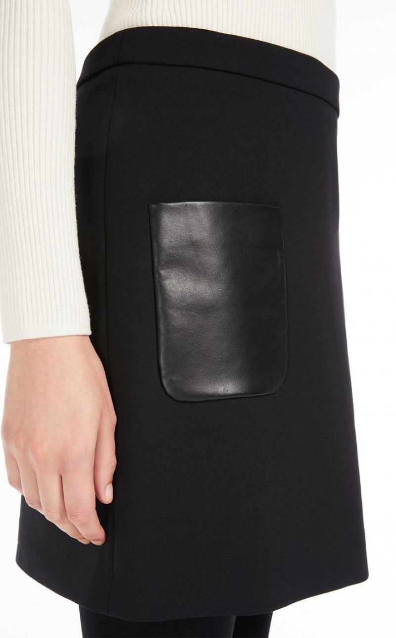 Short skirt in soft double pure wool crêpe with a straight silhouette and large leather patch pockets on the front. Lined style with back zip fastening. Length: 45 cm