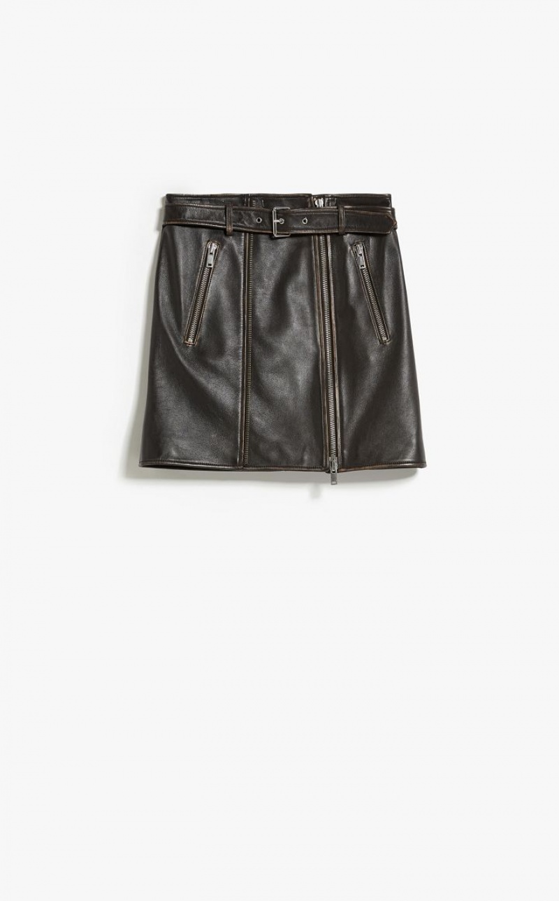 Mini skirt in soft leather, with prominent stitching treated to give the garment a stylish, aged look. Unlined style featuring biker-style details: exposed metal zips in the vertical seams and the pockets. Matching belt at the waist with metal buckle and eyelets. Front fastening with asymmetrical full-length zip.