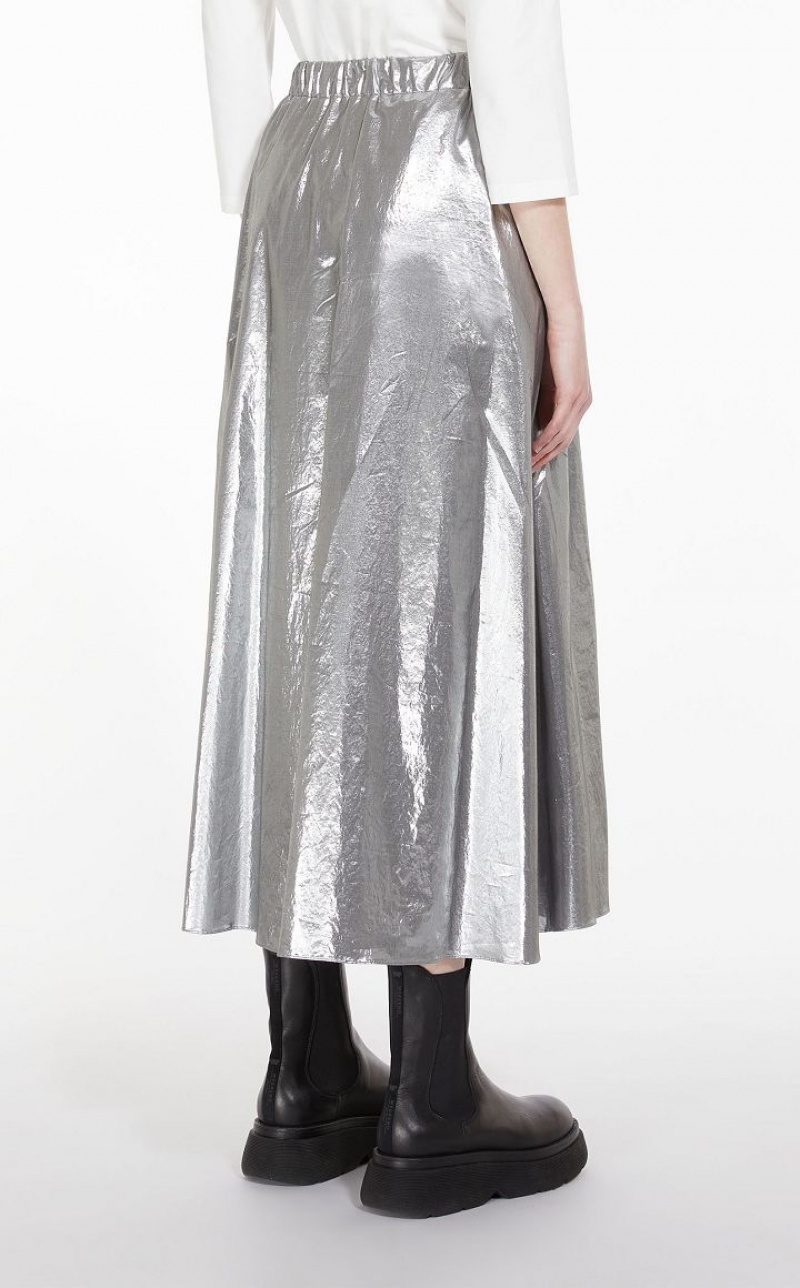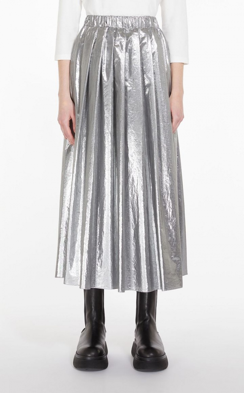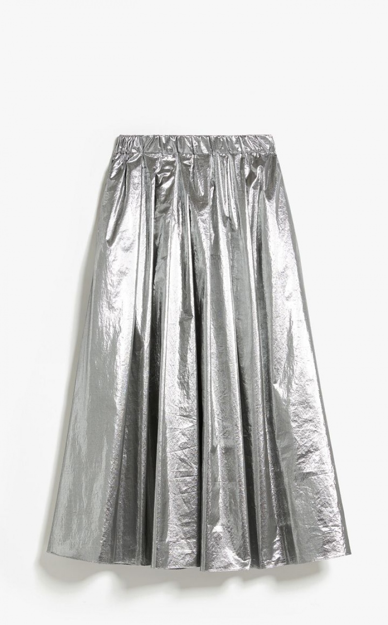 Long skirt in luxe taffeta, embellished with a subtle metallic yarn that adds sheen to the garment. The fullness of this style is highlighted by a bold pleated motif which gives the garment movement. Lined style, with elasticated waist and side pockets. Side fastening with zip. Length: 90 cm.