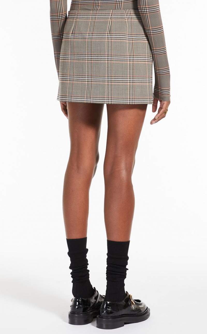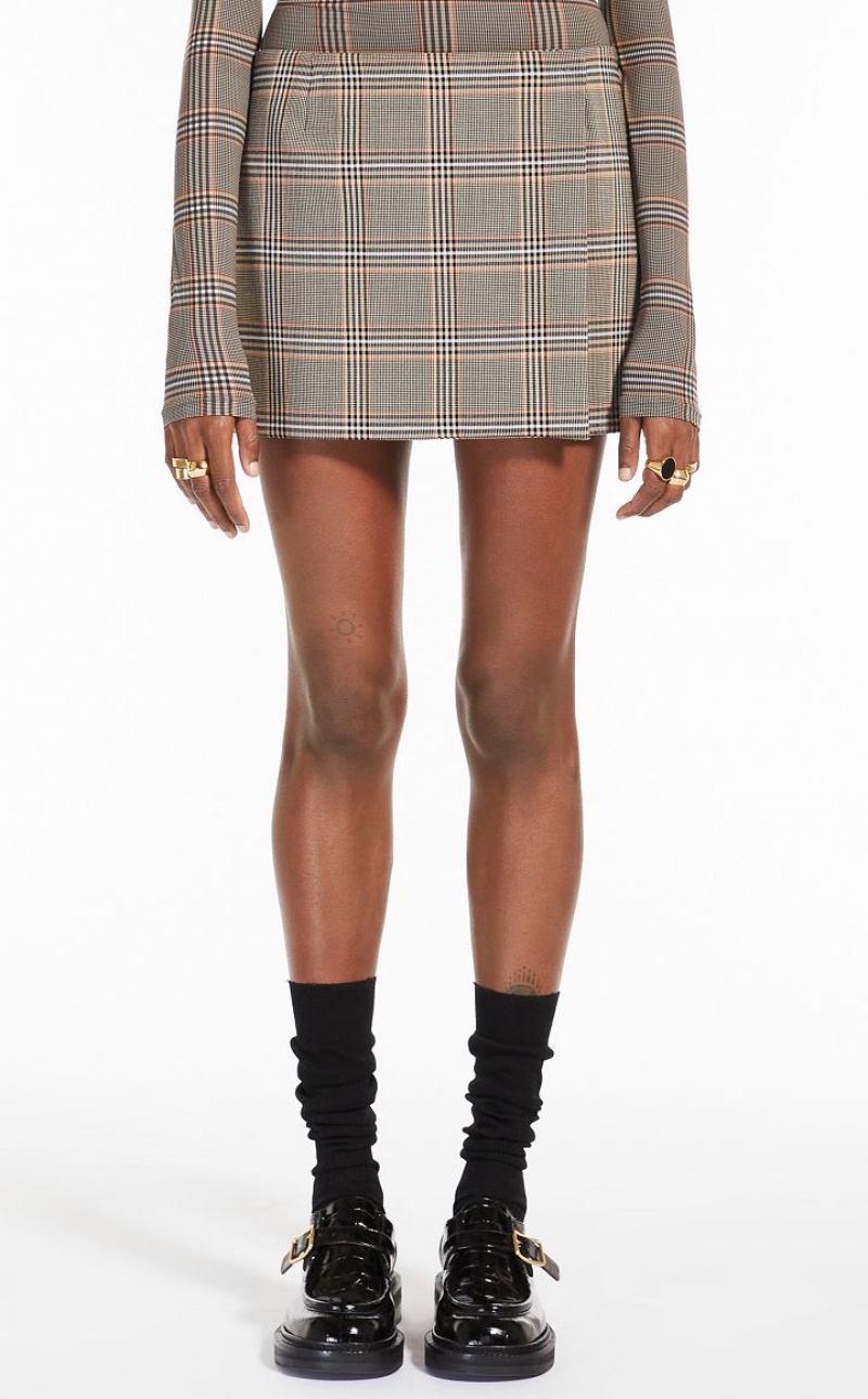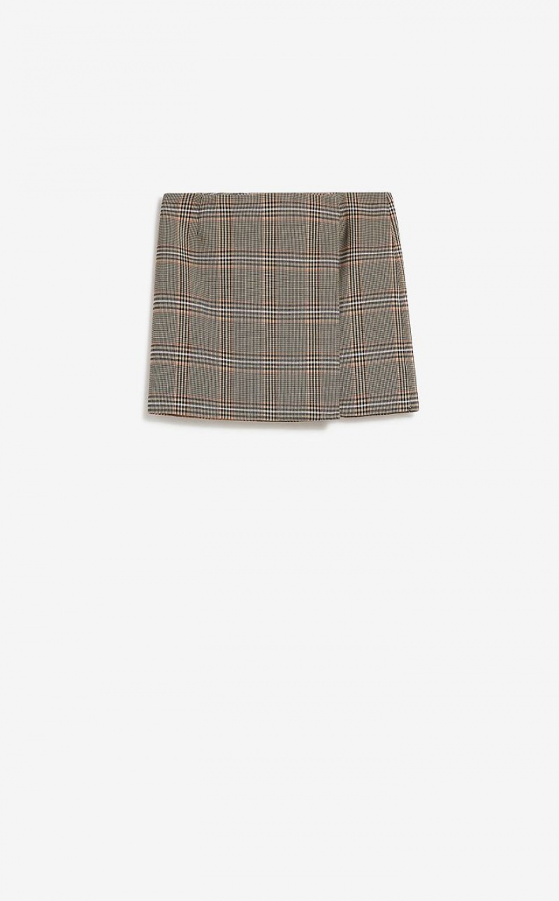 Low-waisted wrap-around mini skirt with a straight cut. Made of wool-blend fabric with a Prince of Wales check, it closes on the hip with concealed buttons. Unlined, with underside bonded in contrasting-coloured satin.