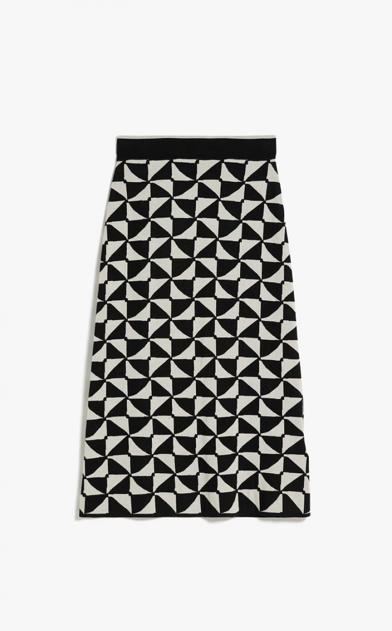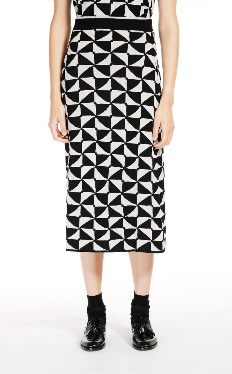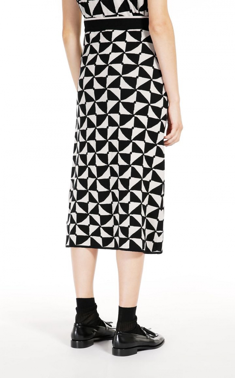 Slightly flared midi skirt in fine pure wool yarn. The model’s elasticated waistband is embellished with an elegant all-over jacquard pattern. Length: 88 cm.