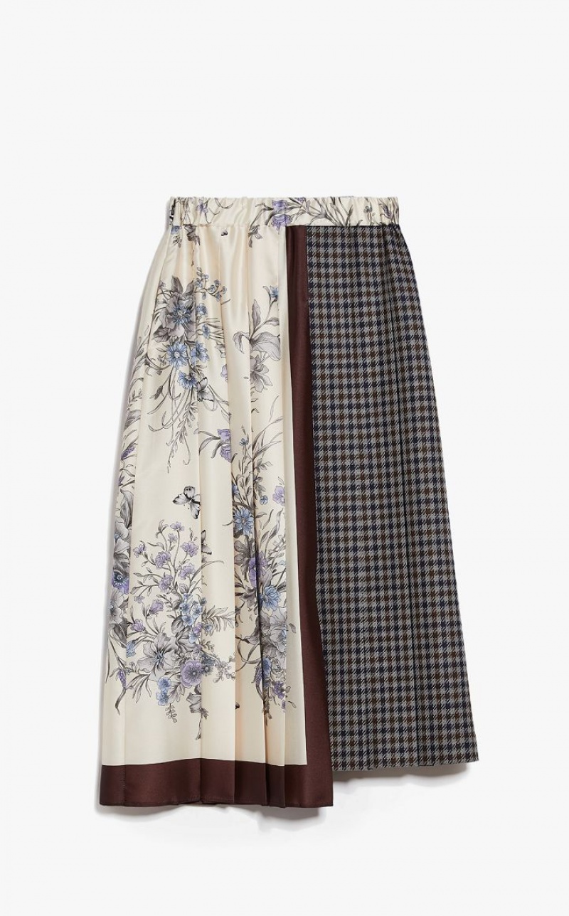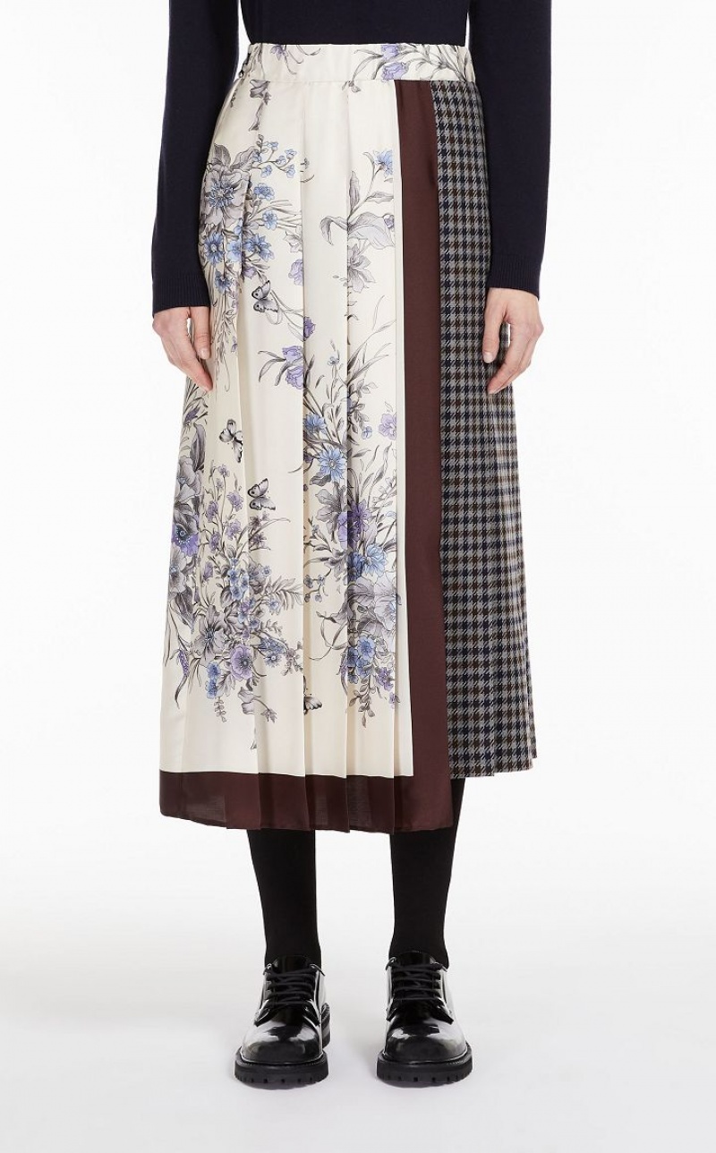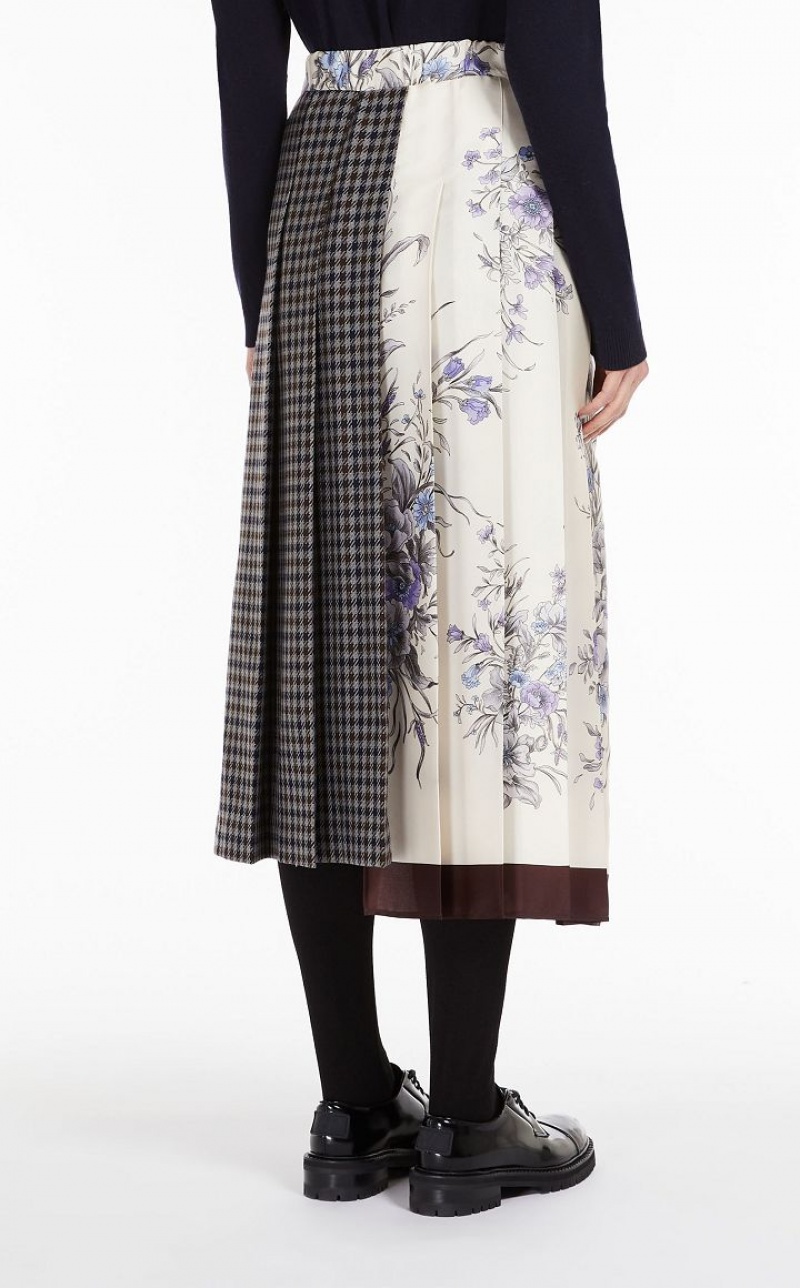 Pleated skirt in wool and cotton basketweave fabric featuring a tweed panel design.